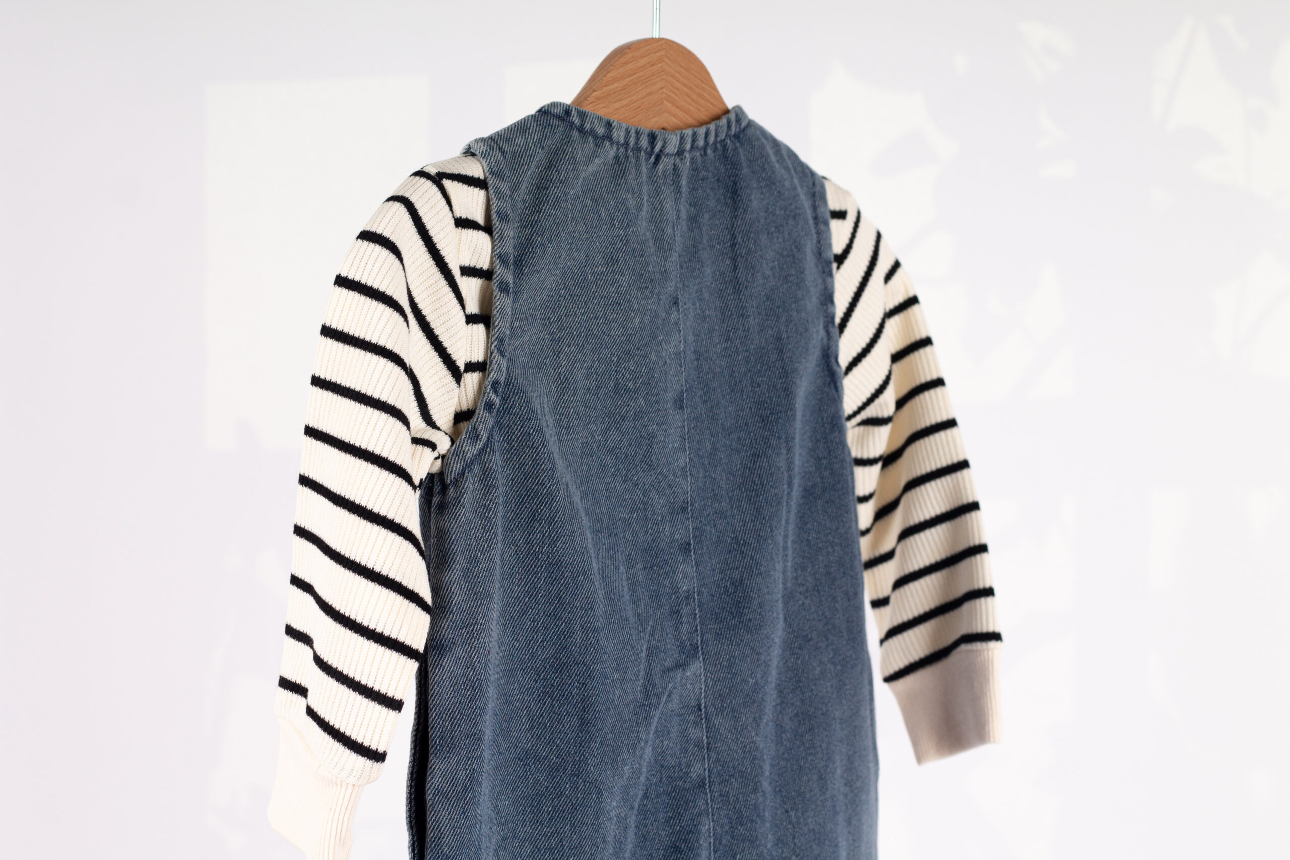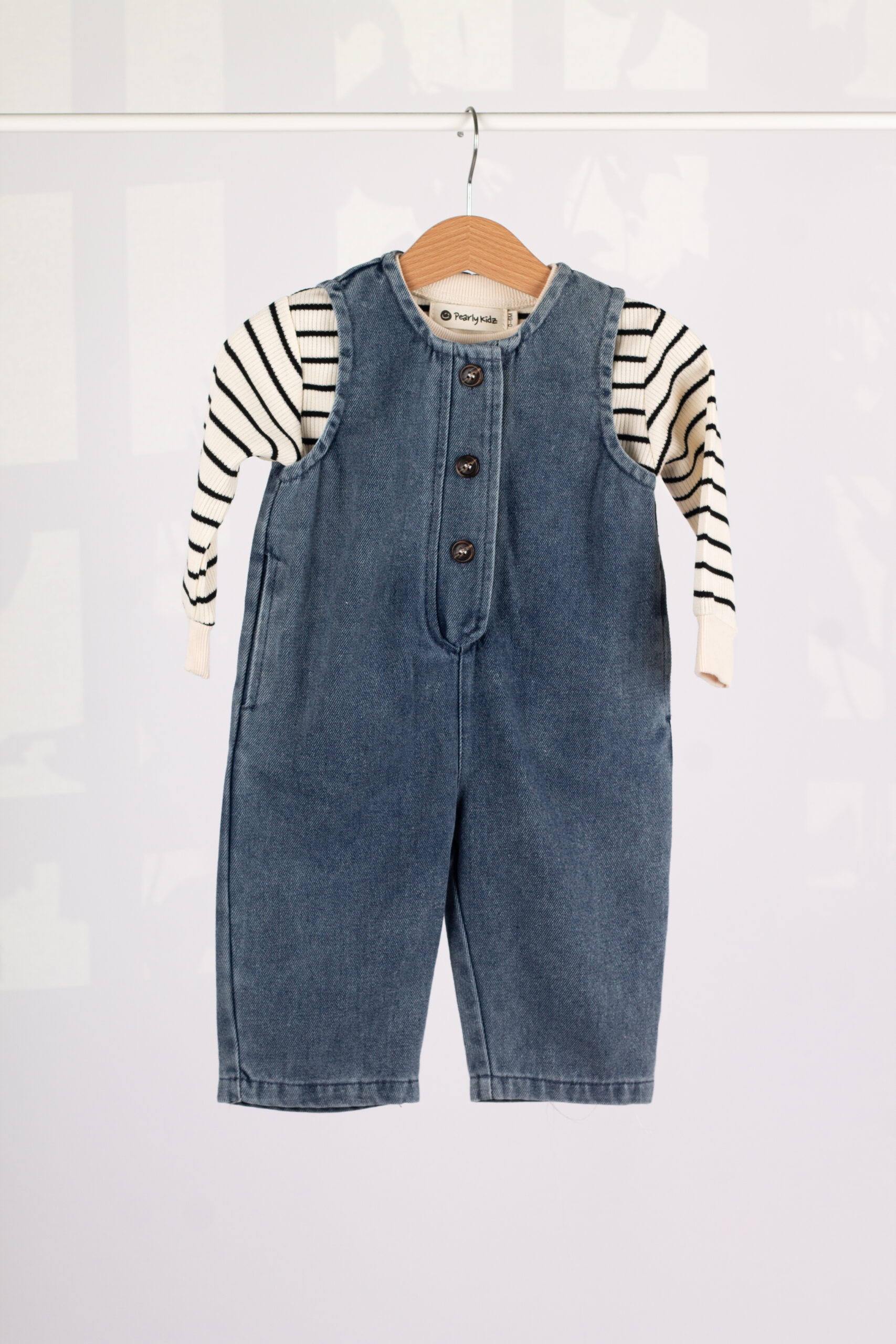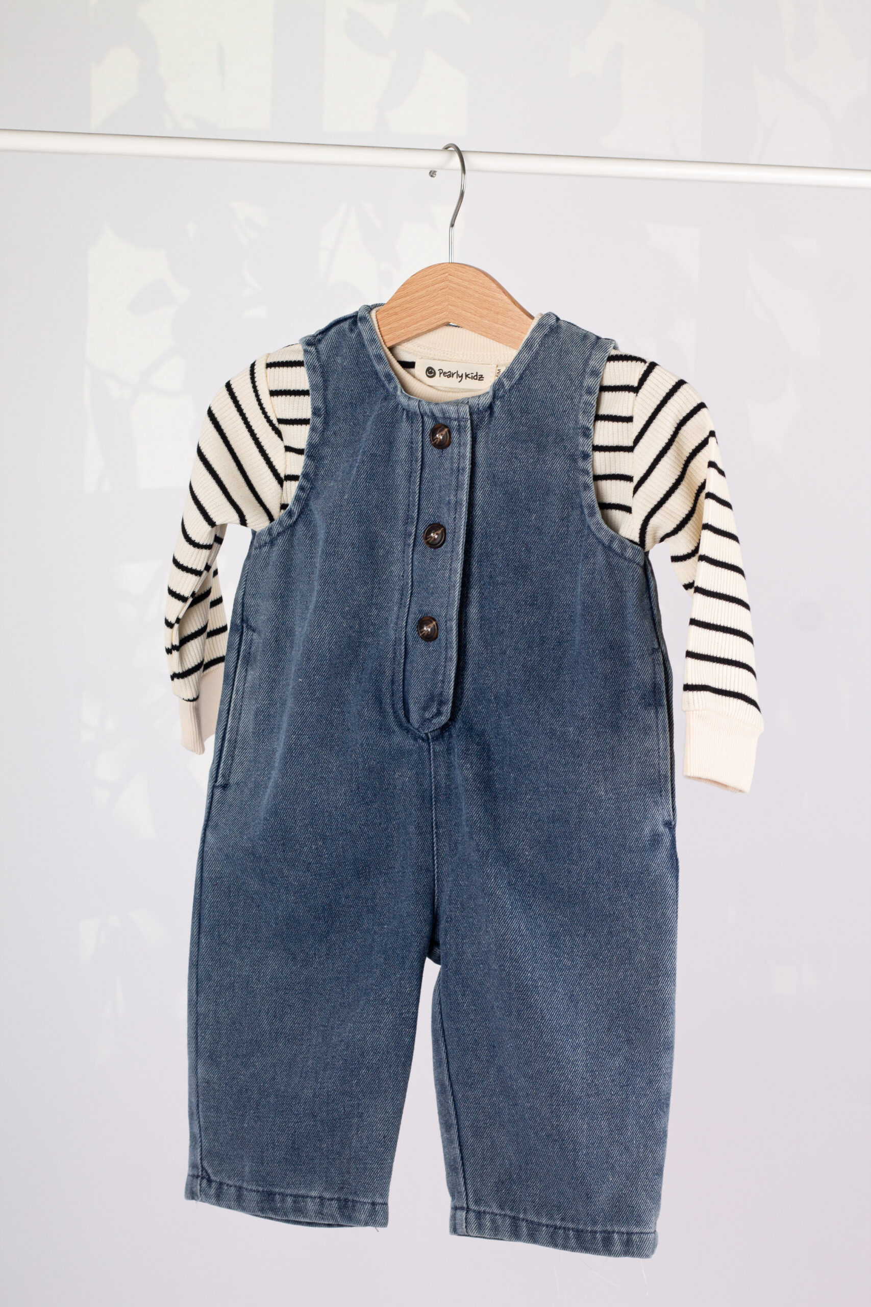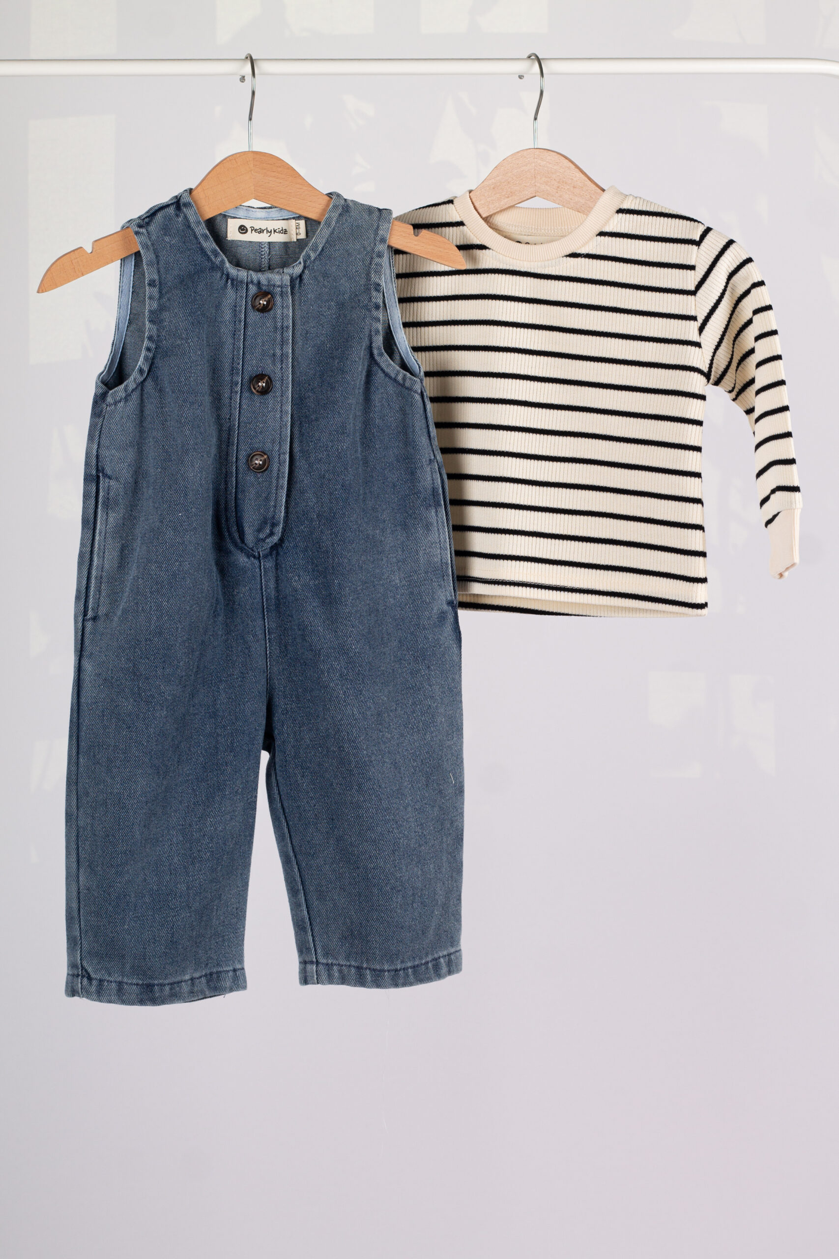 23157 طقم أولادي قطعتين – سالوبيت جينز بدون أكمام + قميص مخطط