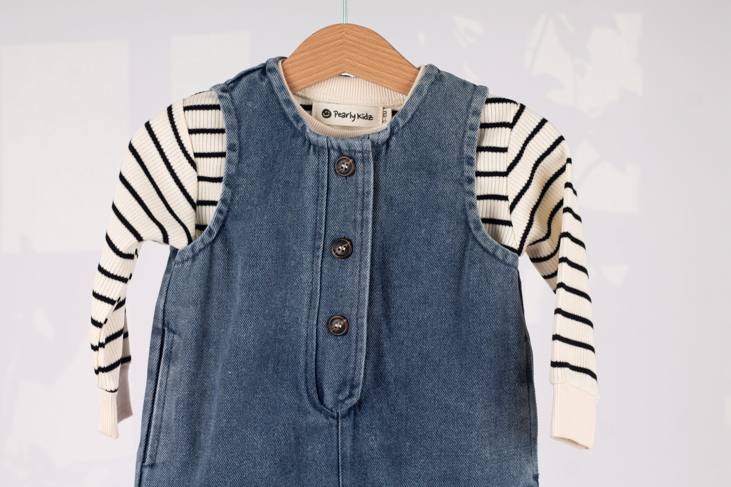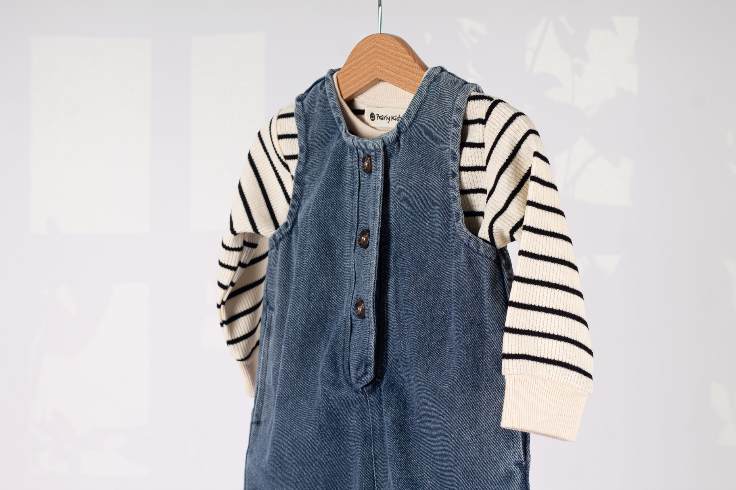 طقم أنيق وعملي لإطلالة يومية مرتّبة، يجمع بين سالوبيت جينز خفيف بتصميم عصري وقميص مخطط كلاسيكي يكمل الستايل بأبسط شكل.