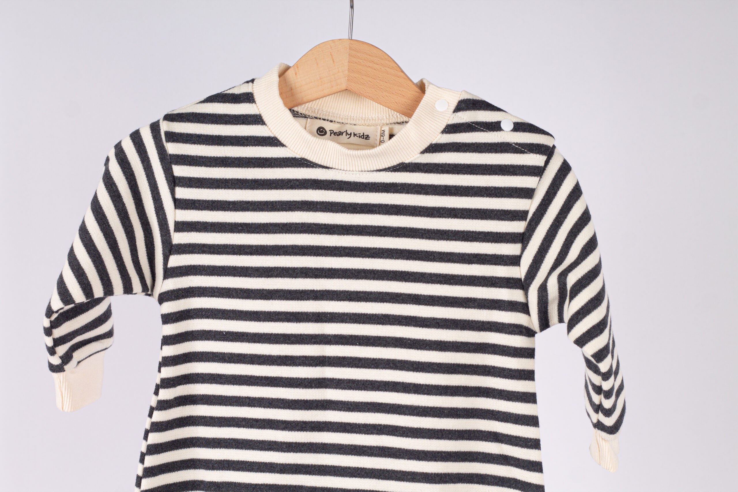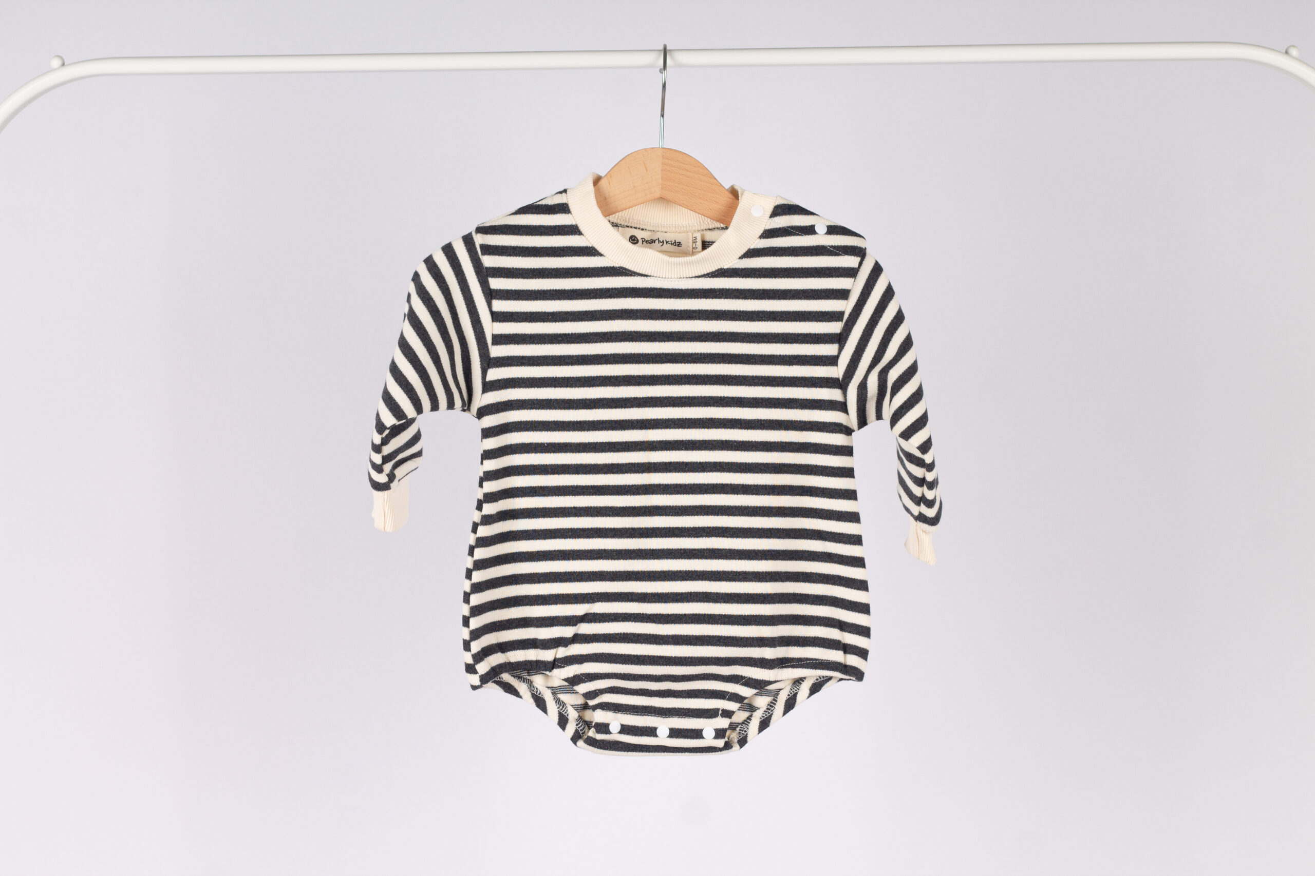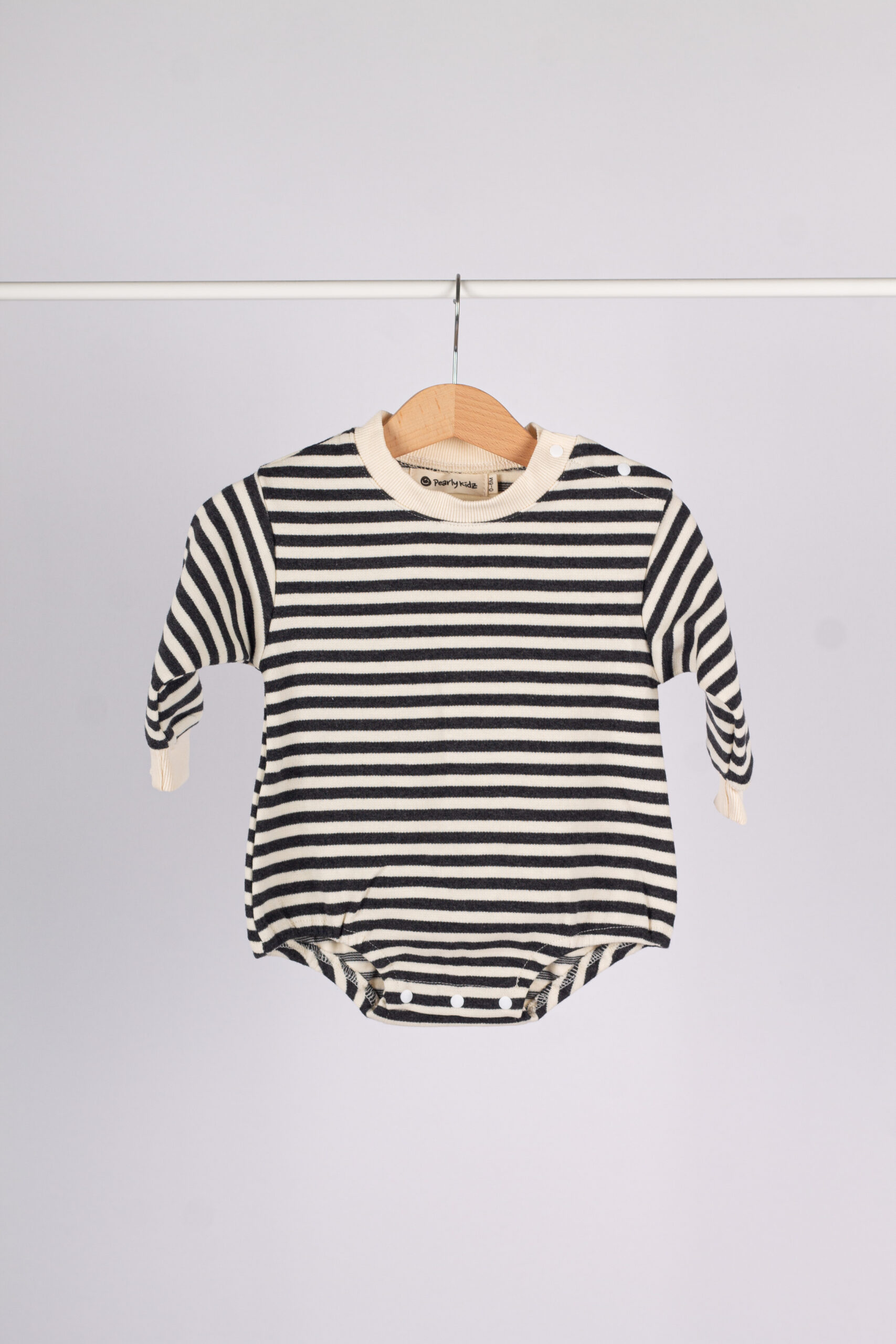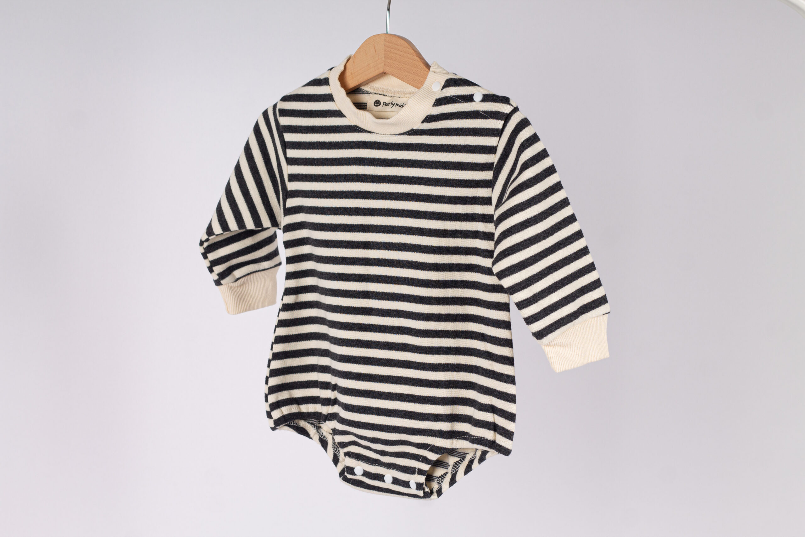 رومبر عملي وناعم بخامة قطنية مريحة جداً على بشرة طفلك. تصميم مخطط كلاسيكي يعطي إطلالة مرتبة وجميلة للّبسة اليومية.