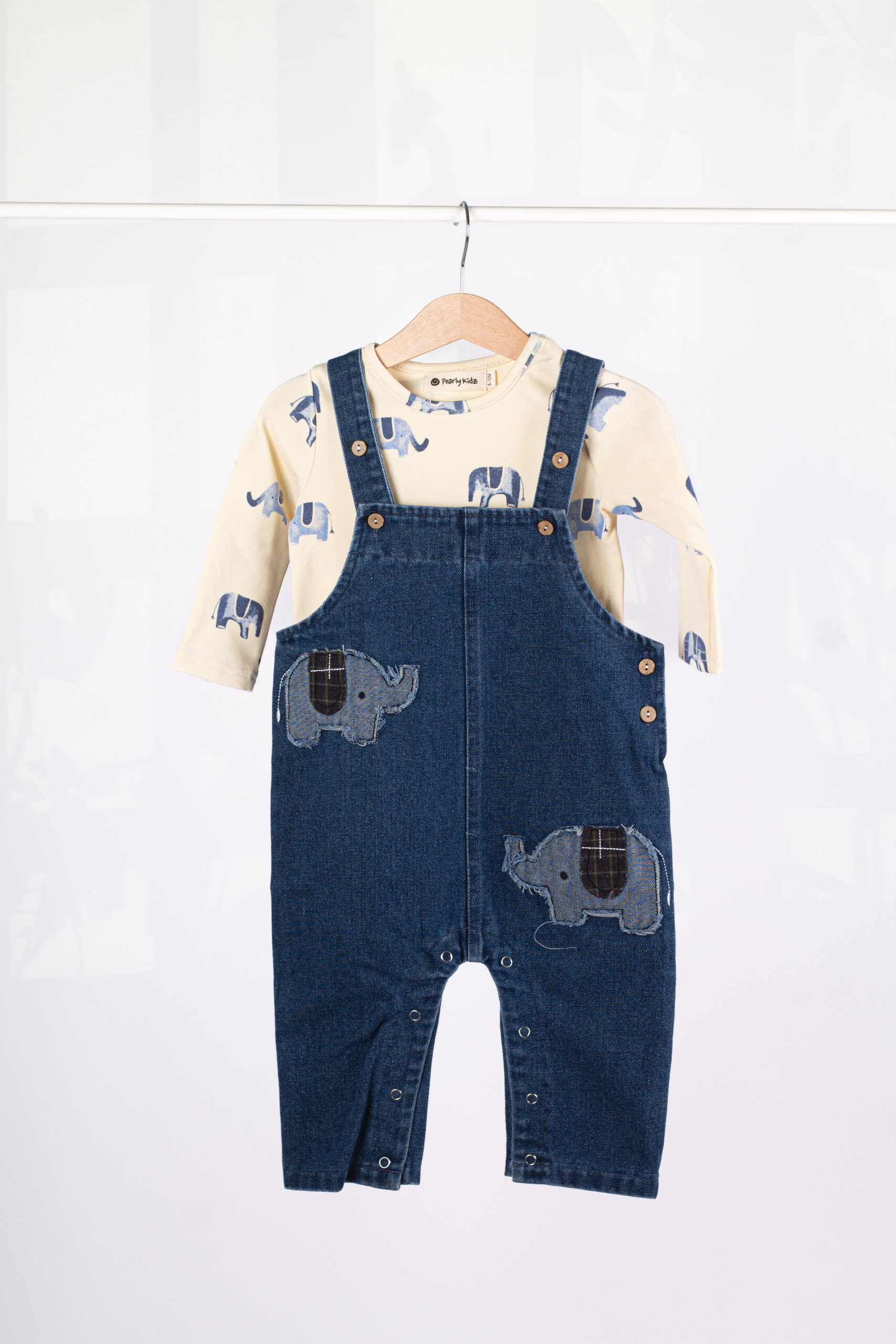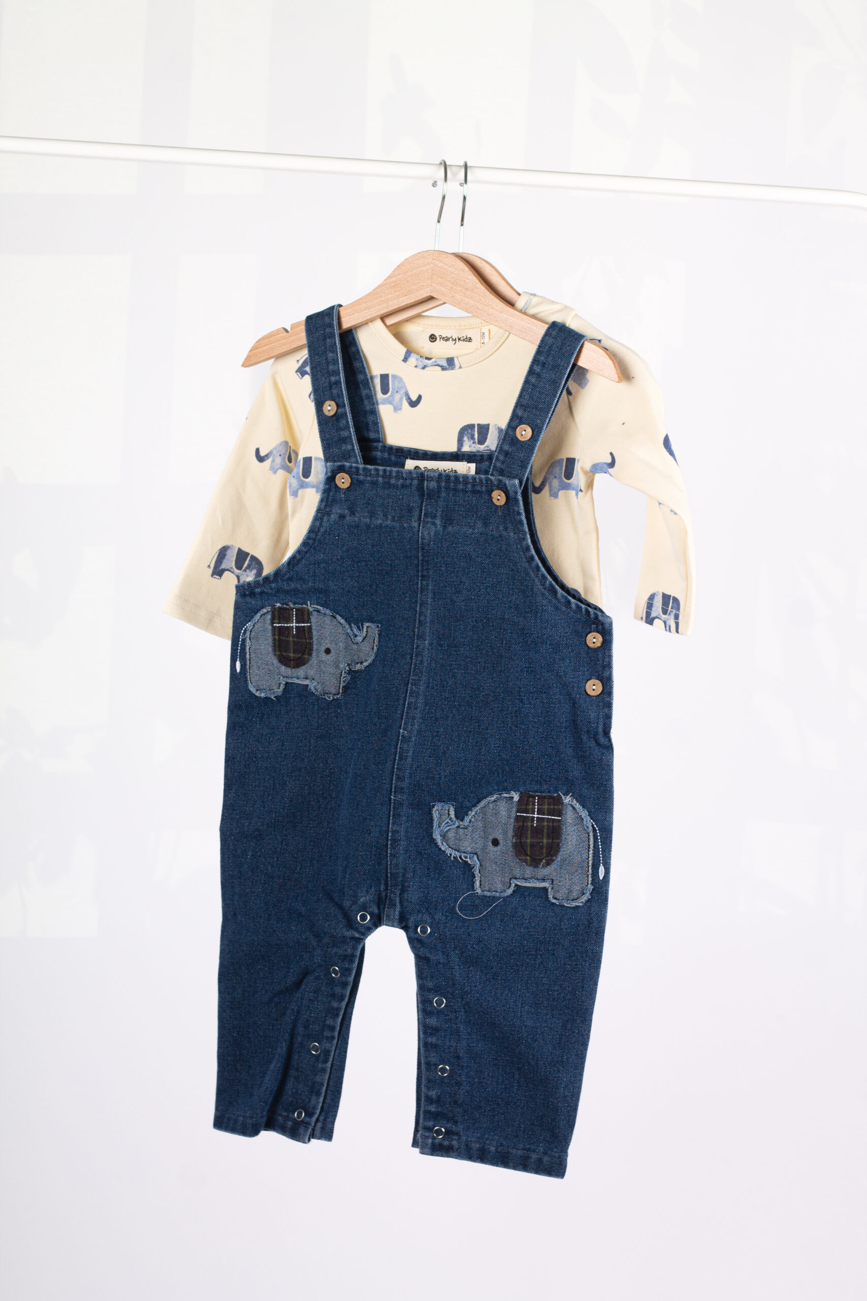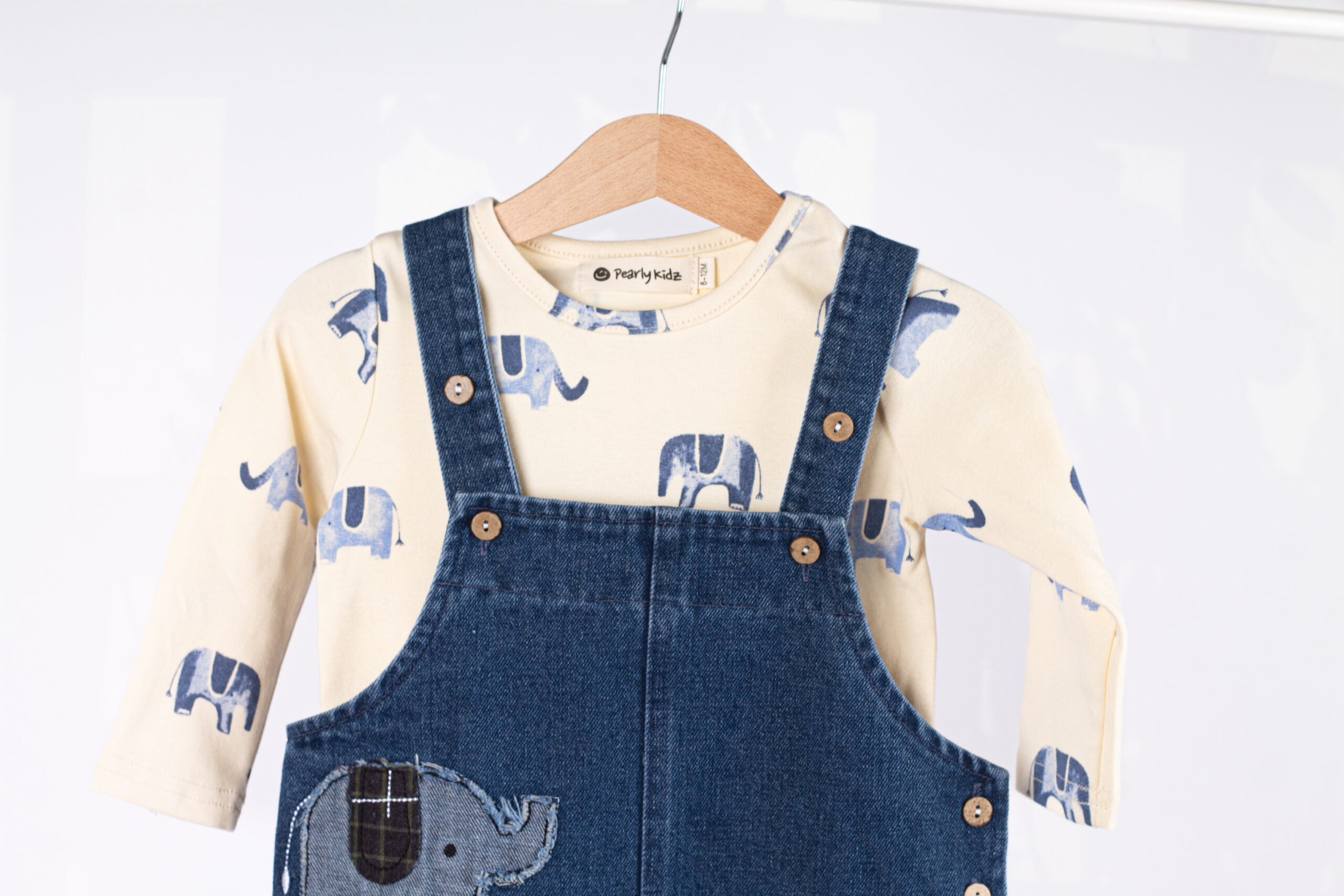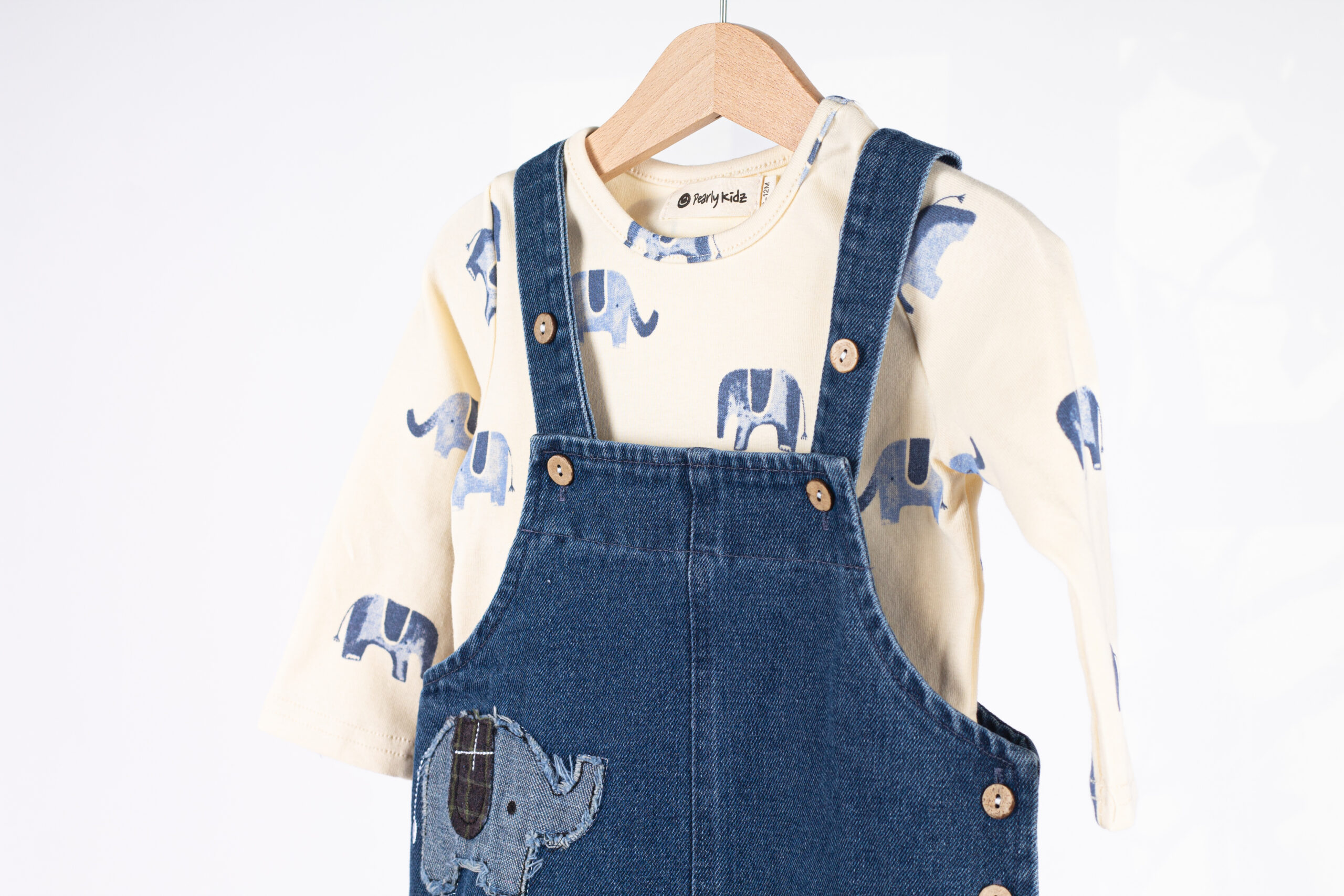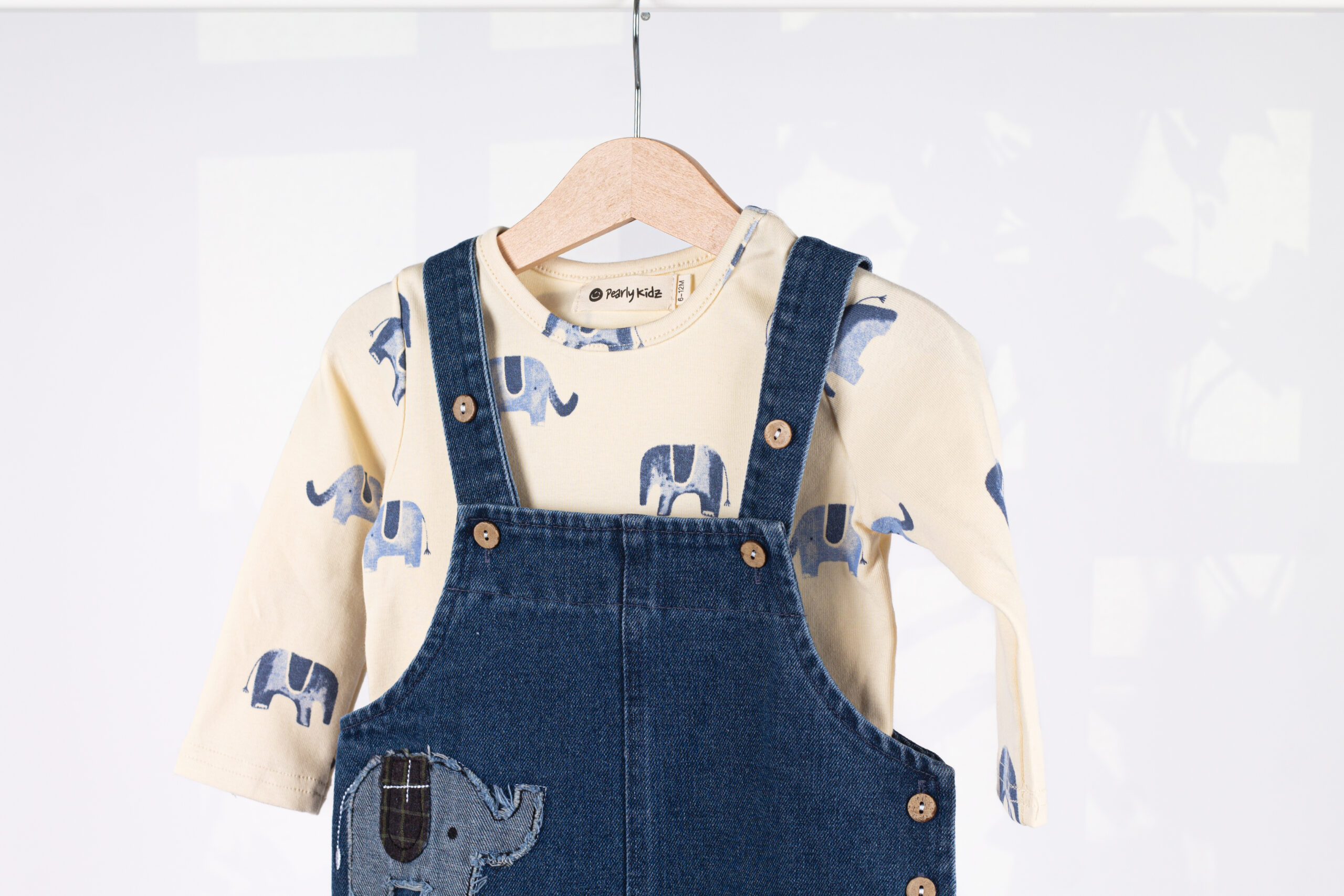 طقم كيوت وعملي بلمسة طفولية محبّبة، مكوّن من سالوبيت جينز خفيف مزين بتطريز فيل لطيف على الجانبين، مع قميص طويل بنقشة فيلة تكمل الإطلالة بشكل مثالي.