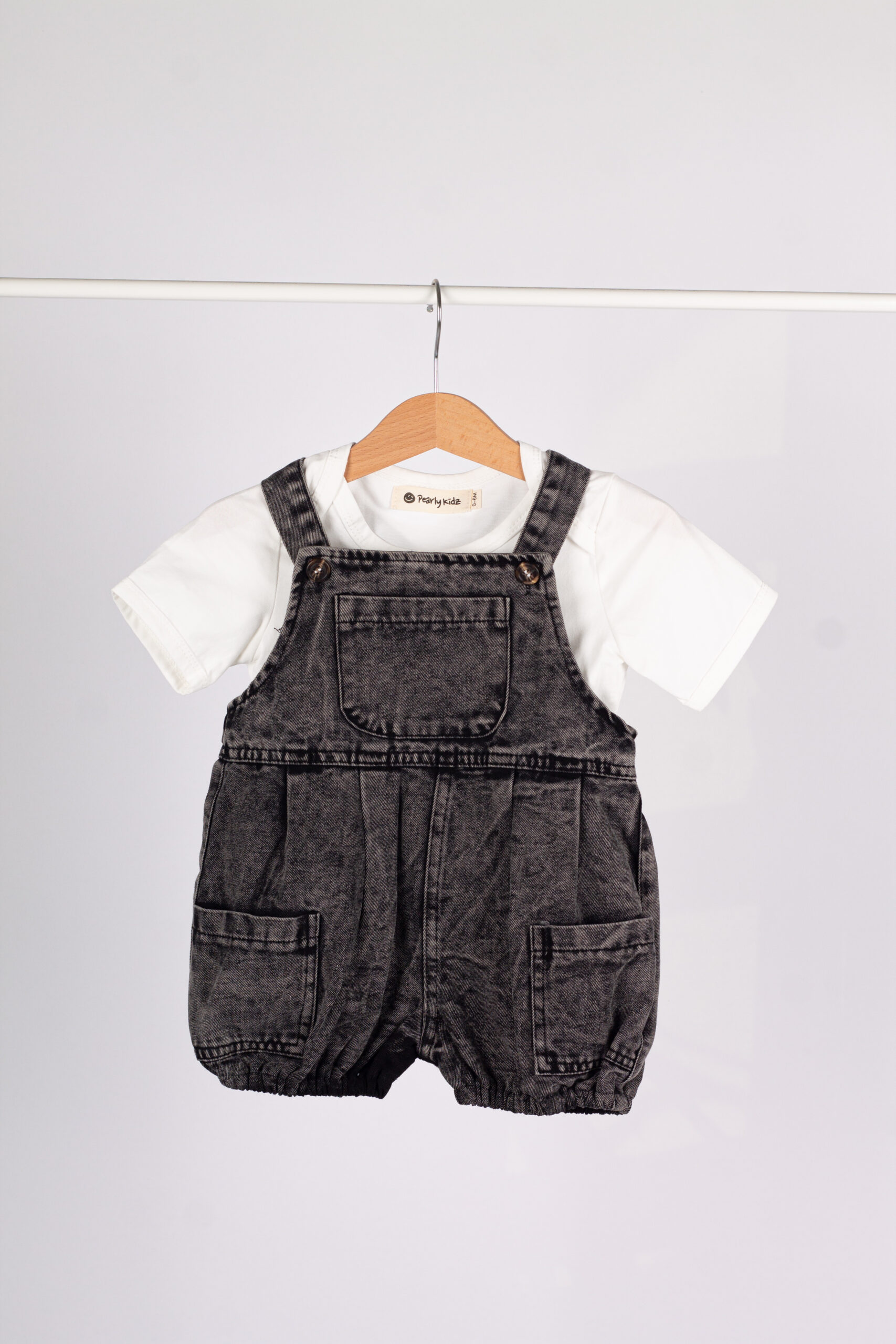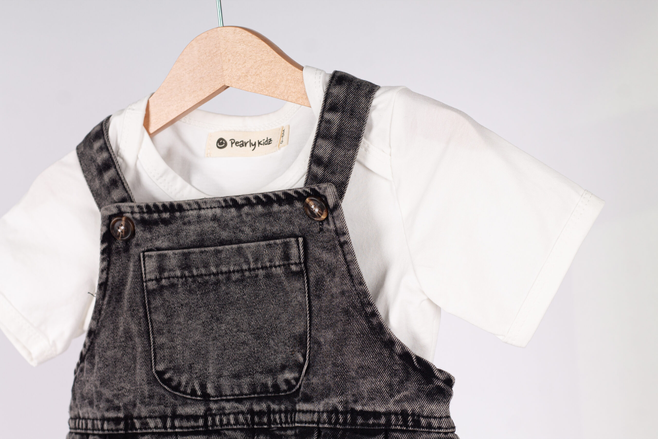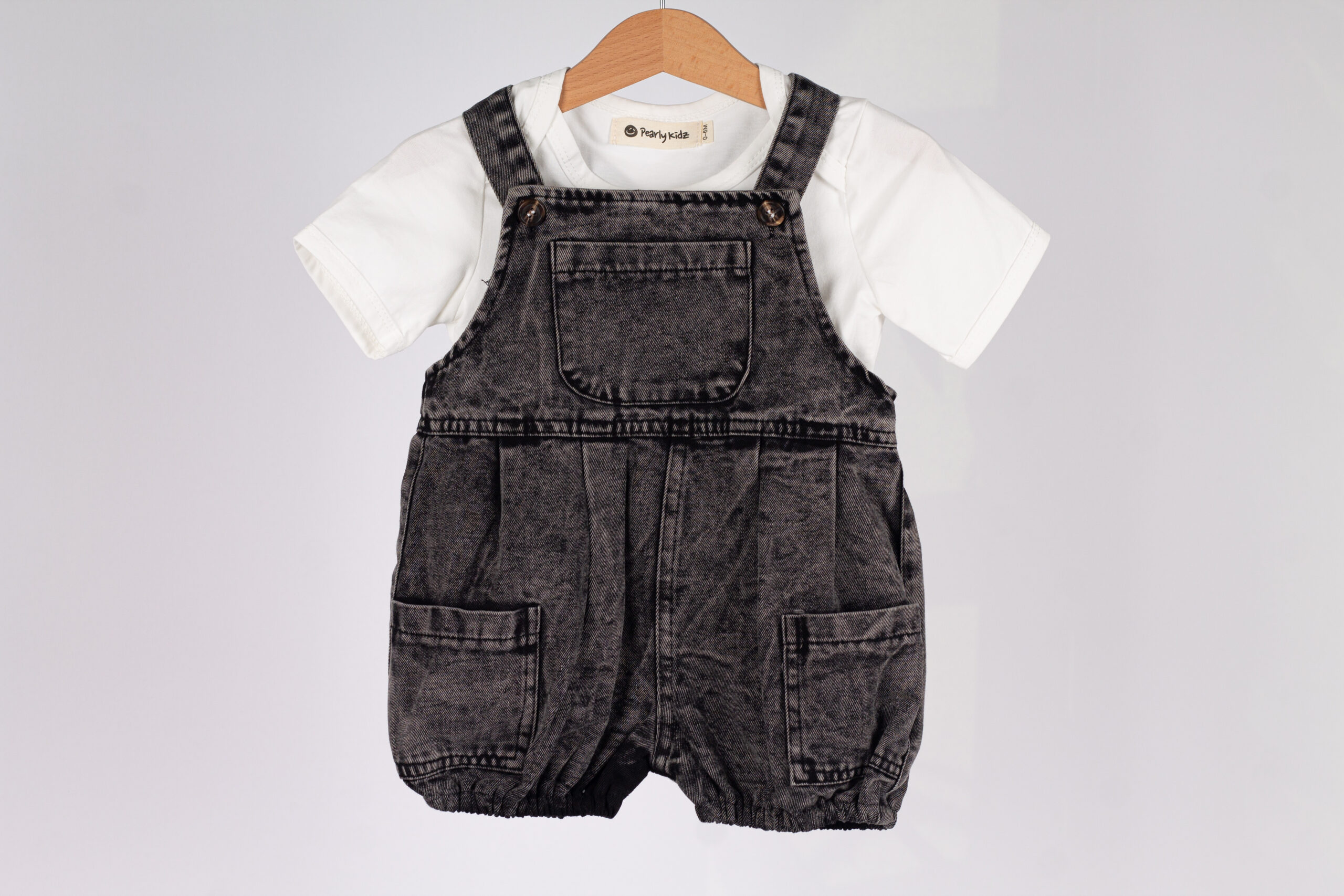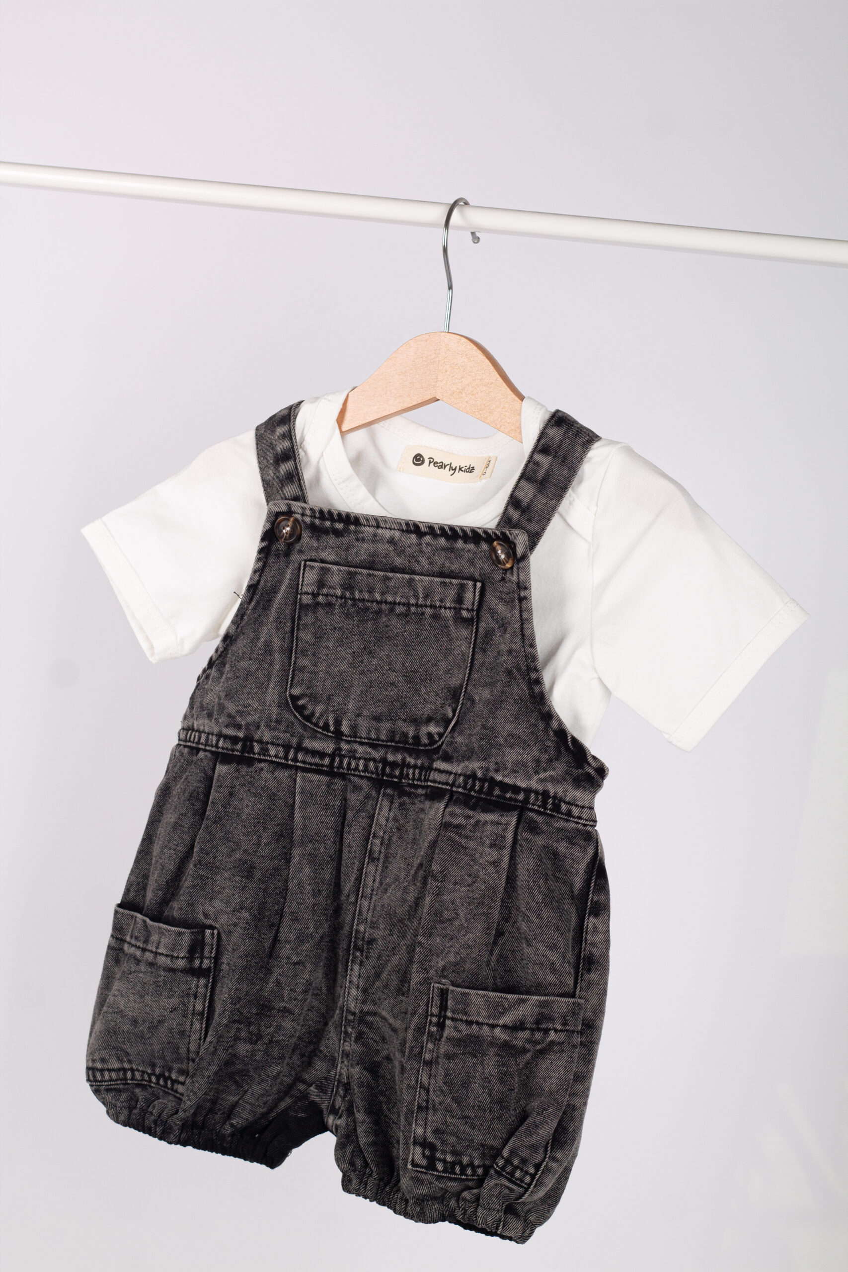 طقم عملي وعصري للأطفال، يجمع بين سالوبيت جينز بلون فحمي مميز بتفاصيل واسعة وجيوب جانبية، مع قميص أبيض بسيط يعطي توازن مثالي للإطلالة.