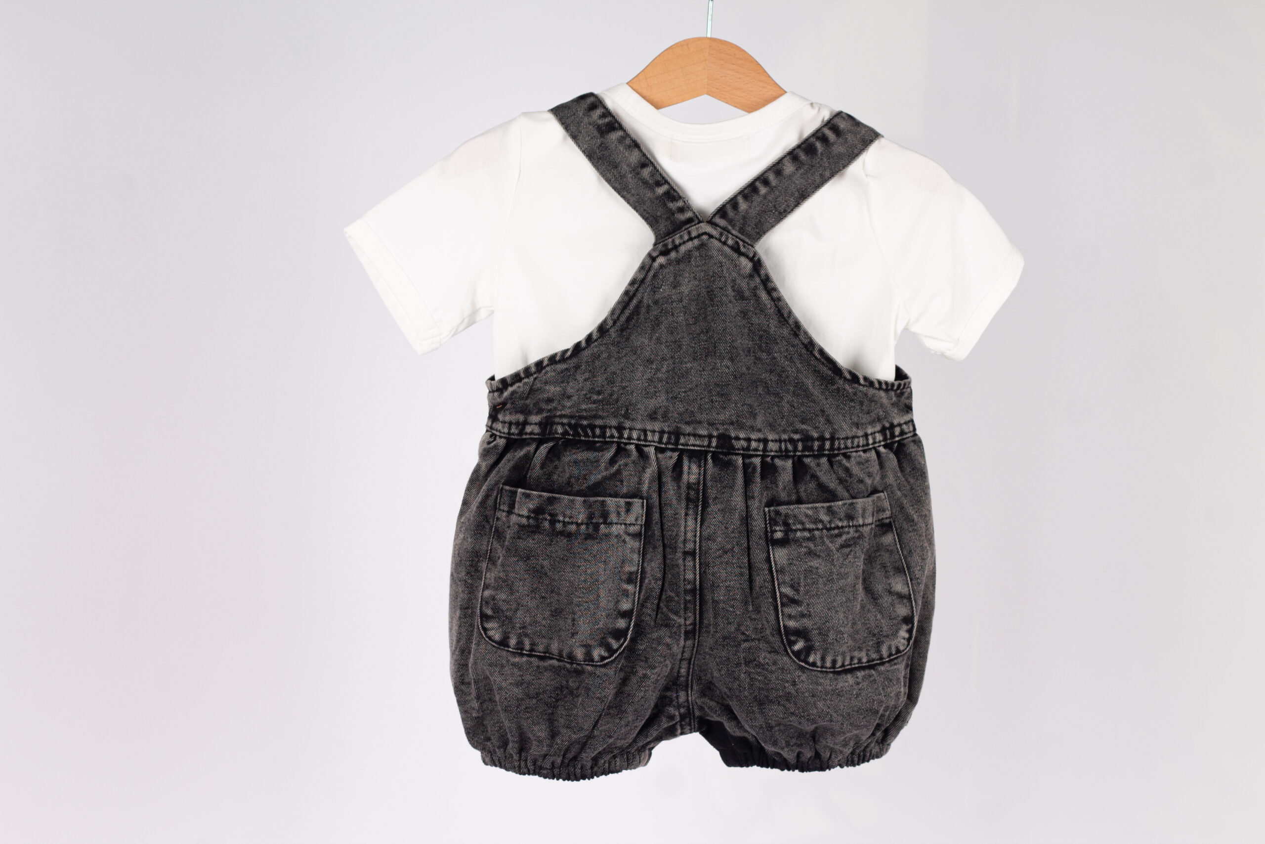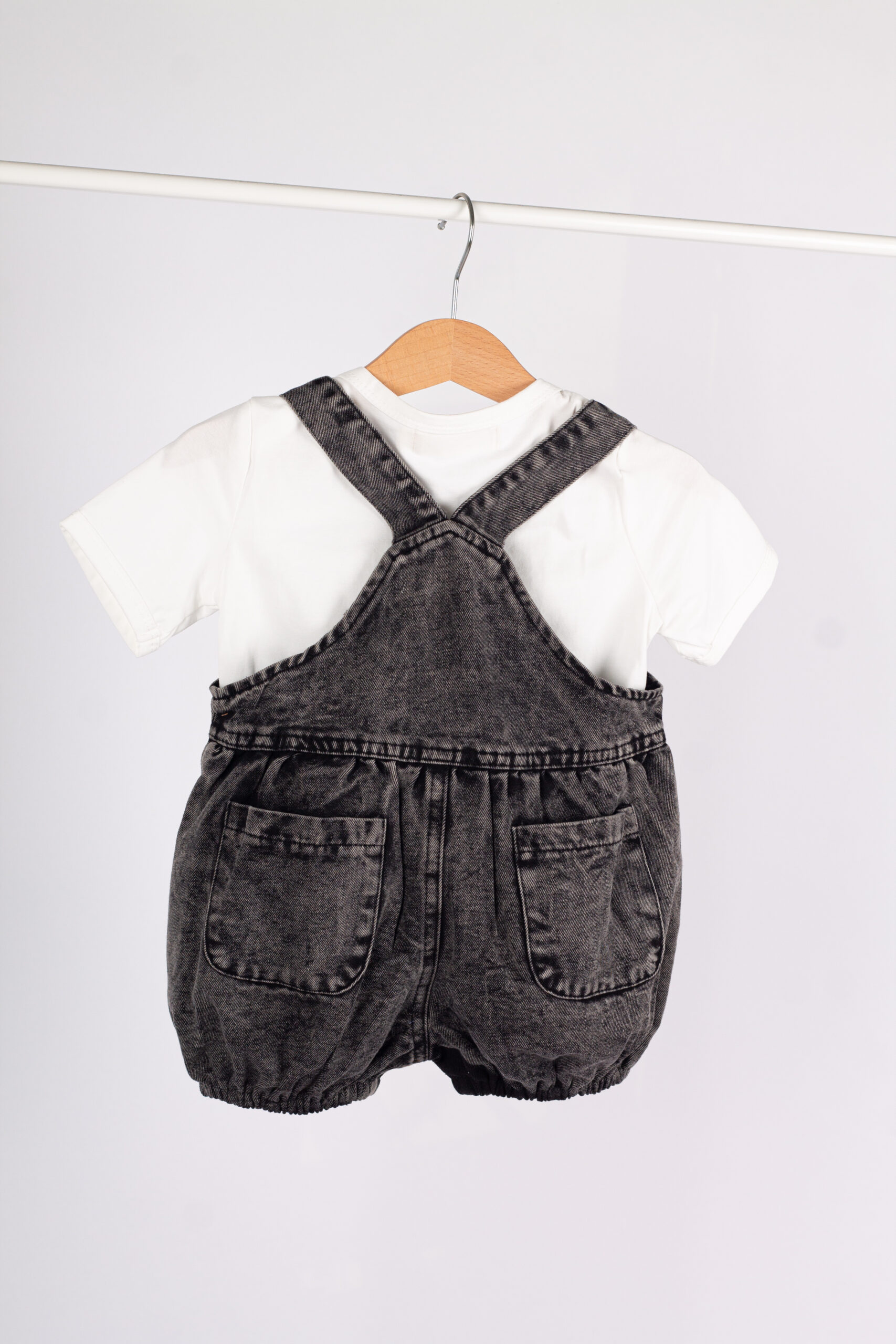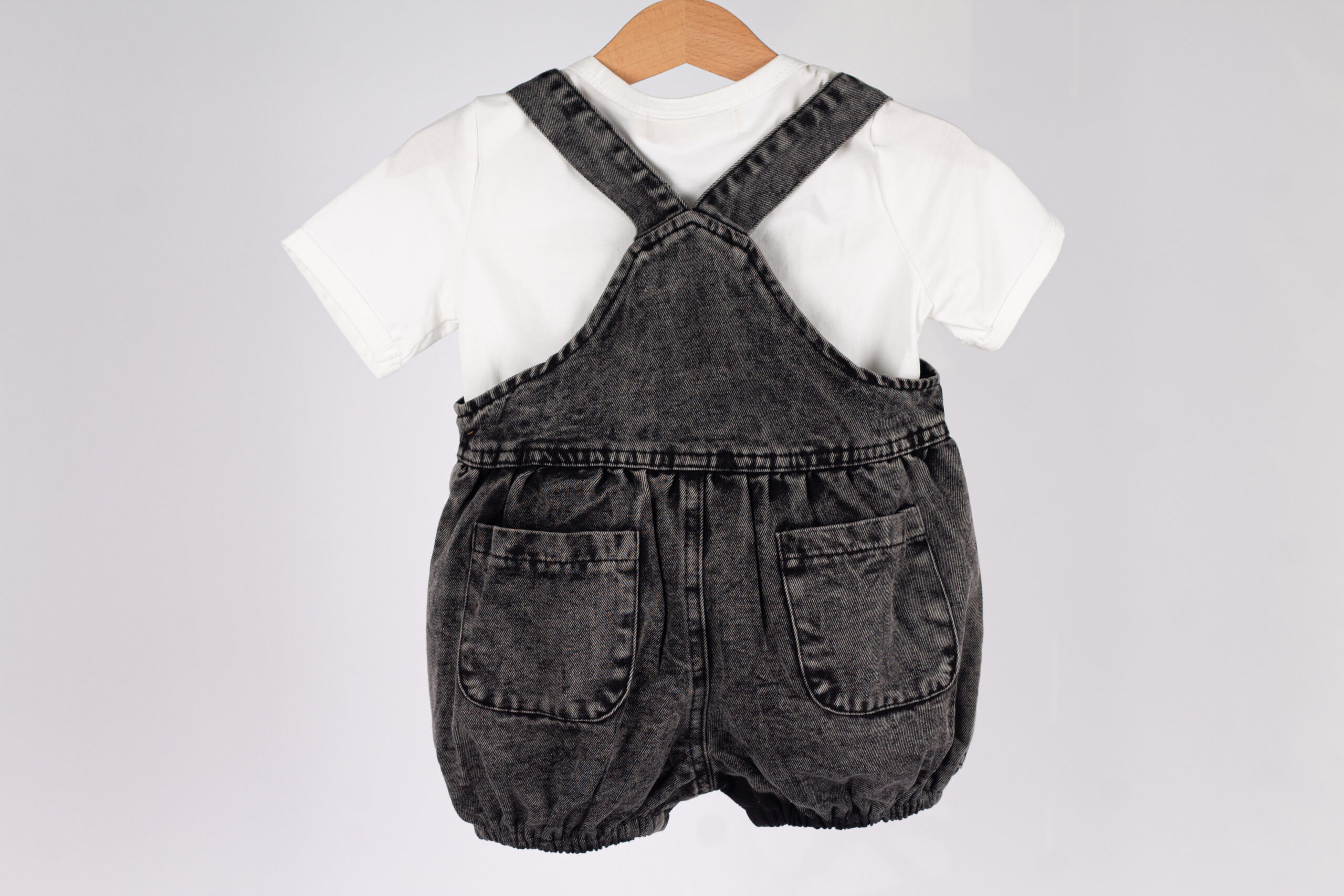 طقم عملي وعصري للأطفال، يجمع بين سالوبيت جينز بلون فحمي مميز بتفاصيل واسعة وجيوب جانبية، مع قميص أبيض بسيط يعطي توازن مثالي للإطلالة.