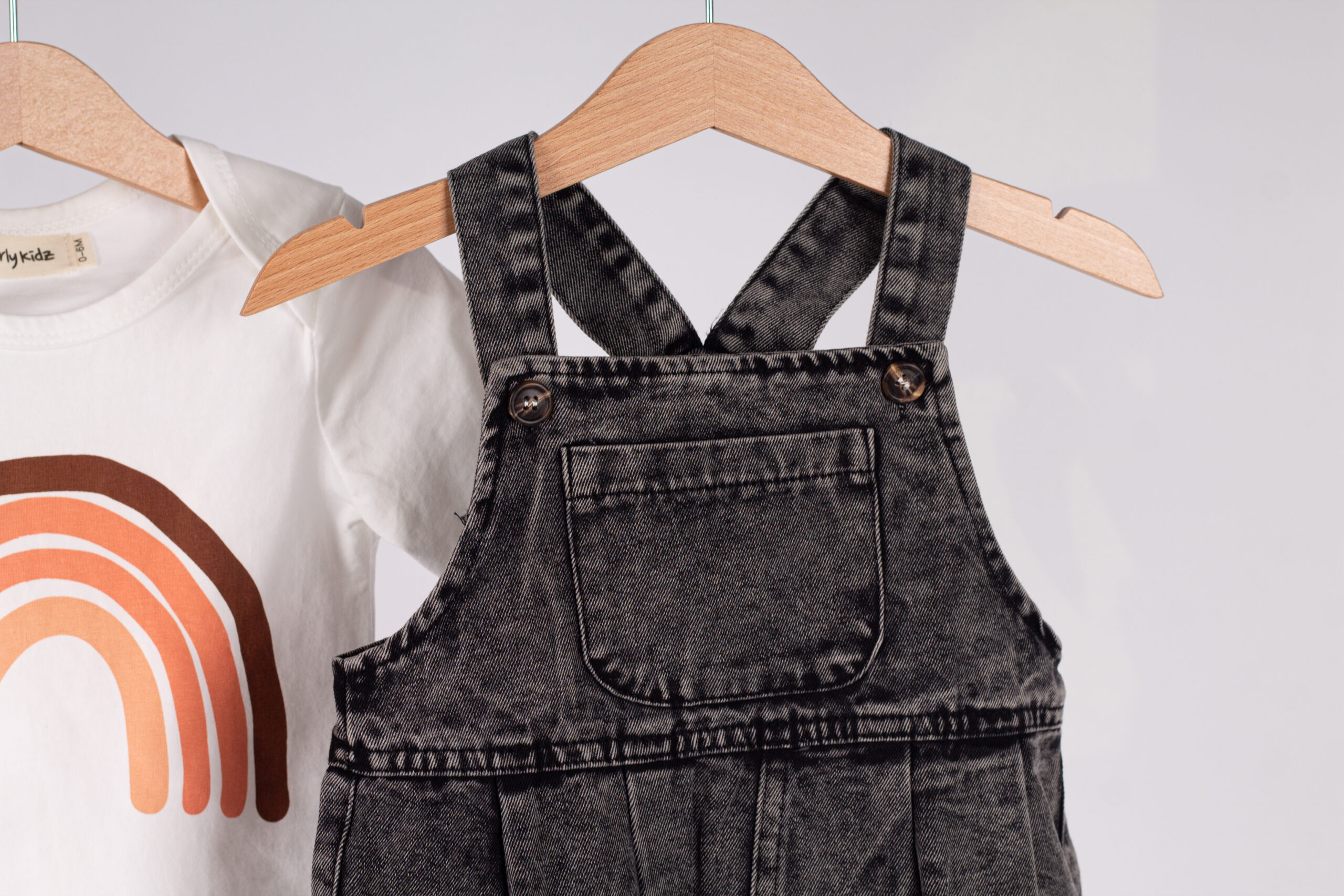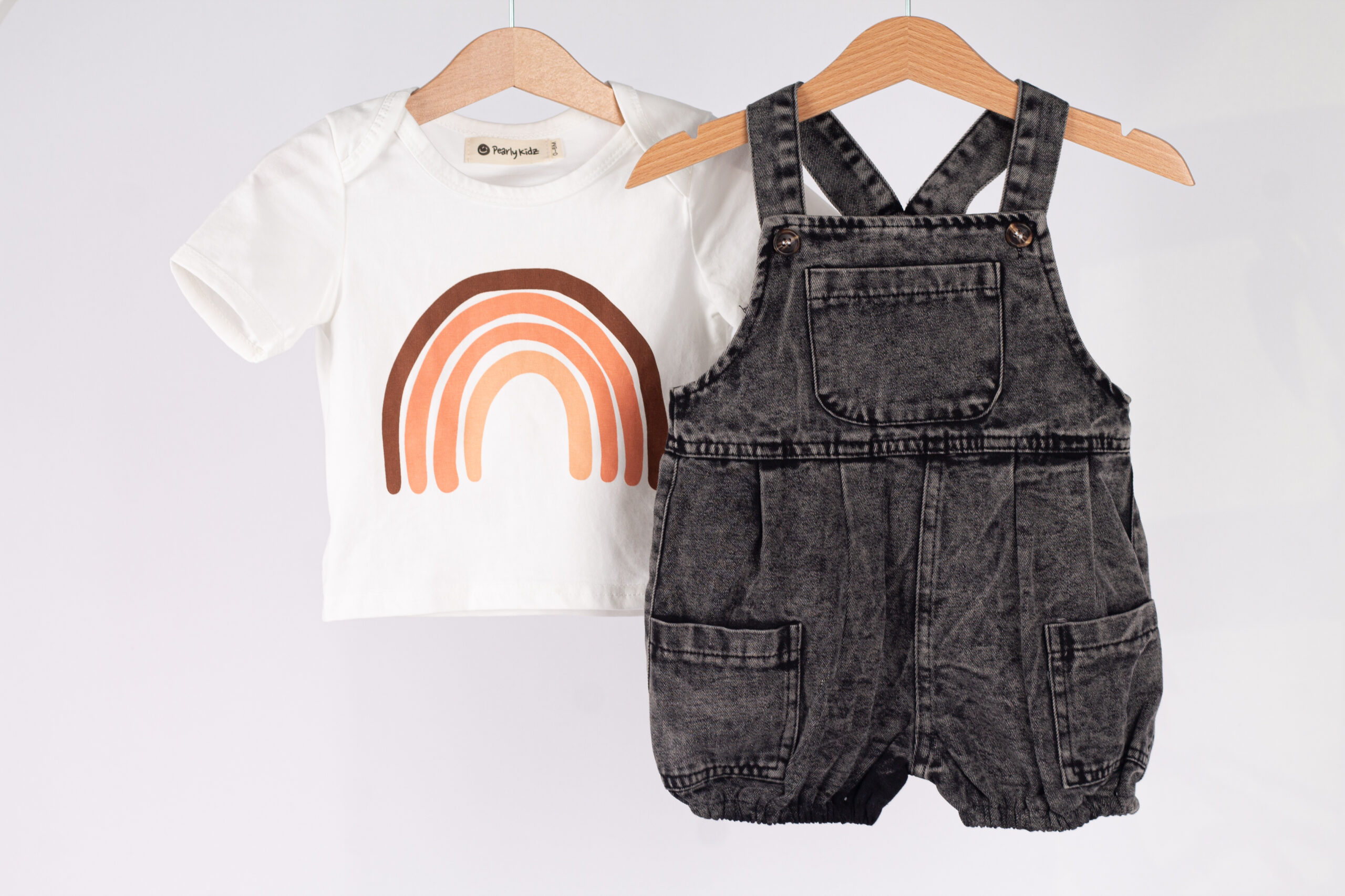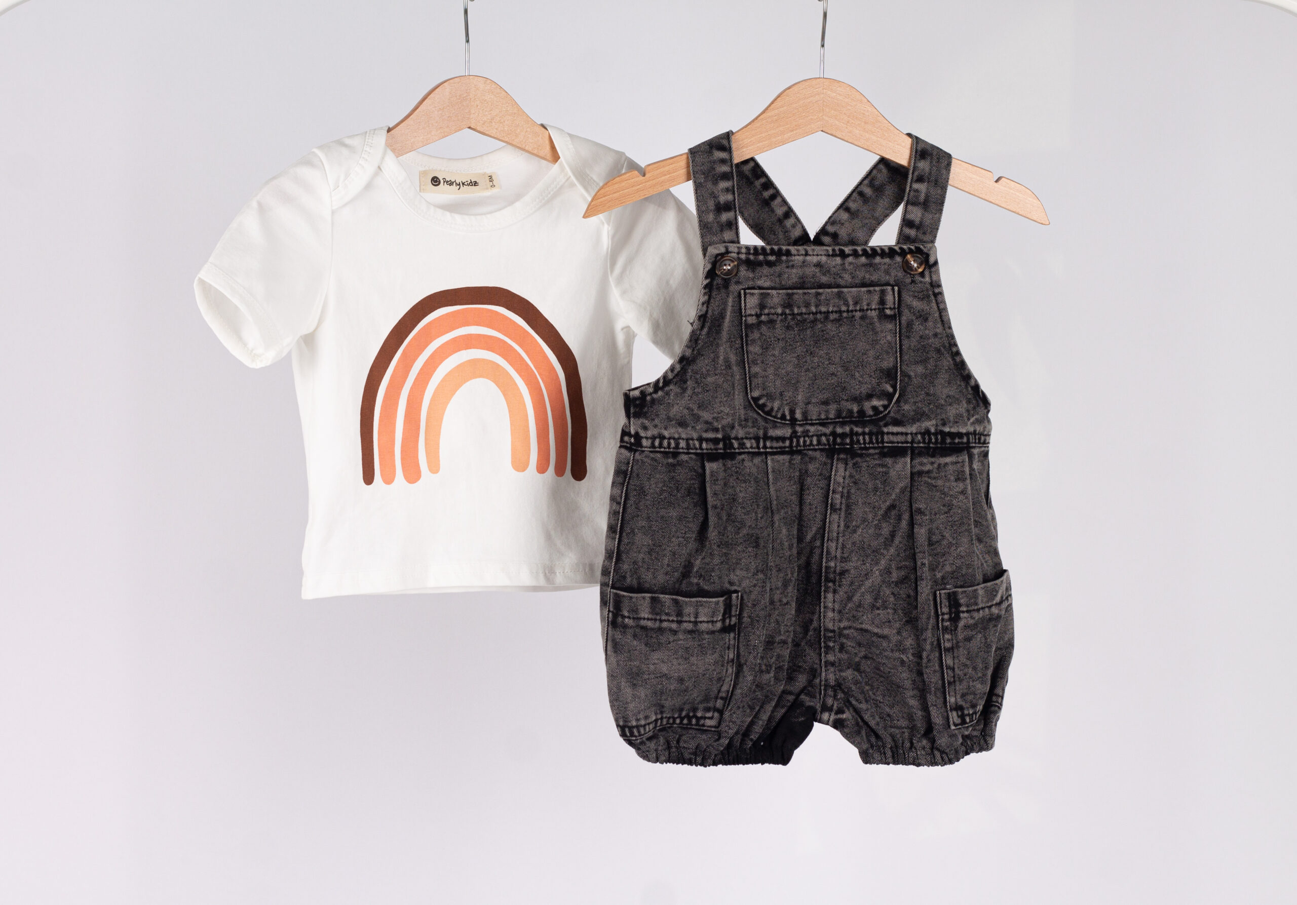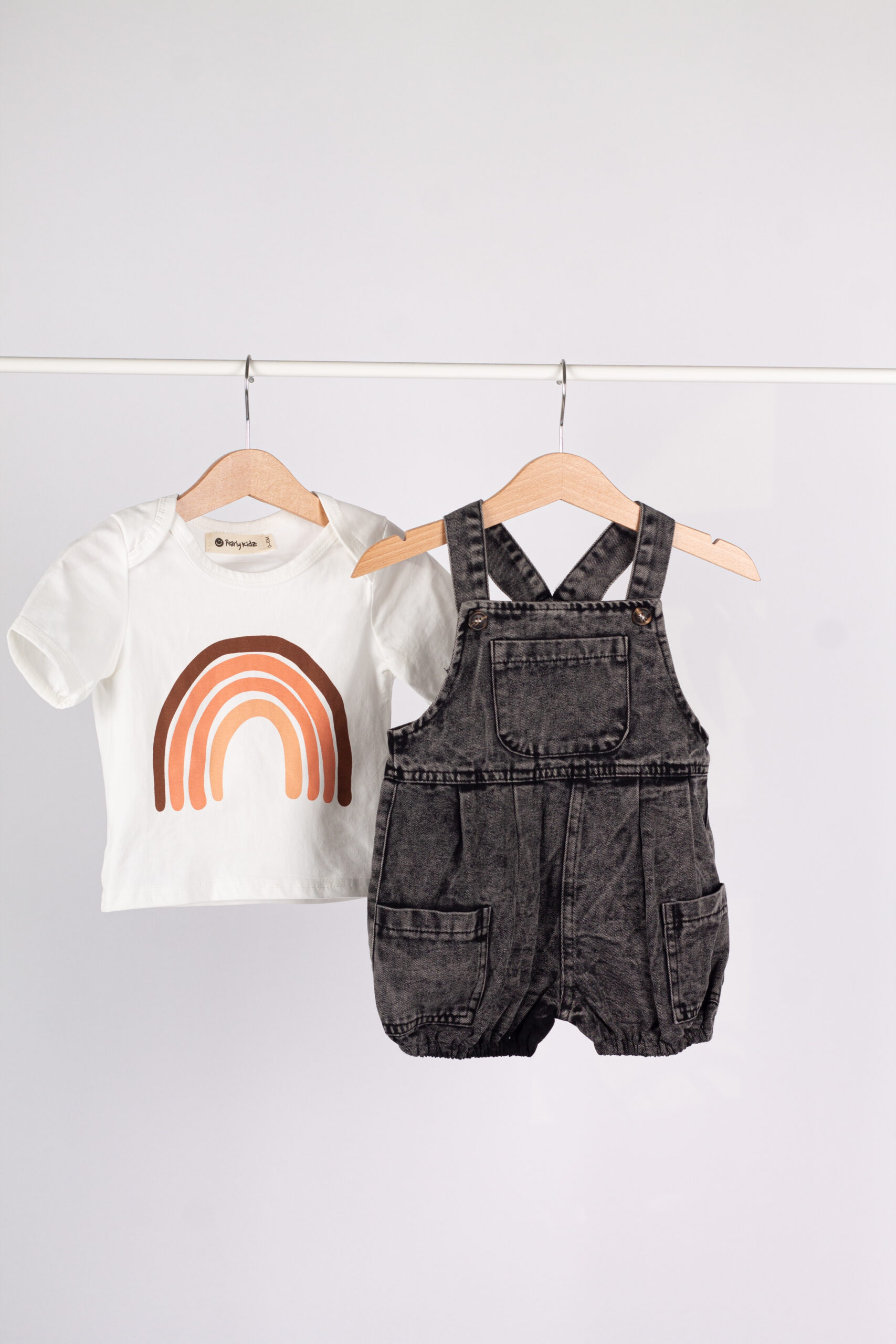 طقم عملي وعصري للأطفال، يجمع بين سالوبيت جينز بلون فحمي مميز بتفاصيل واسعة وجيوب جانبية، مع قميص أبيض بسيط يعطي توازن مثالي للإطلالة.