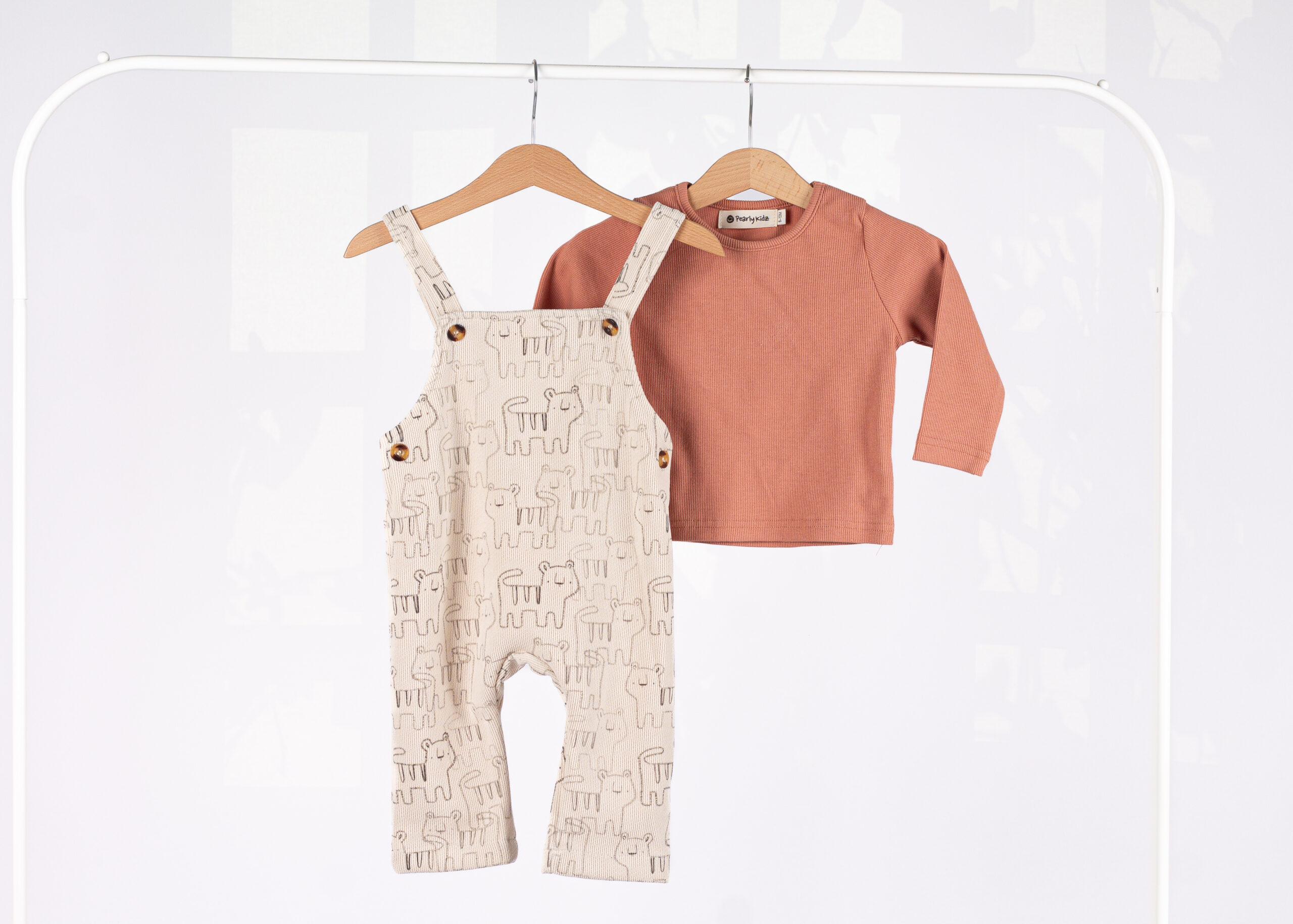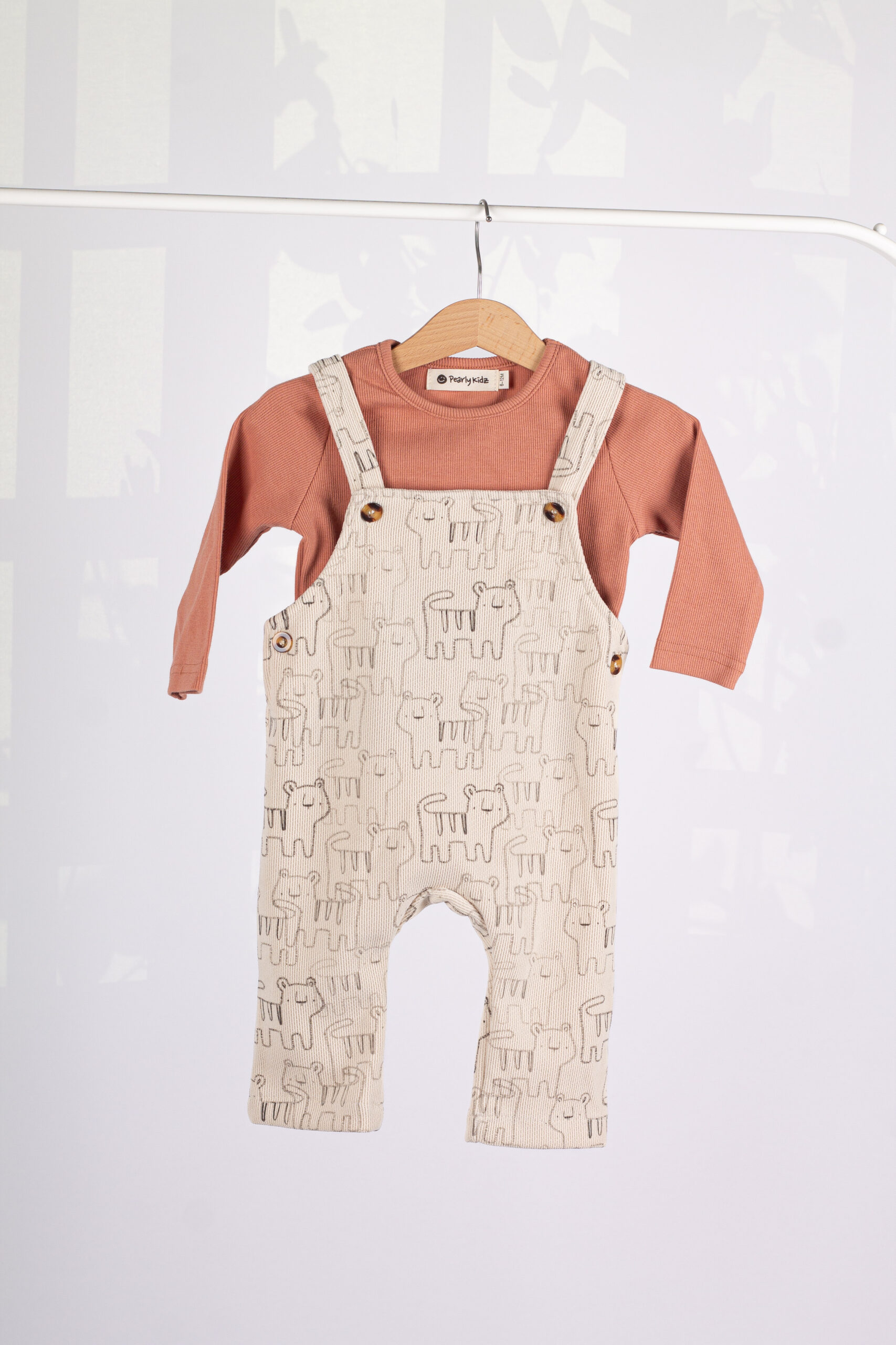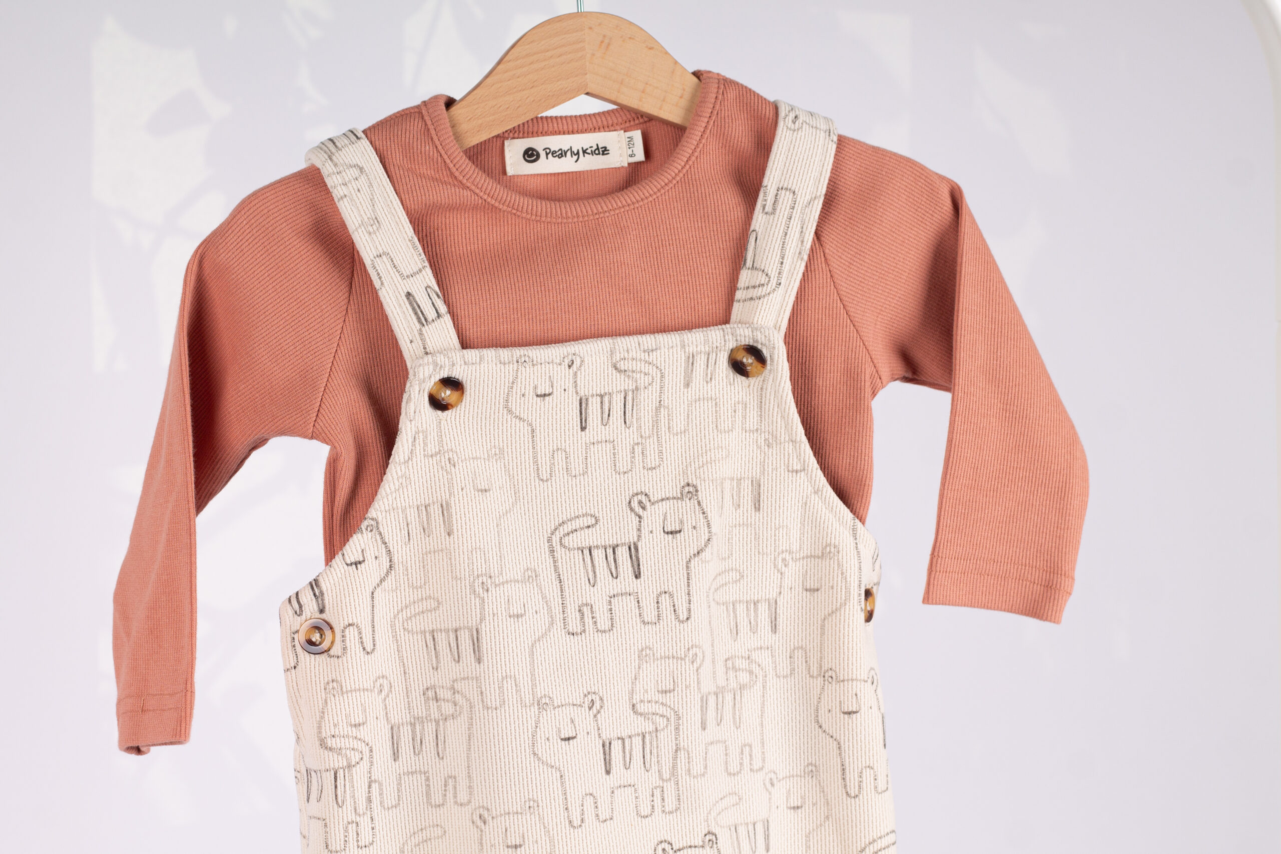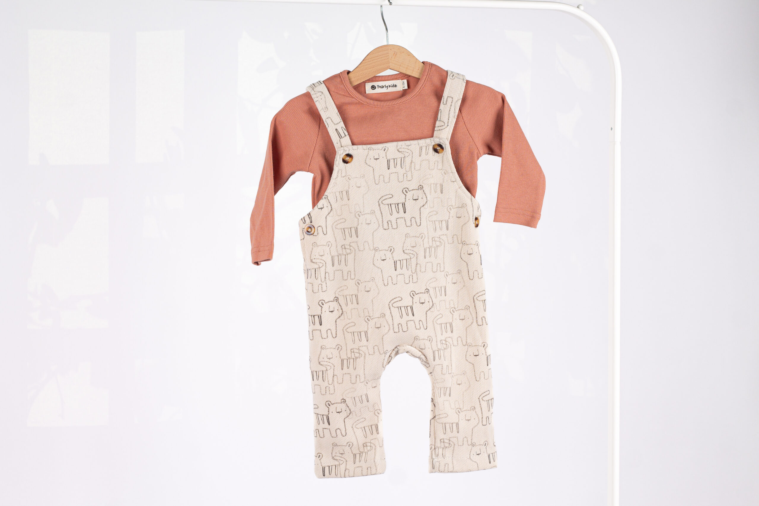 طقم لطيف ومريح بتصميم طفولي ناعم، مكوّن من سالوبيت برسومات حيوانات بسيطة تضيف لمسة مرحة، مع قميص طويل بلون دافئ يكمل الإطلالة.