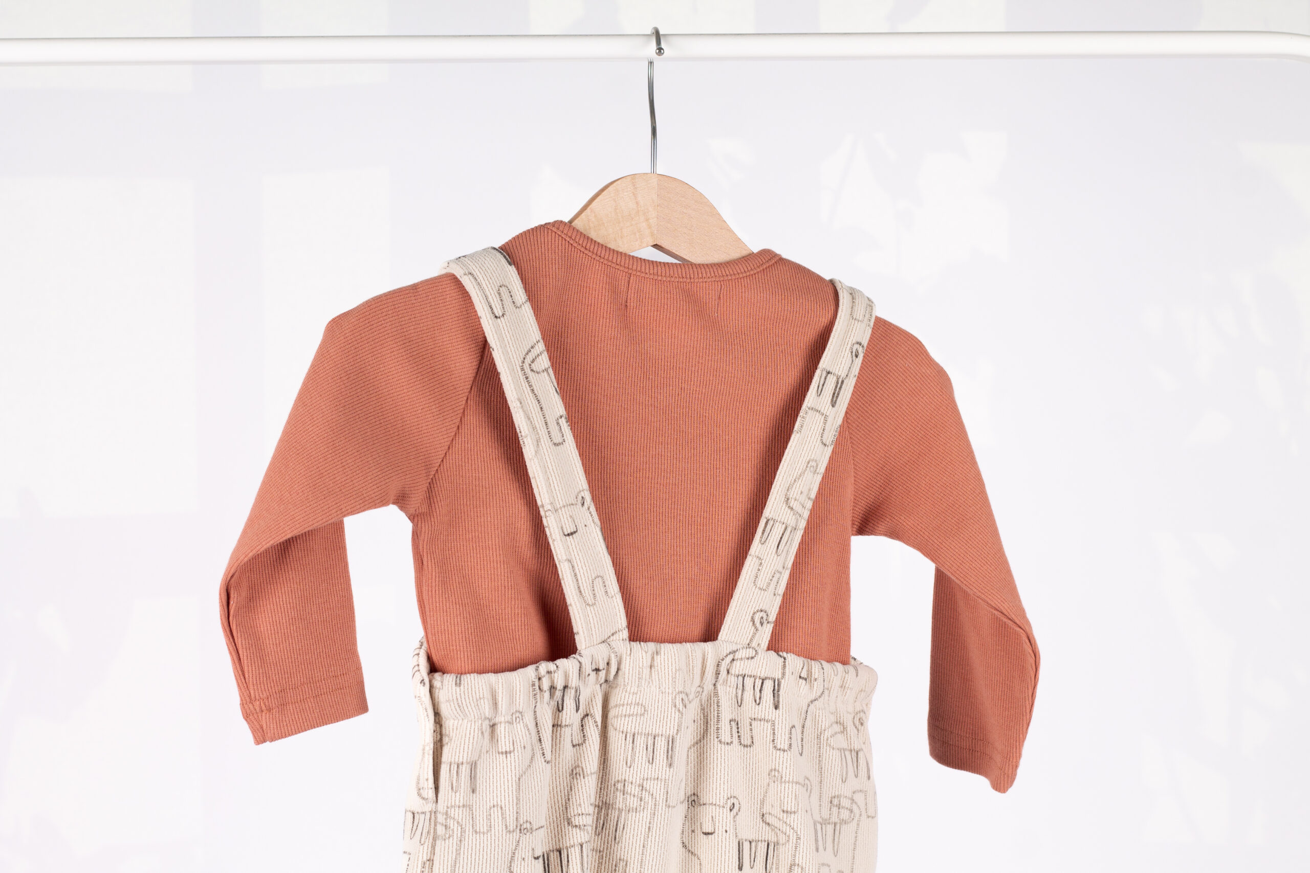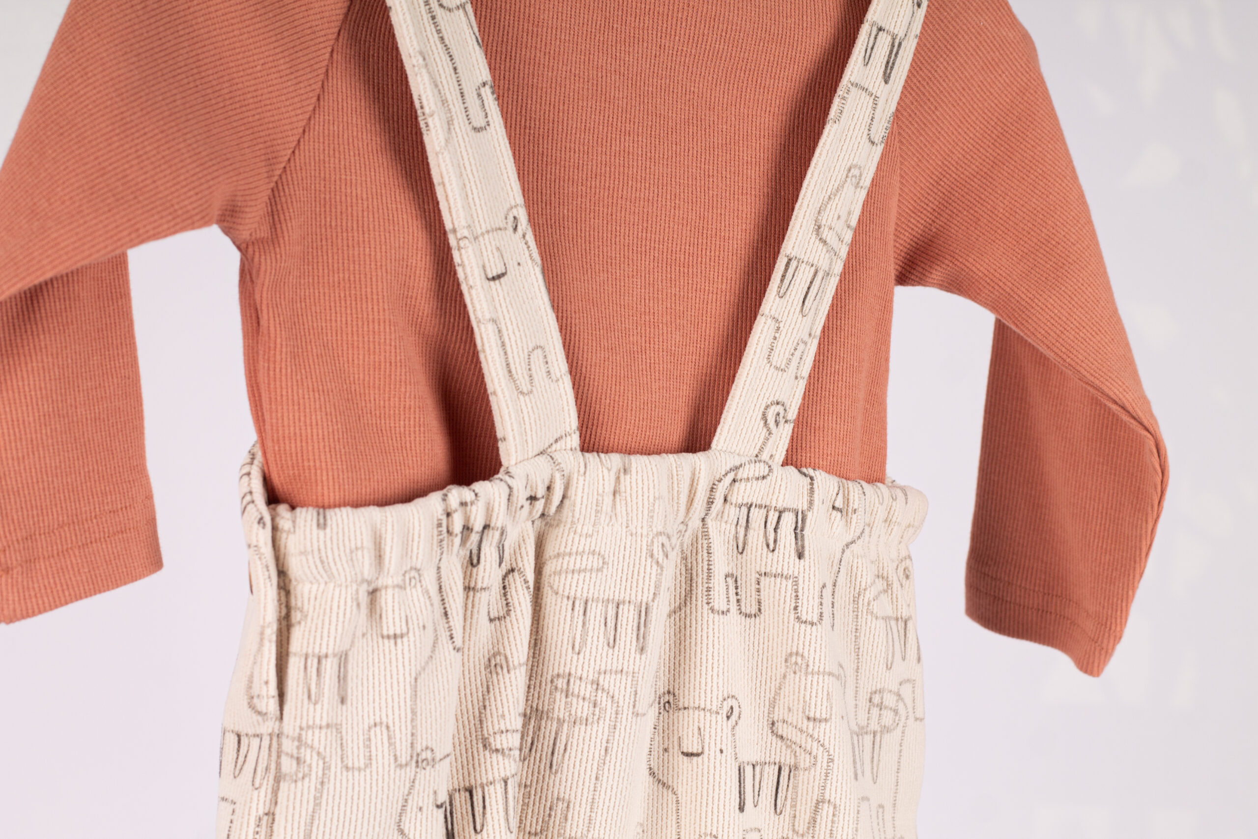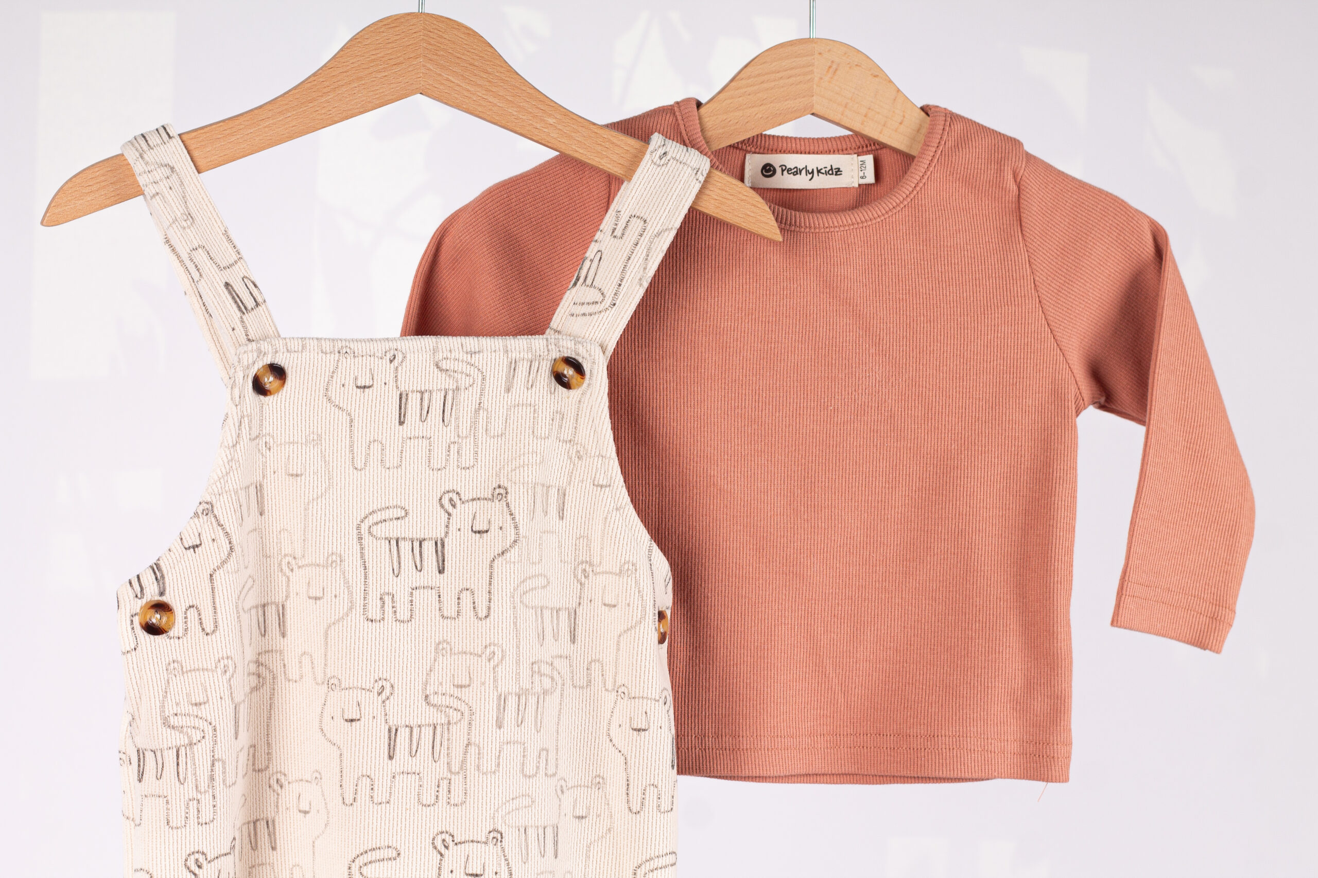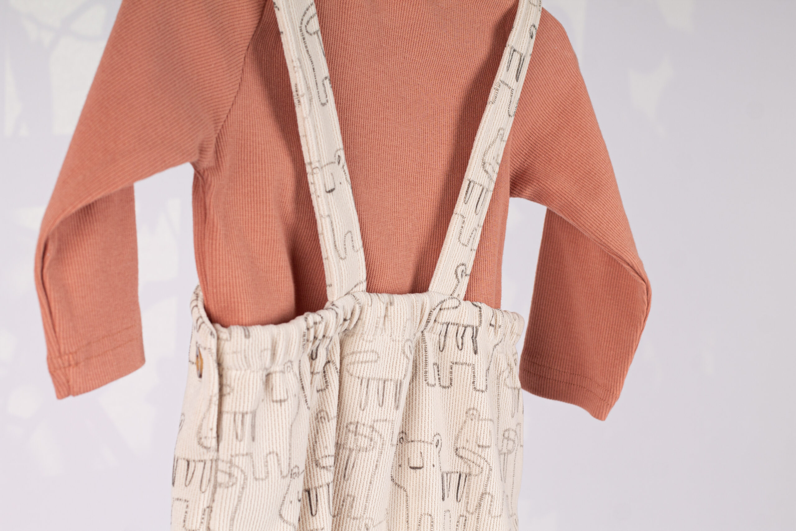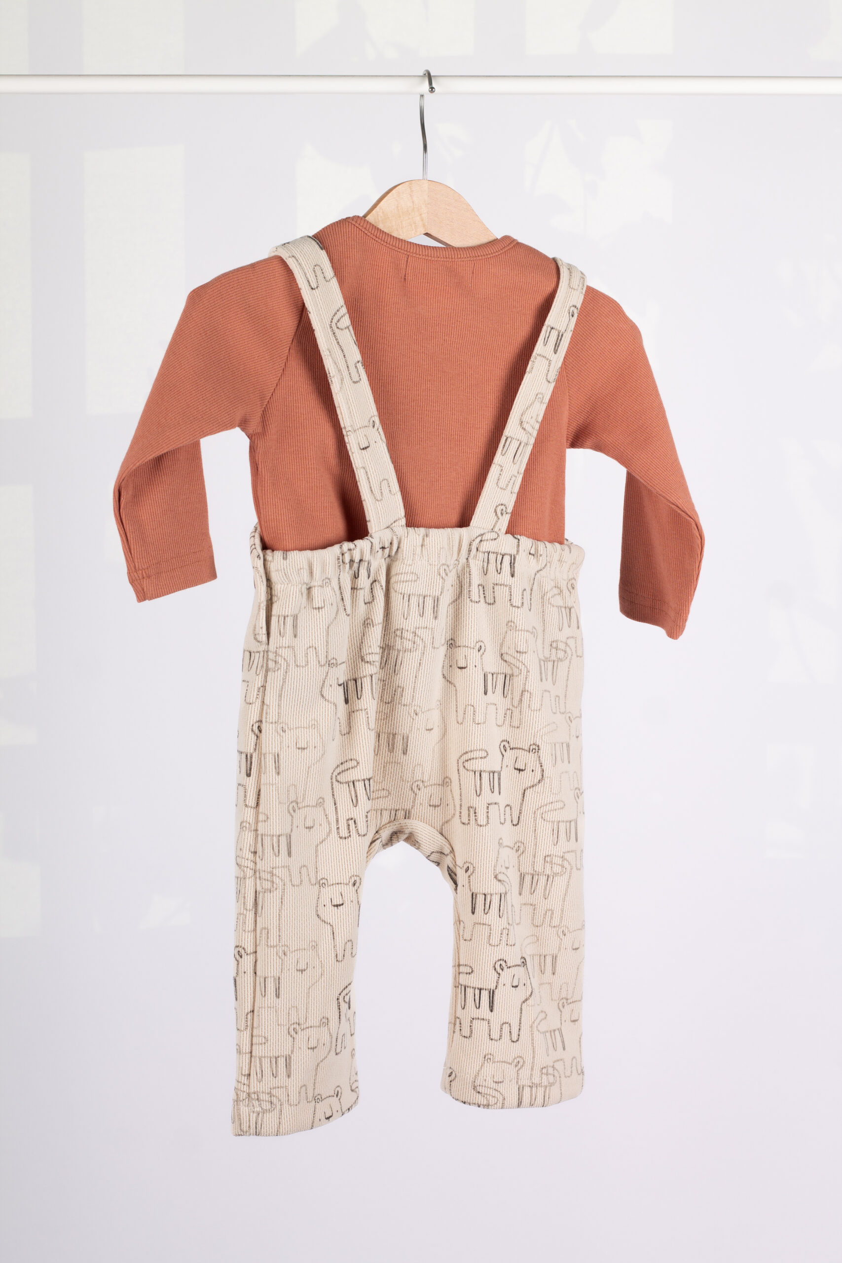 طقم لطيف ومريح بتصميم طفولي ناعم، مكوّن من سالوبيت برسومات حيوانات بسيطة تضيف لمسة مرحة، مع قميص طويل بلون دافئ يكمل الإطلالة.