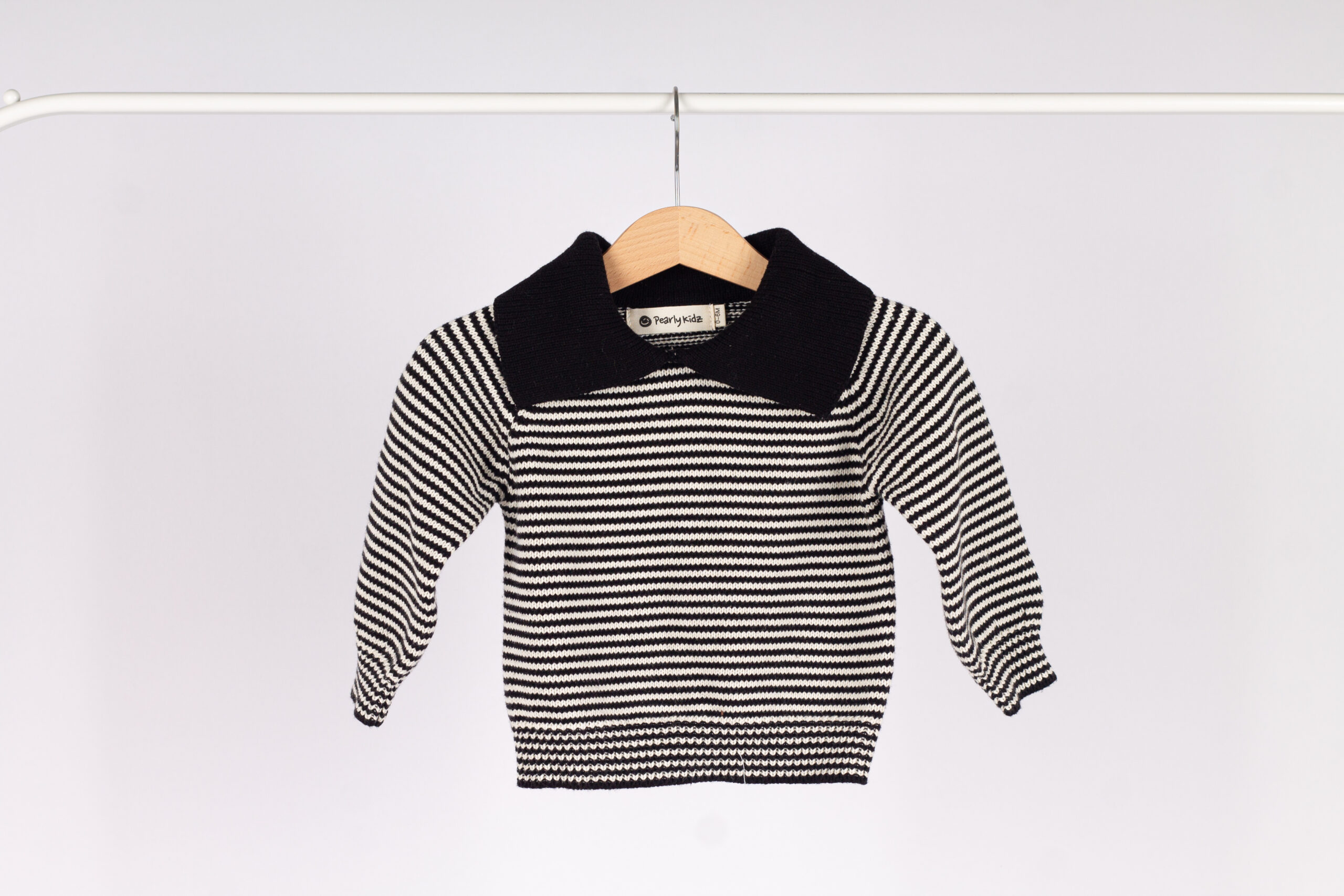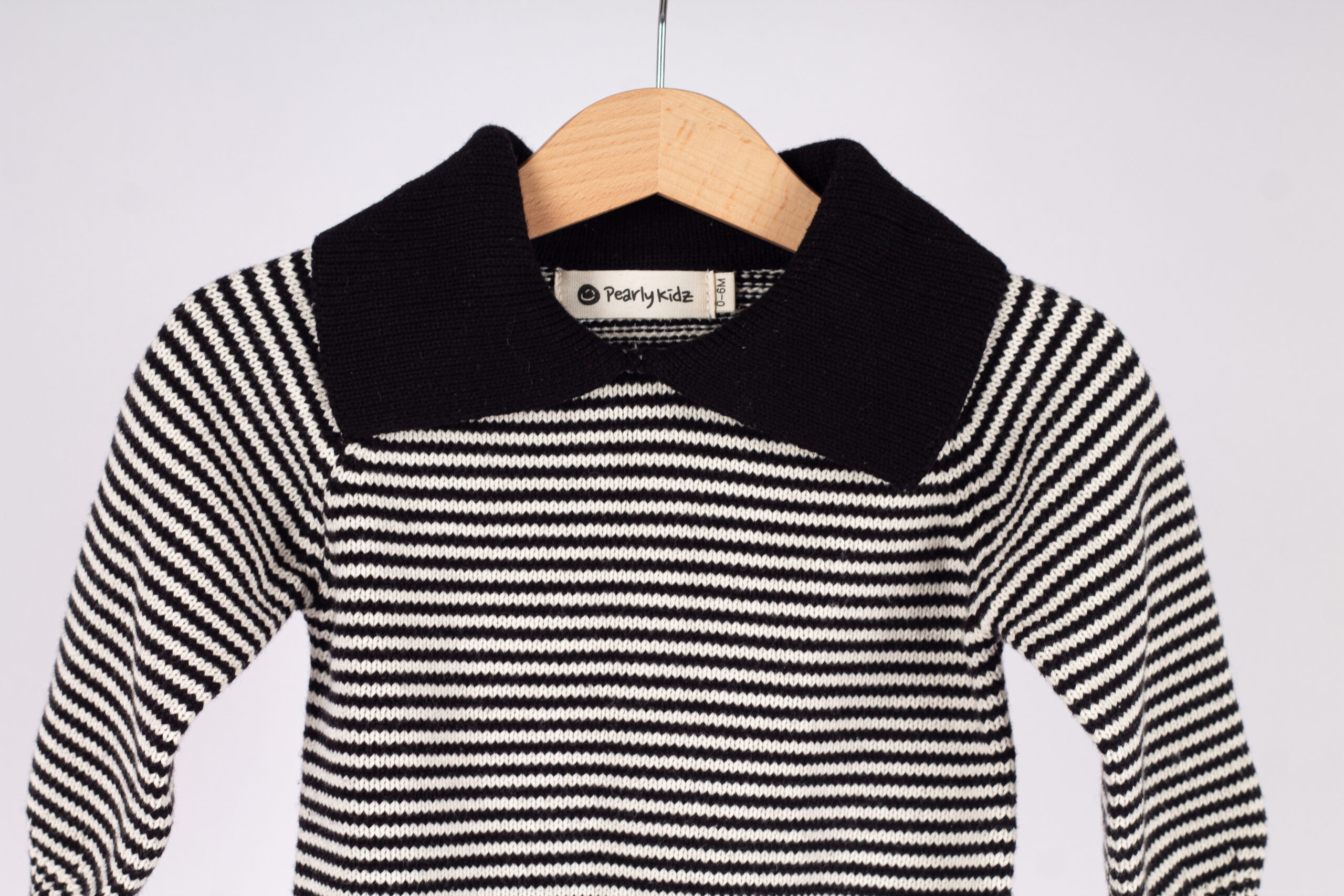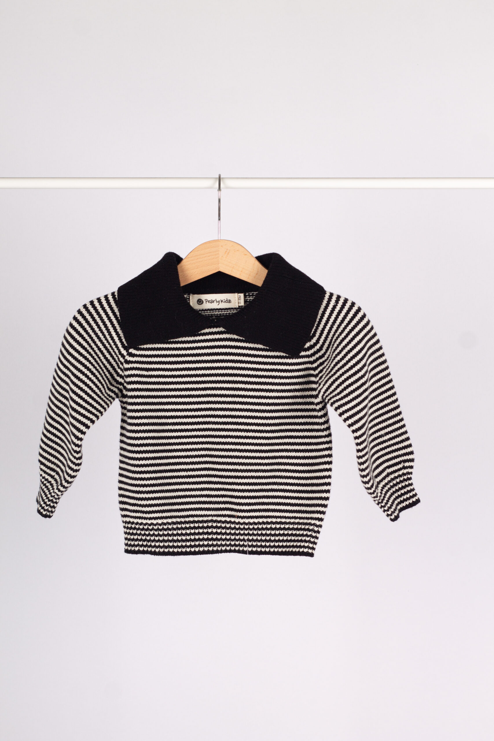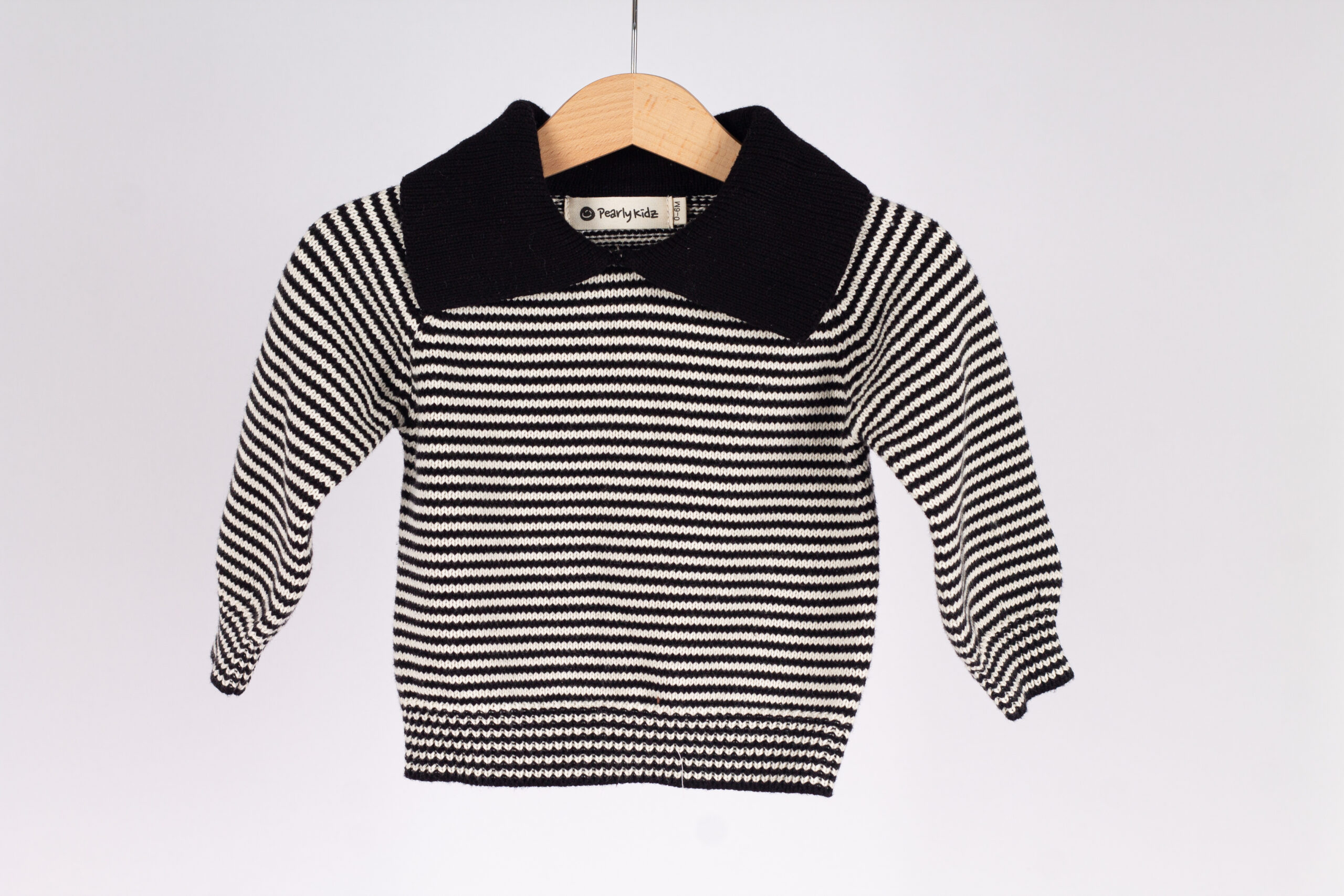 بلوفر ناعم ومريح بتصميم مخطط كلاسيكي، يأتي بياقة واسعة ولونين متناسقين يمنحونه لمسة راقية. يناسب الإطلالات اليومية والمناسبات، وقماشه مرن ومثالي لحركة الطفل طوال اليوم.