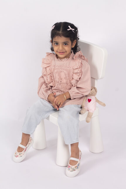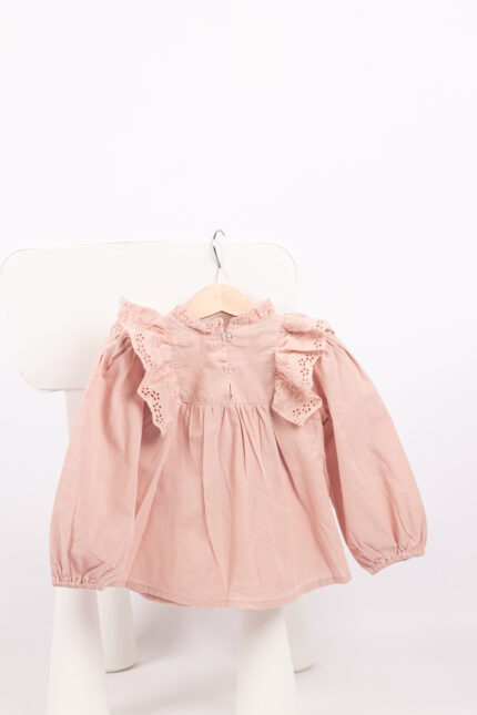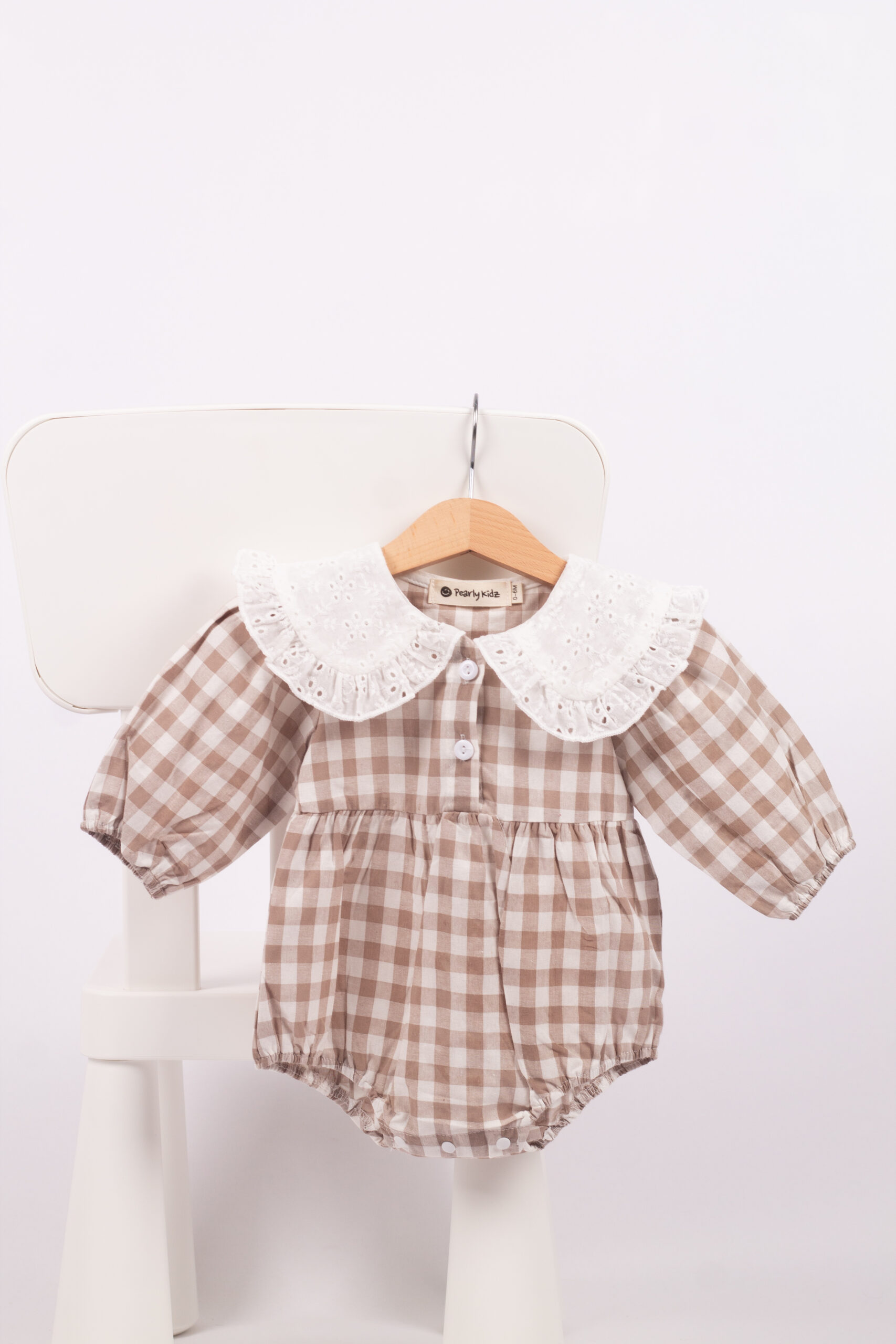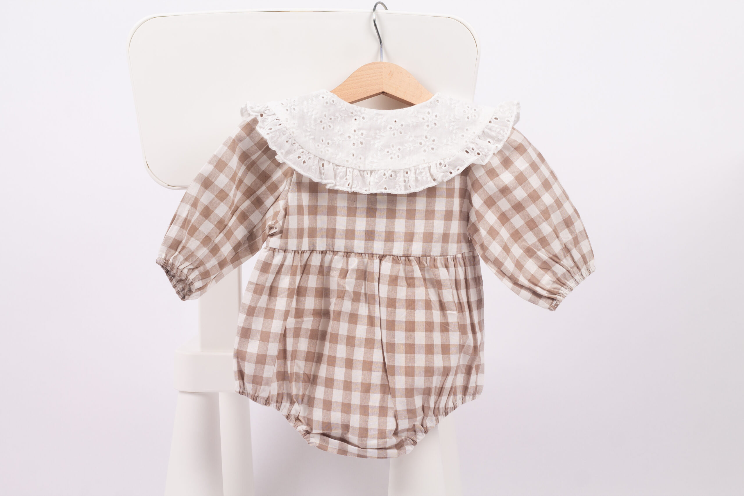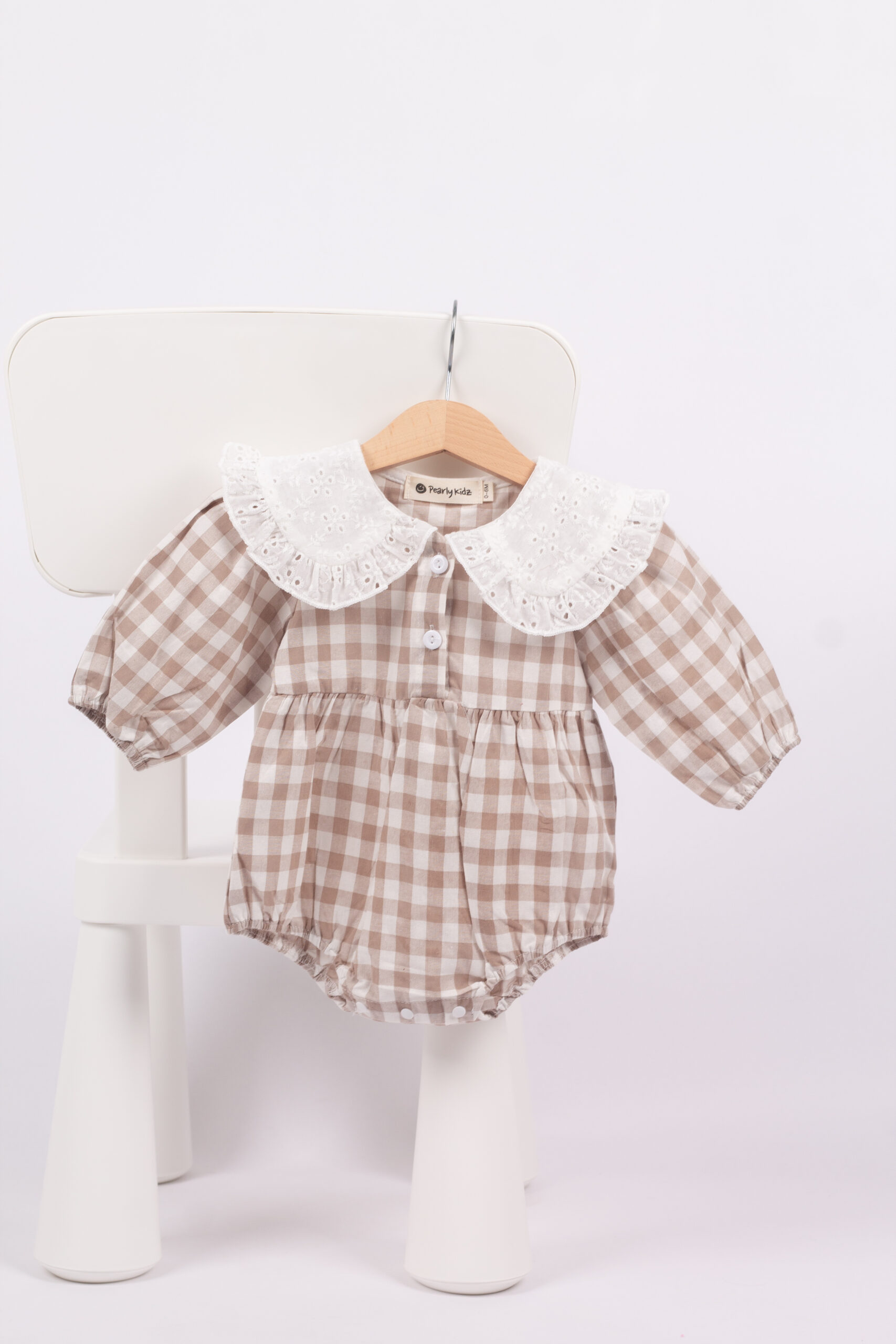 رومبر بناتي بنقشة كارو باللون البيج، يتميز بياقة دانتيل كبيرة بتطريز ناعم يضيف لمسة كلاسيكية. الأكمام طويلة مع إستيك خفيف، والقصة مريحة ومناسبة للبس اليومي والتصوير. خامته خفيفة ومناسبة لأجواء مختلفة، وتصميمه بسيط ومرتب.