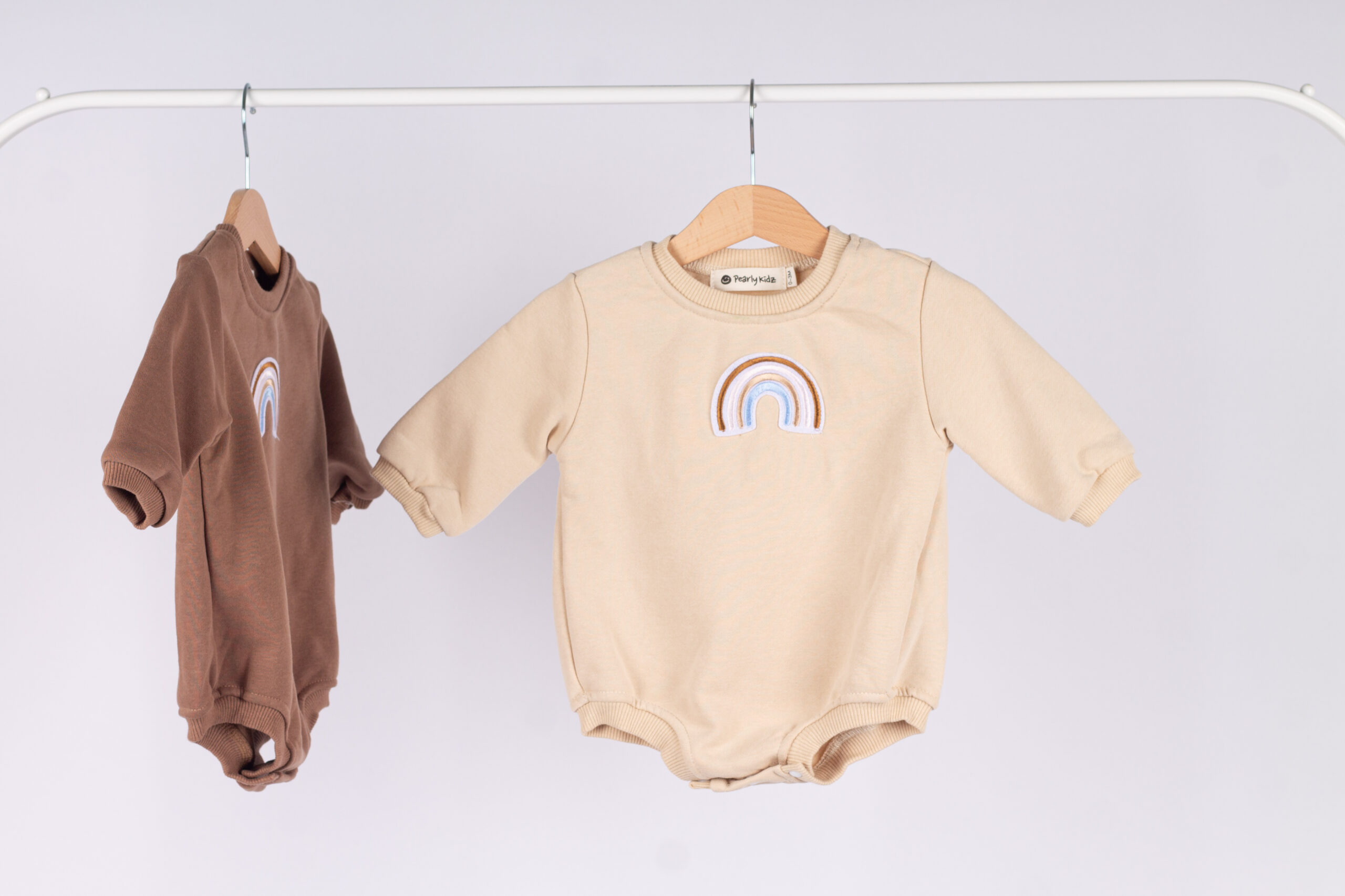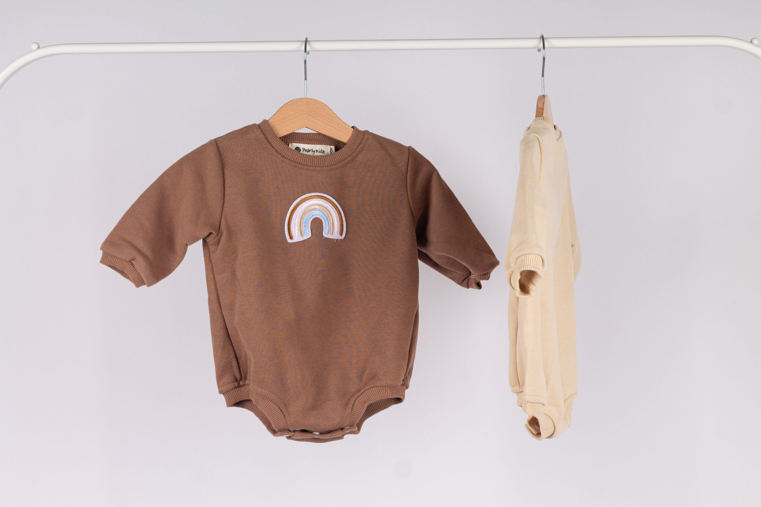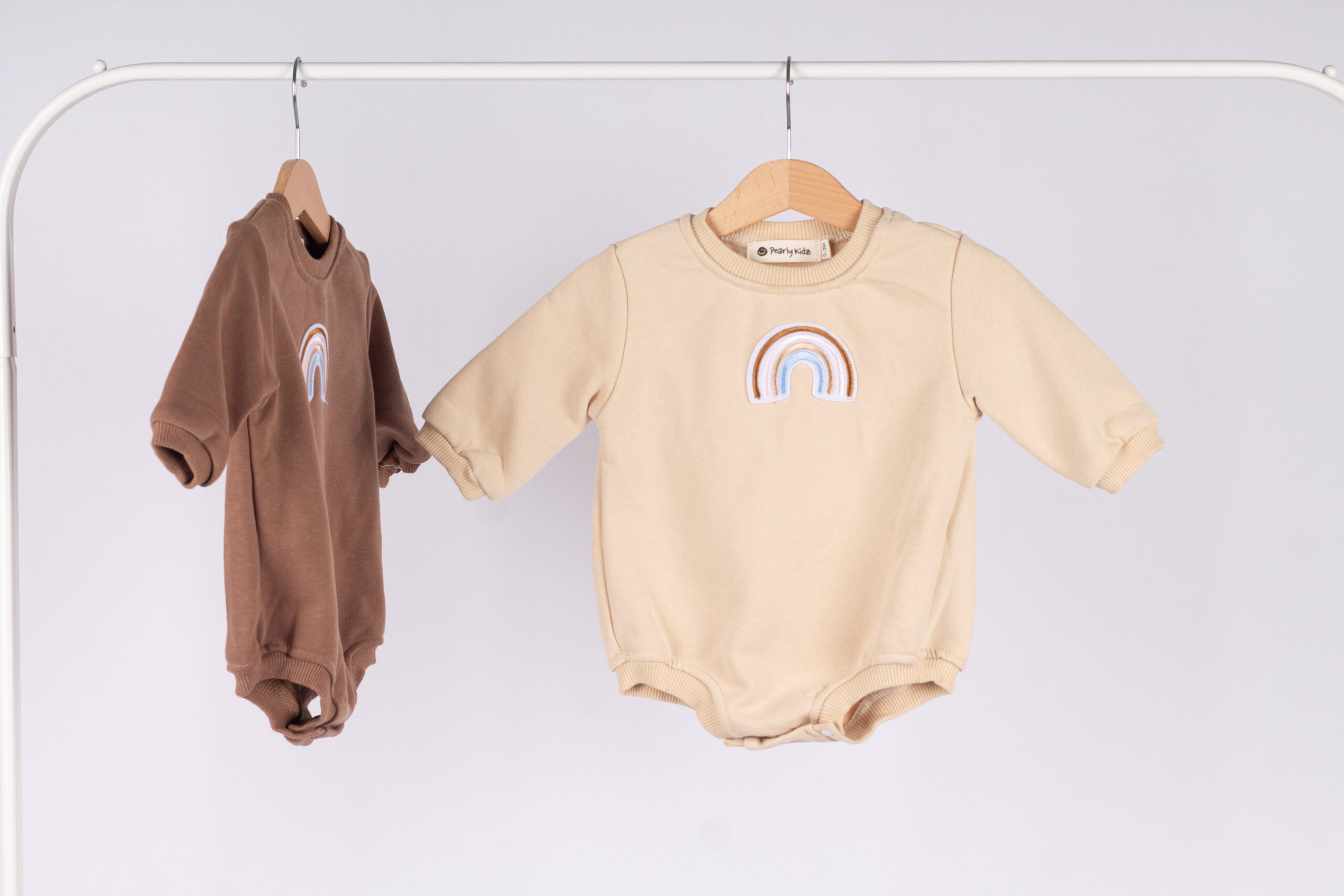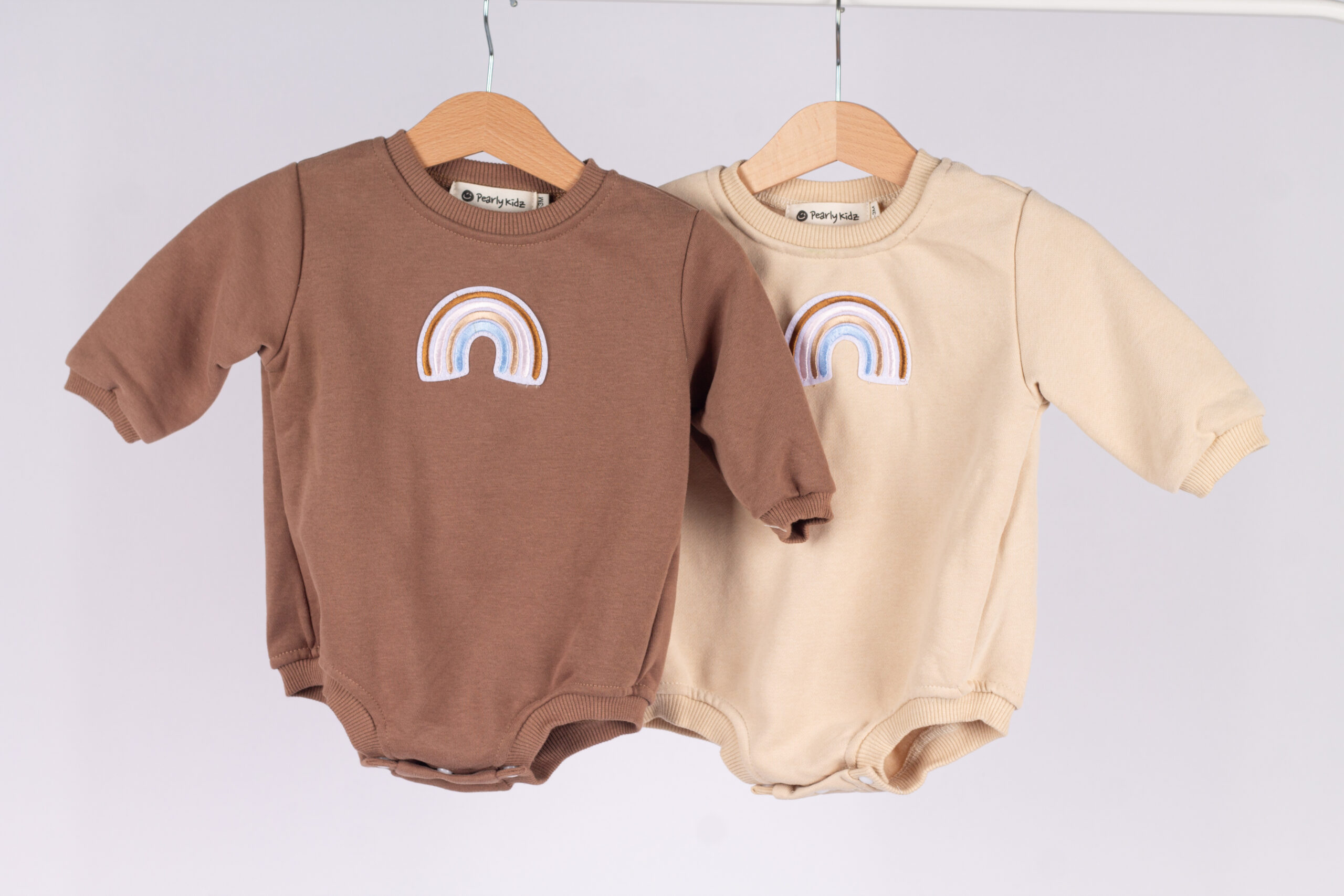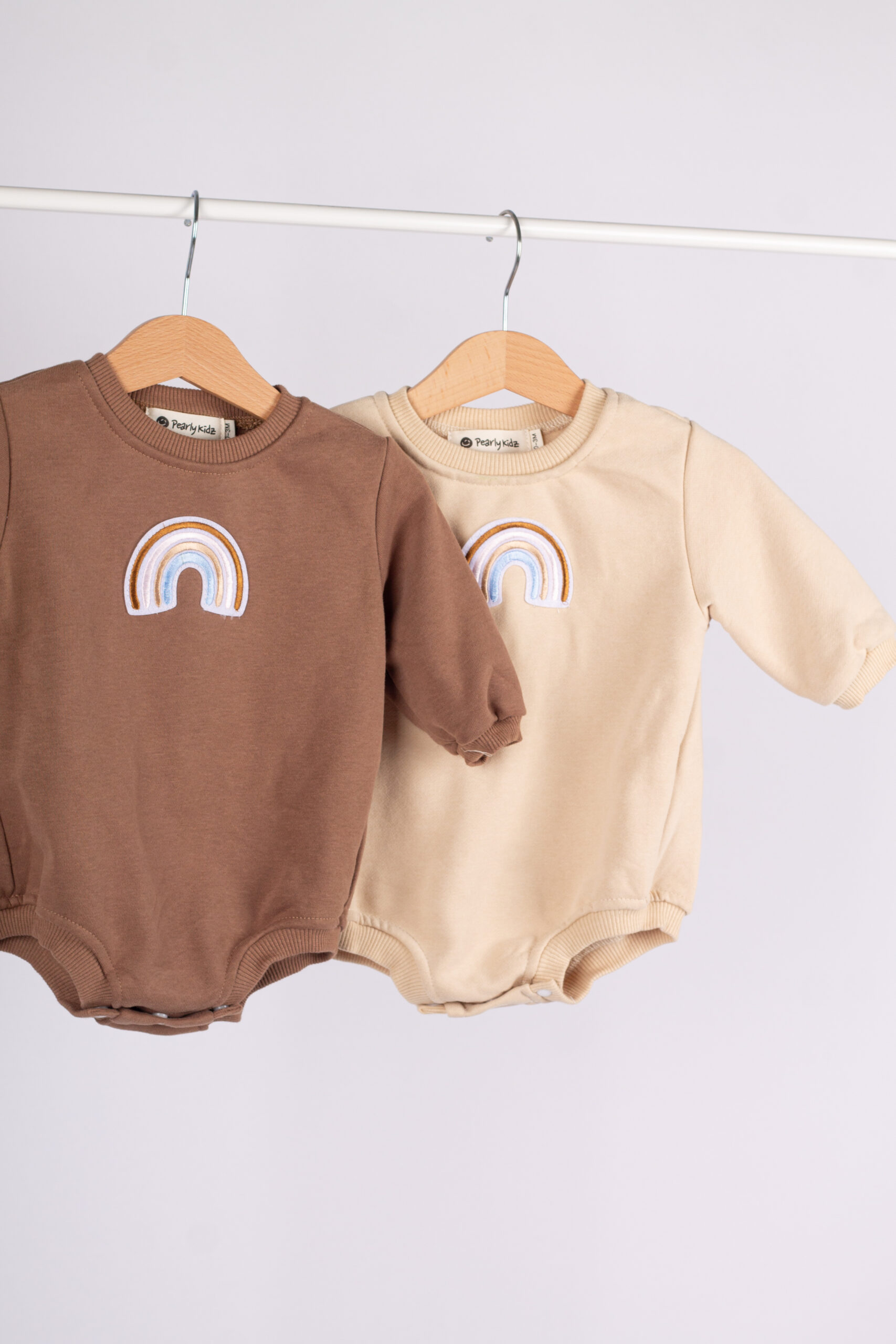 يتميز بتطريز قوس المطر في المنتصف ليضيف لمسة طفولية جذابة، بالإضافة إلى سنابات سفلية لتسهيل تبديل الحفاض بكل سرعة وسهولة.