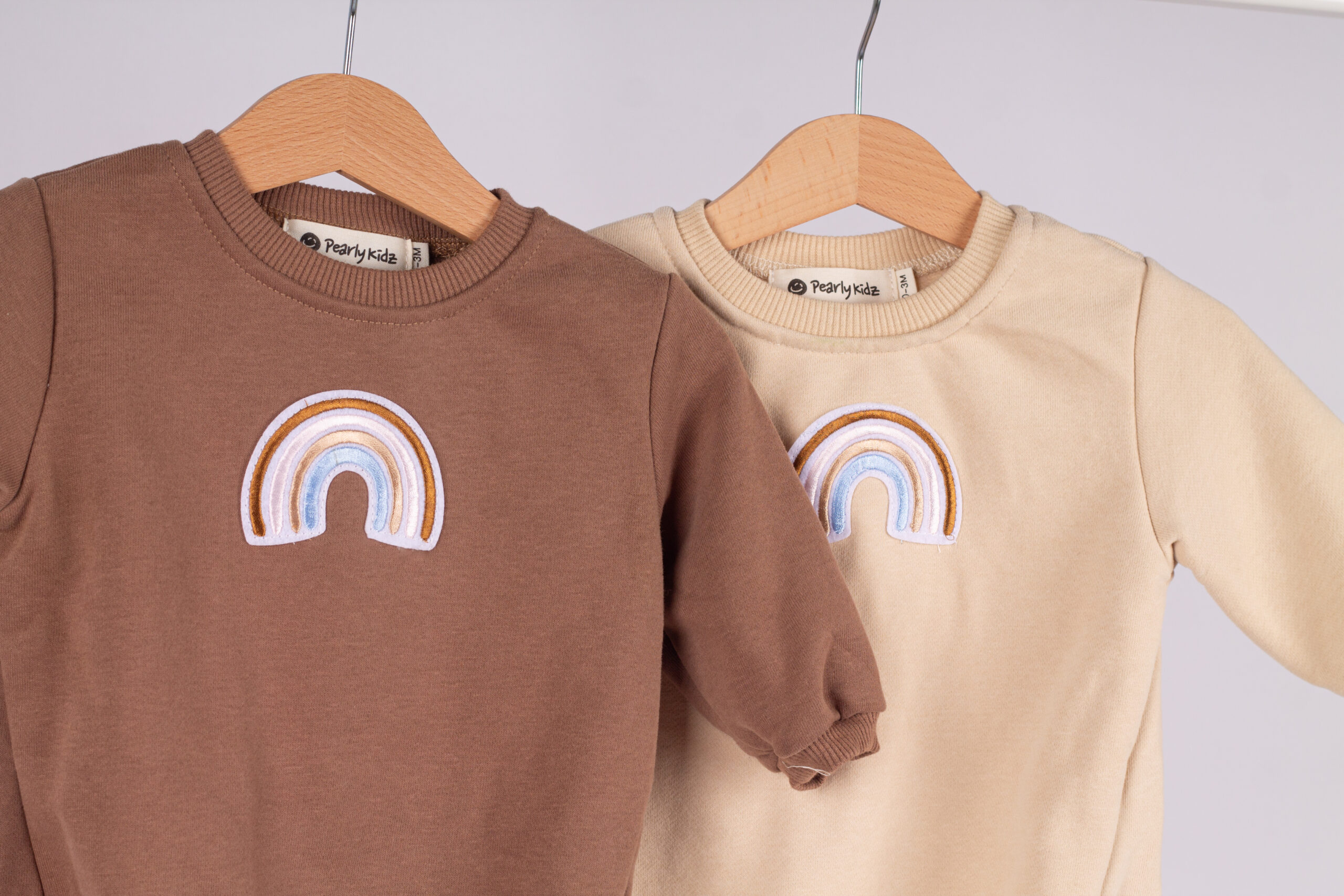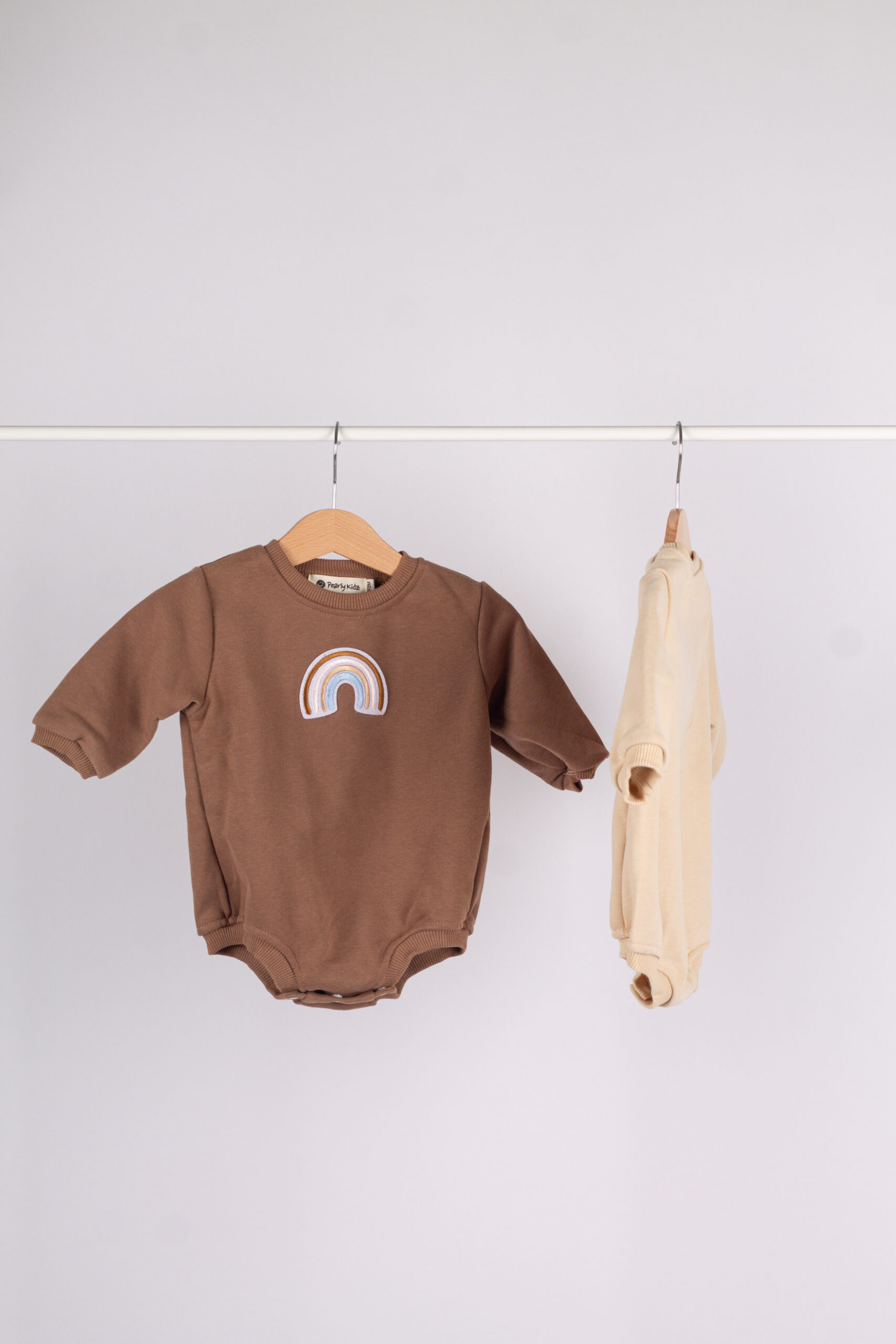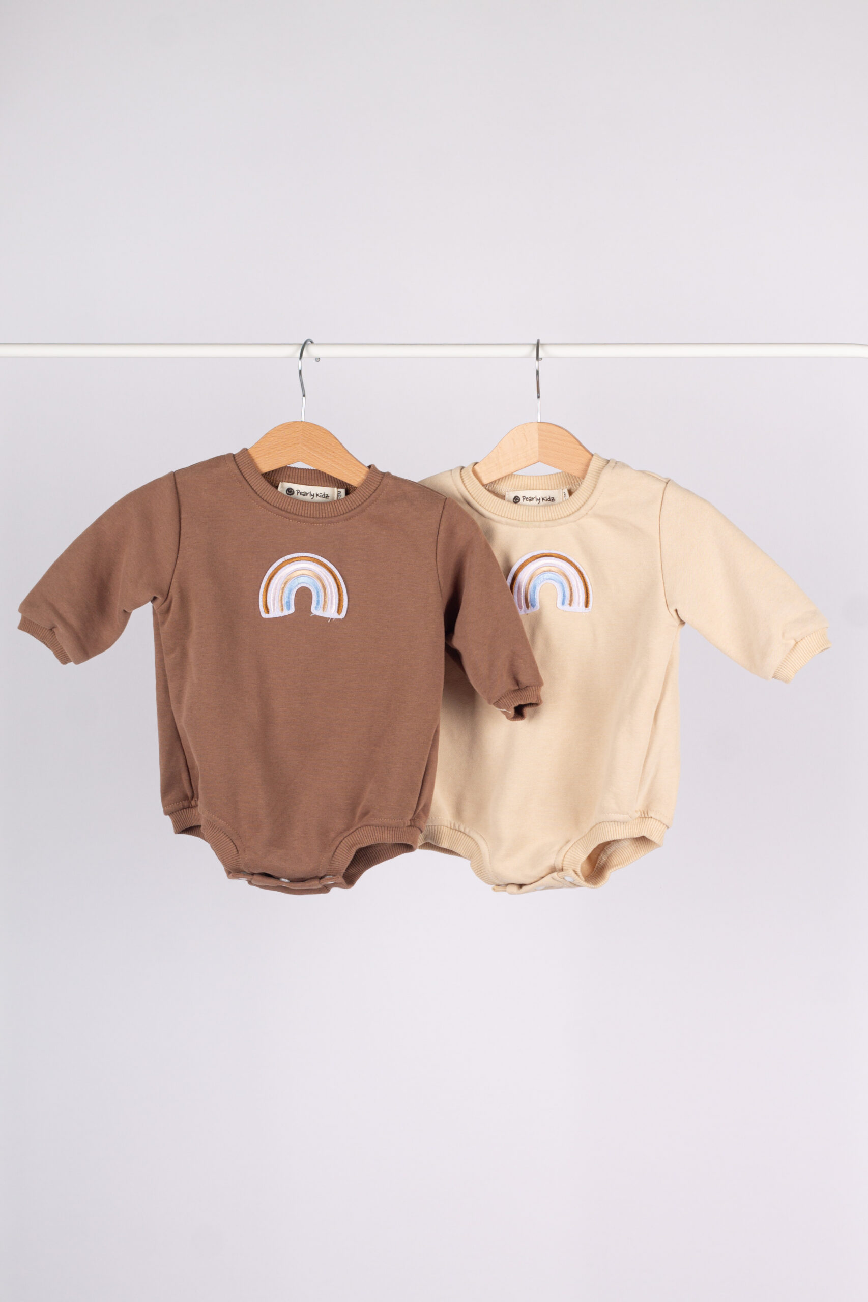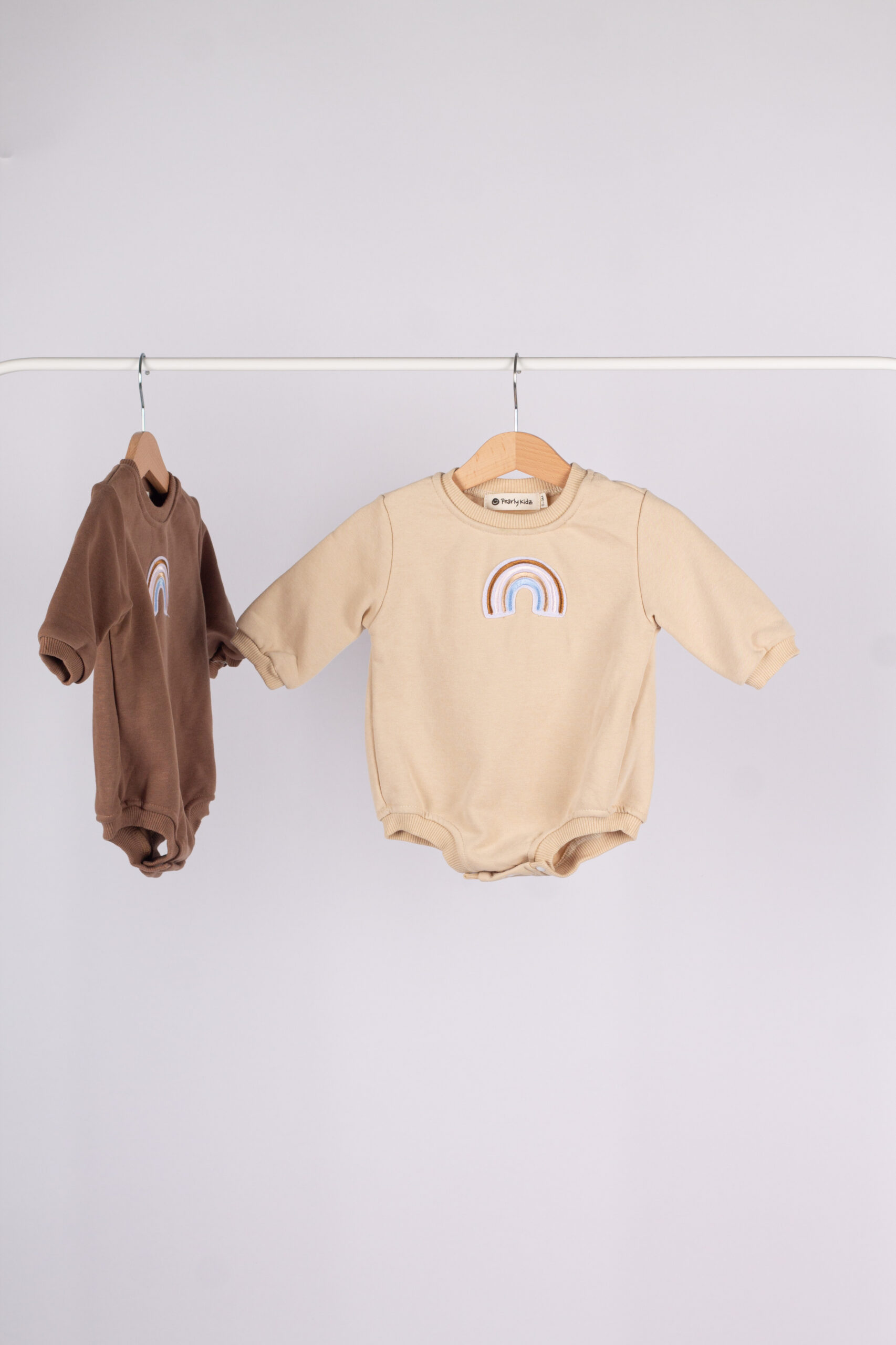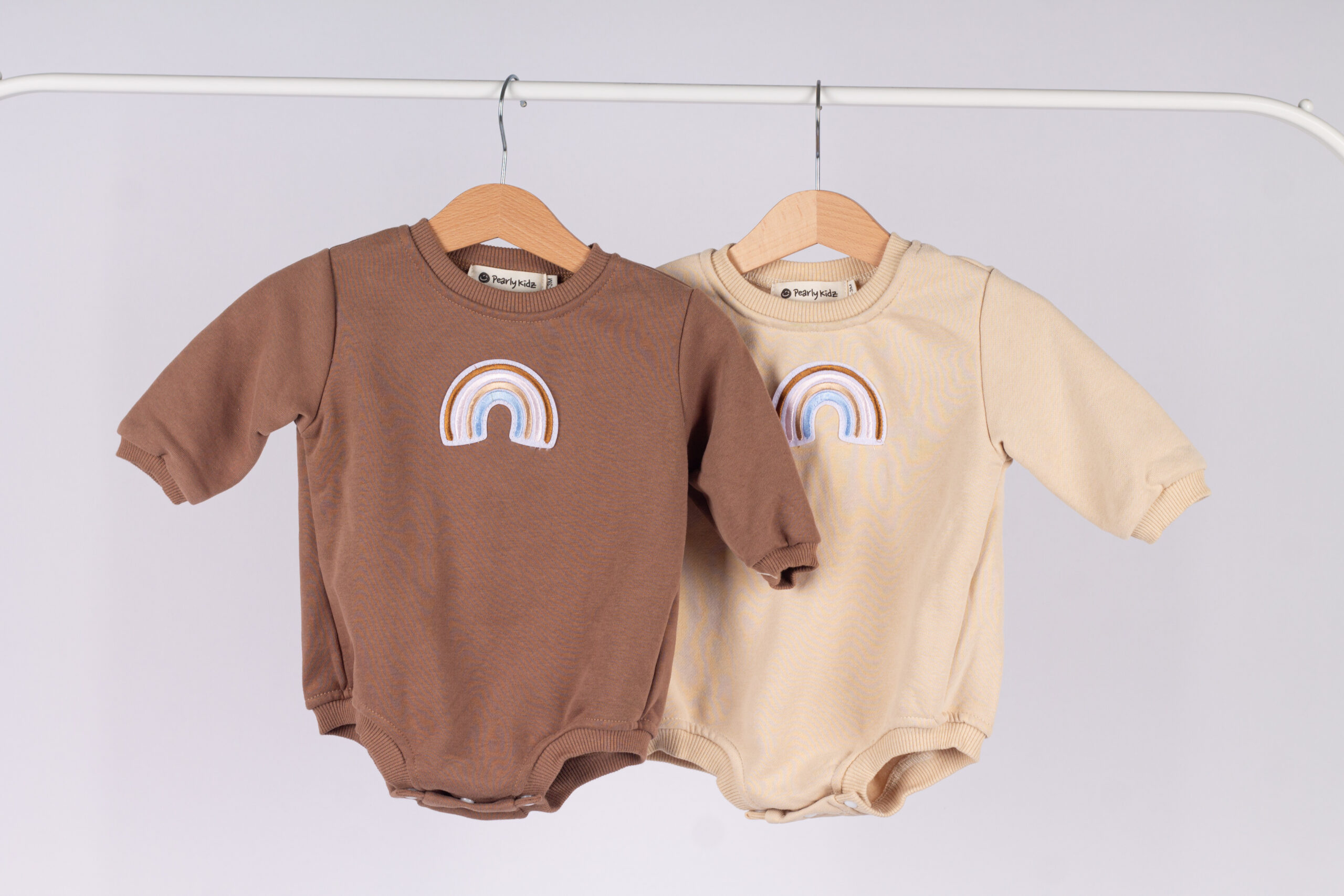 يتميز بتطريز قوس المطر في المنتصف ليضيف لمسة طفولية جذابة، بالإضافة إلى سنابات سفلية لتسهيل تبديل الحفاض بكل سرعة وسهولة.