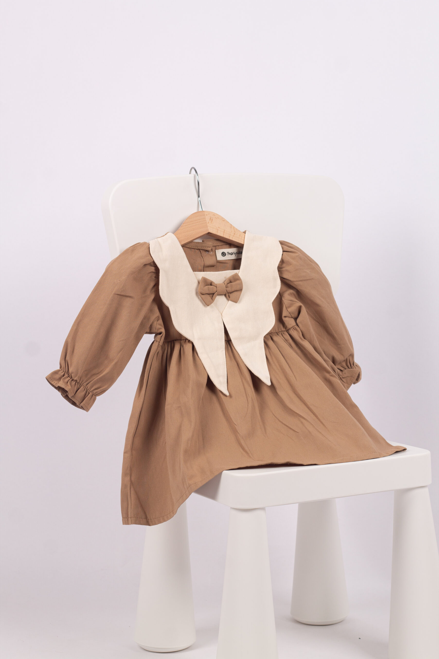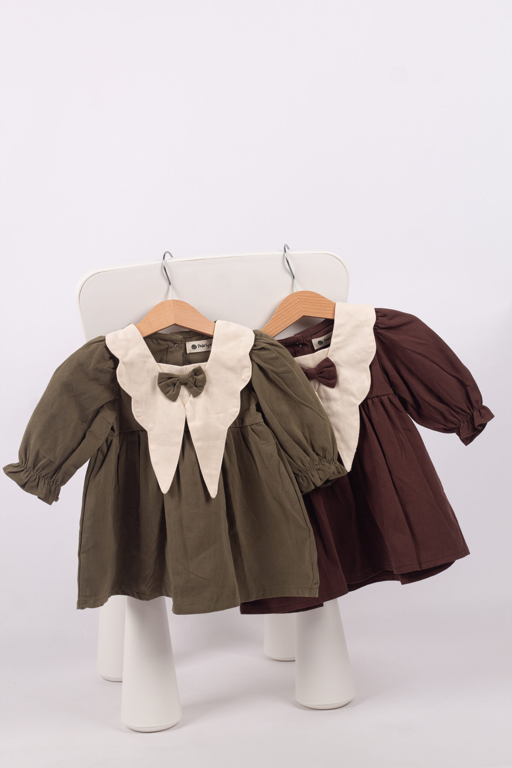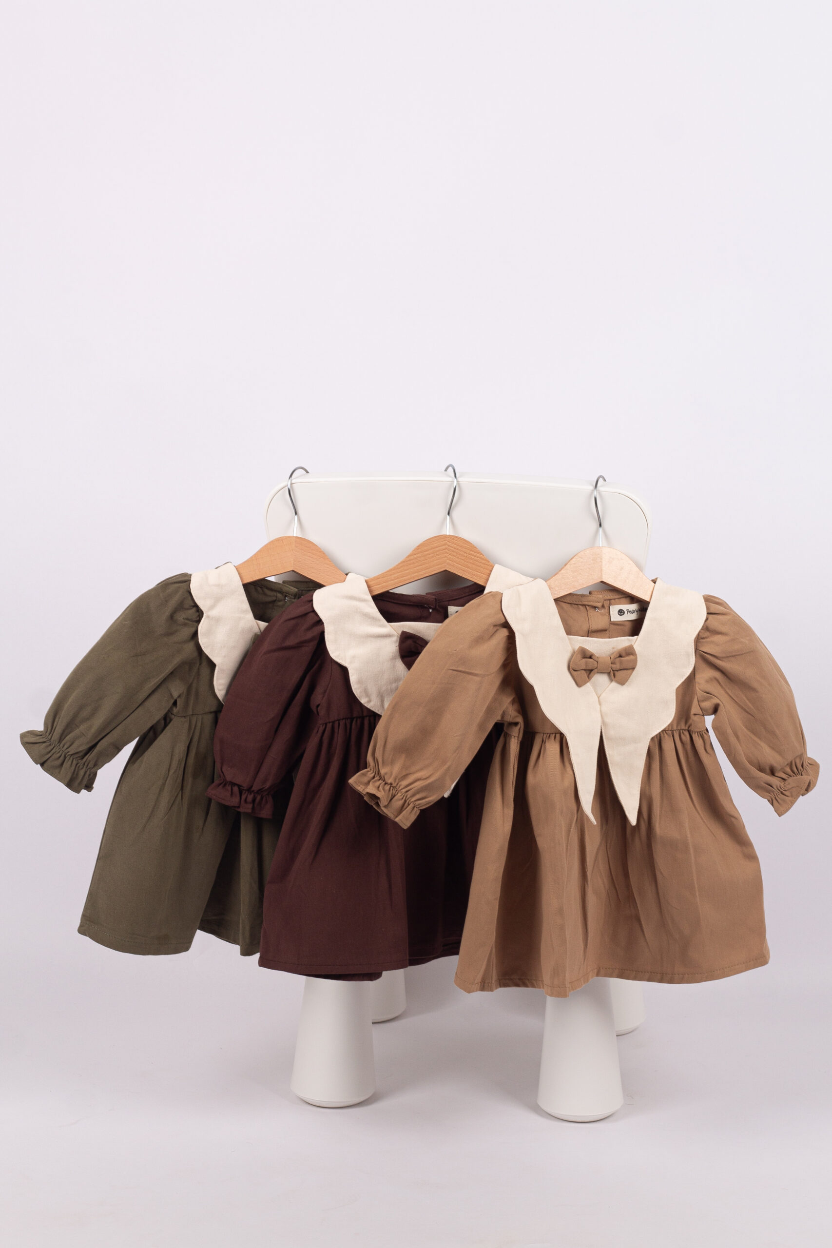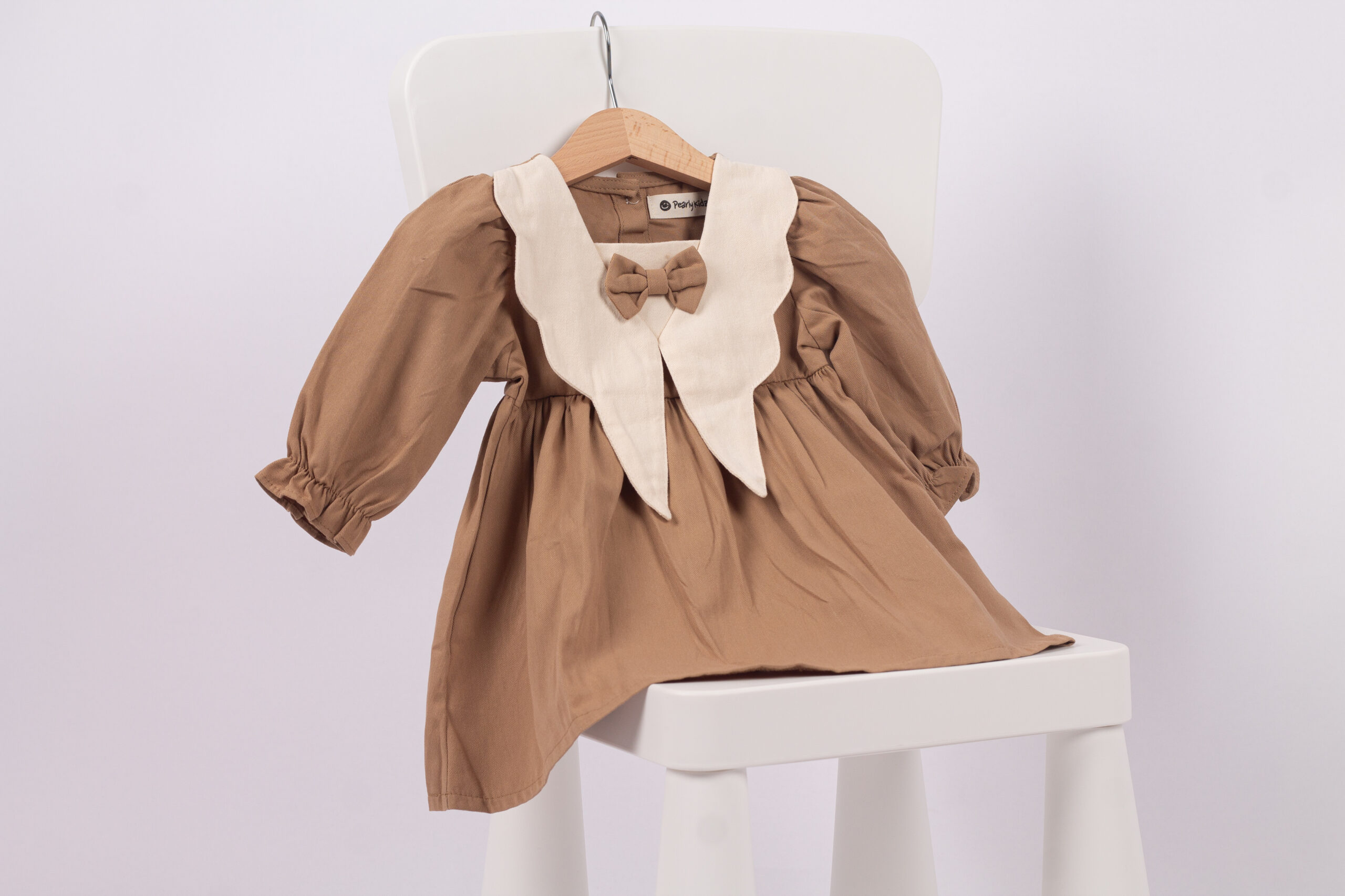 فستان بناتي مصنوع من قطن ناعم بألوان ترابية جميلة، يتميز بياقة كبيرة بلون أوف وايت تضيف لمسة كلاسيكية للفستان، مع فراشة صغيرة في المنتصف لزيادة الأناقة. الأكمام منفوشة بقَبّة مطاطية، وقصة الفستان واسعة ومريحة ومناسبة للبس اليومي والمناسبات البسيطة.