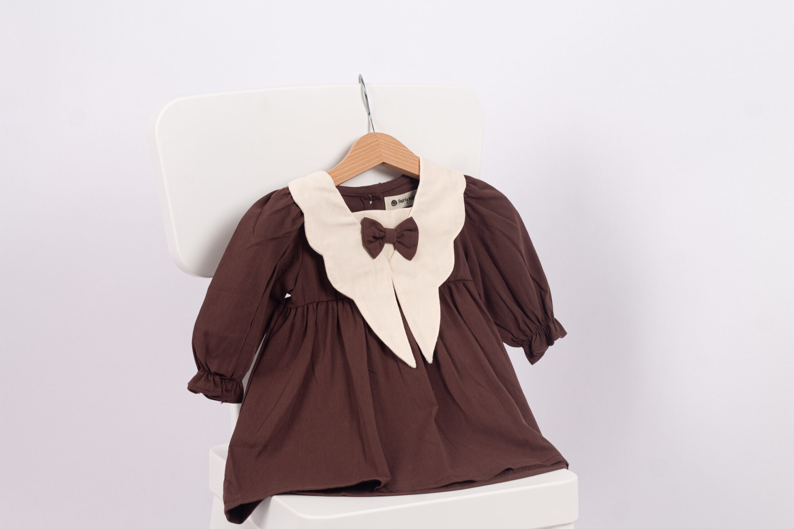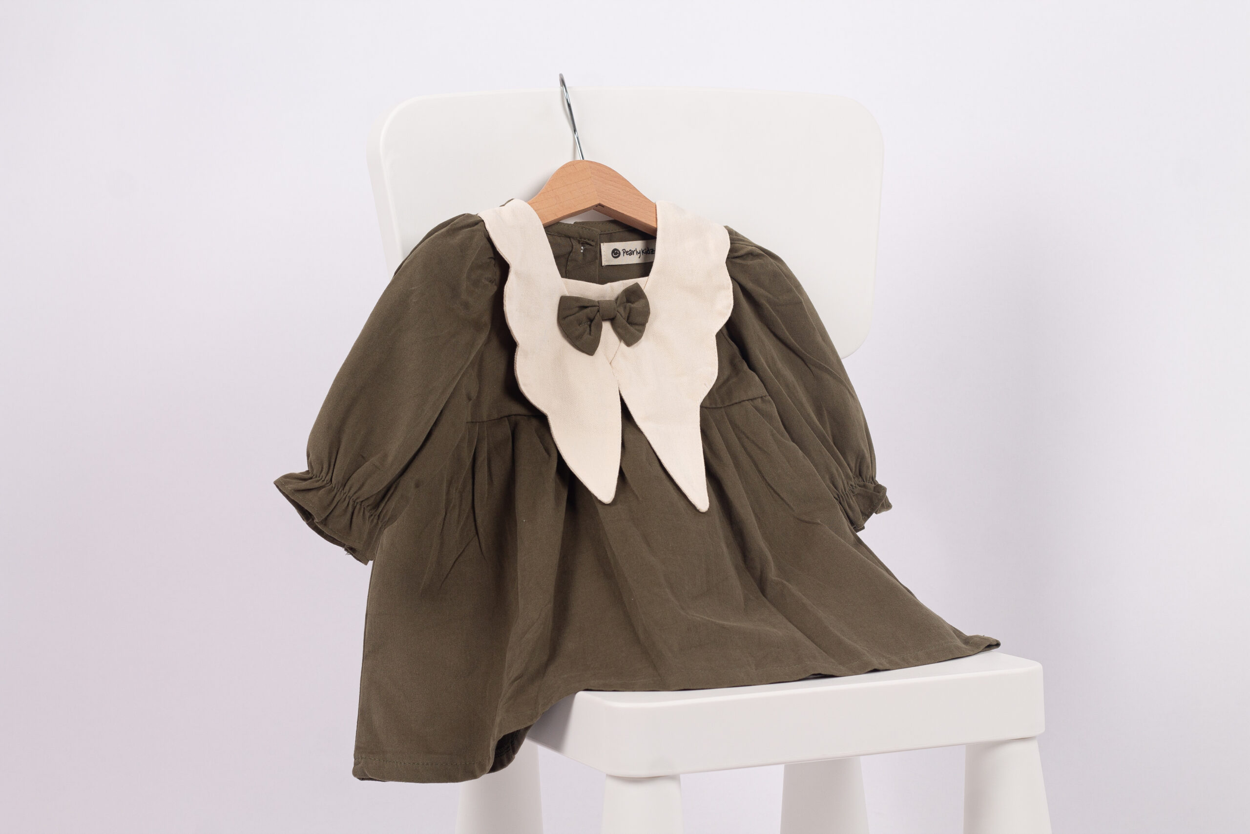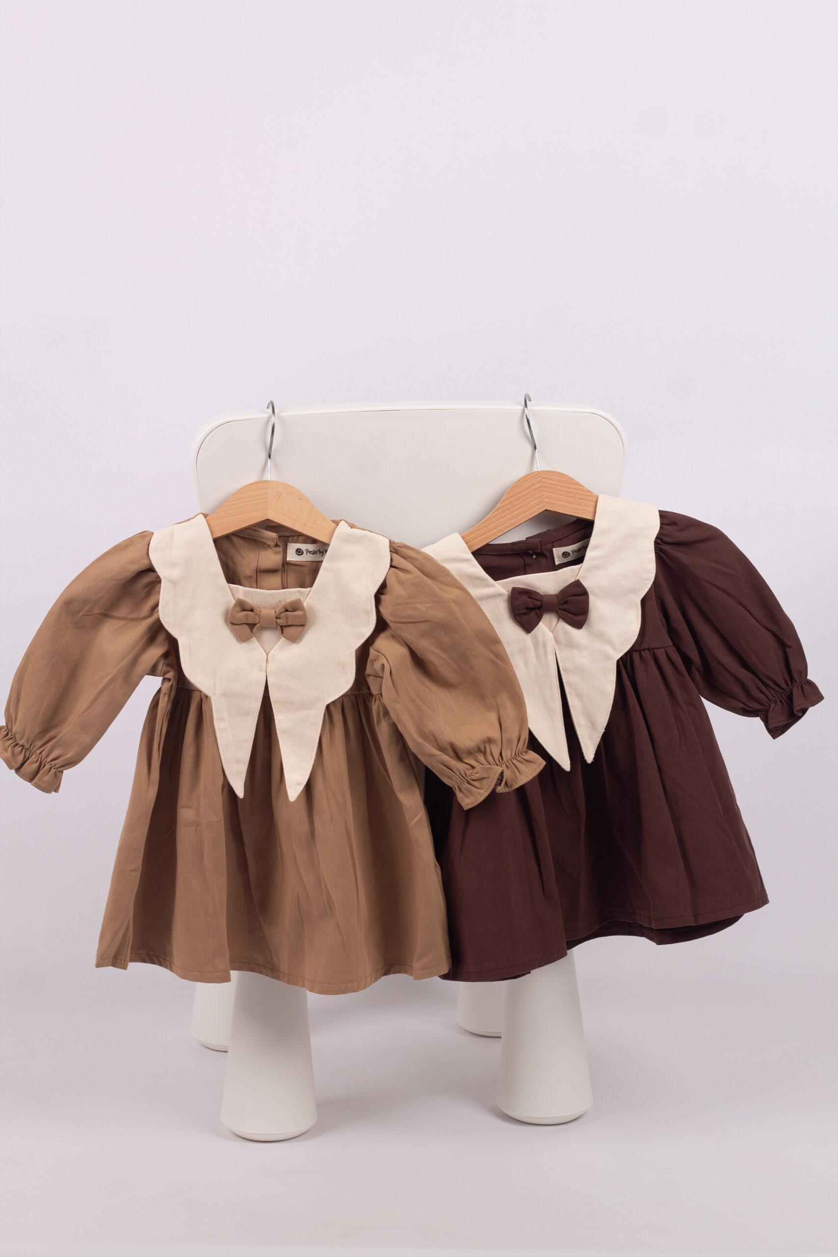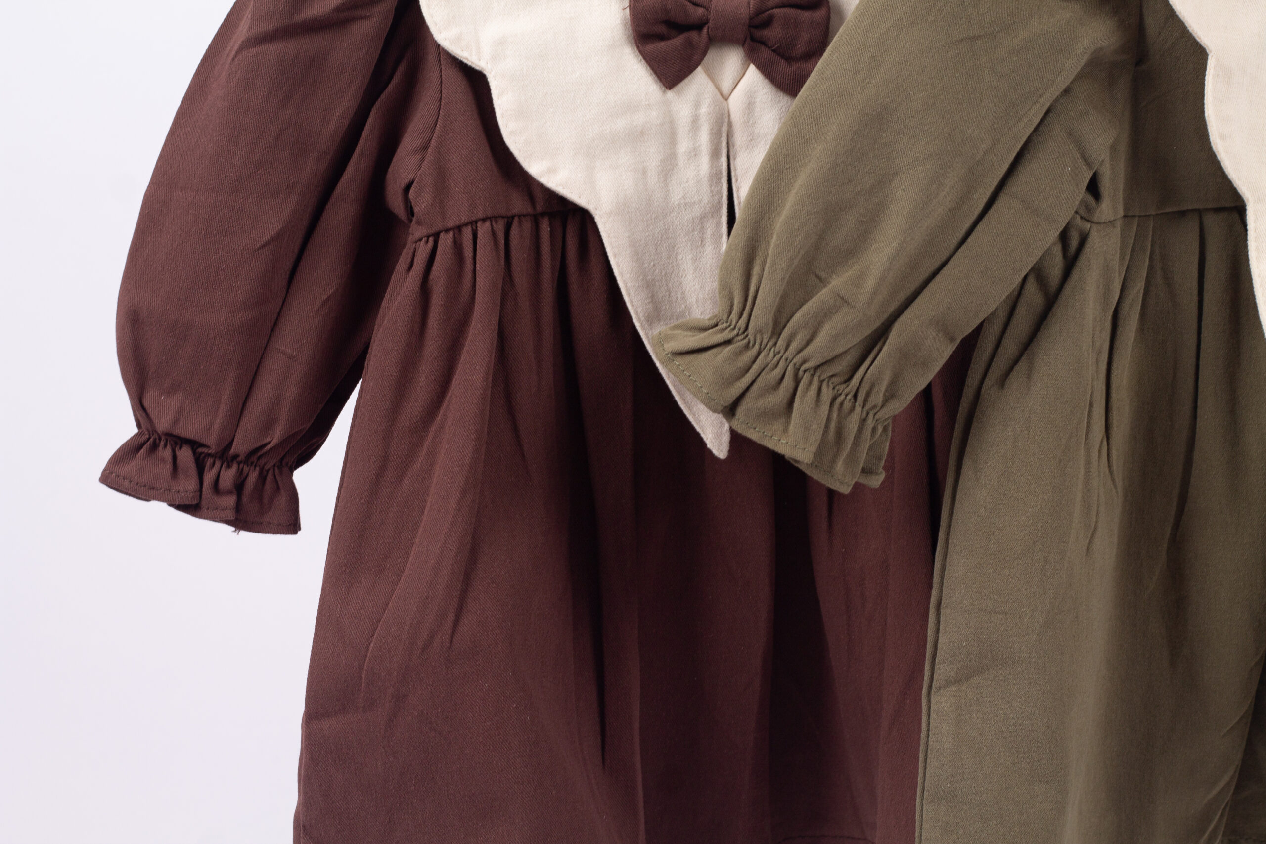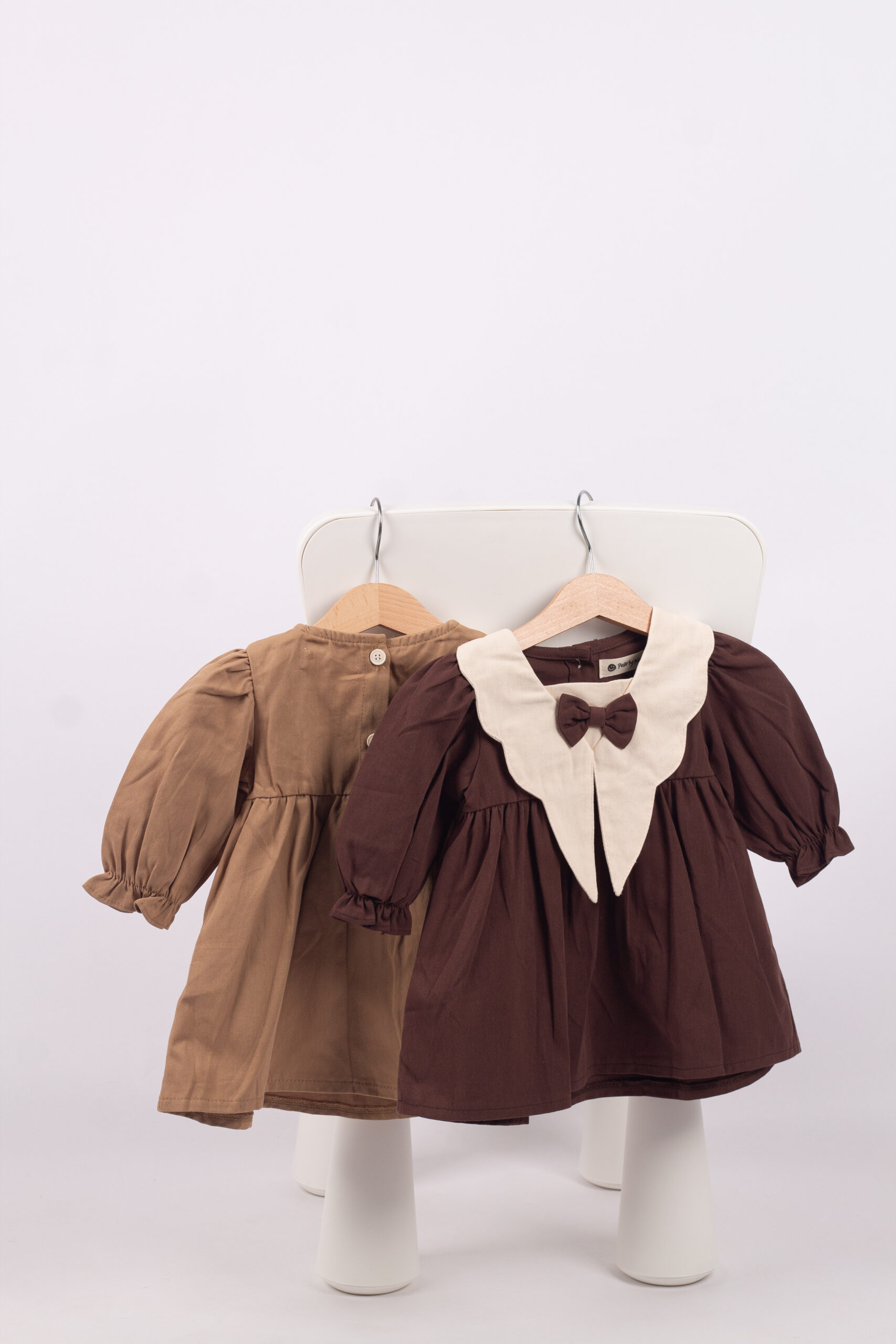 فستان بناتي مصنوع من قطن ناعم بألوان ترابية جميلة، يتميز بياقة كبيرة بلون أوف وايت تضيف لمسة كلاسيكية للفستان، مع فراشة صغيرة في المنتصف لزيادة الأناقة. الأكمام منفوشة بقَبّة مطاطية، وقصة الفستان واسعة ومريحة ومناسبة للبس اليومي والمناسبات البسيطة.