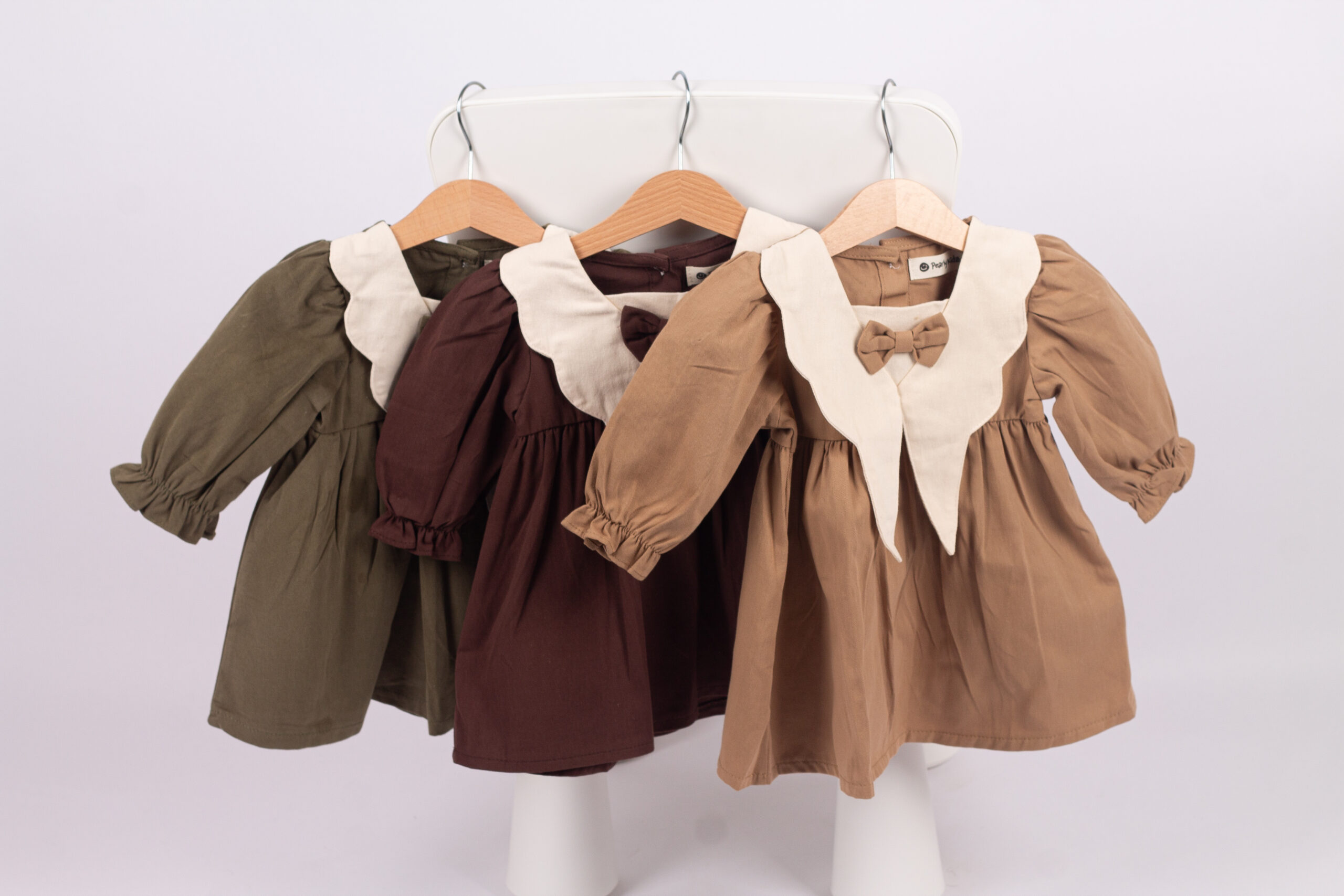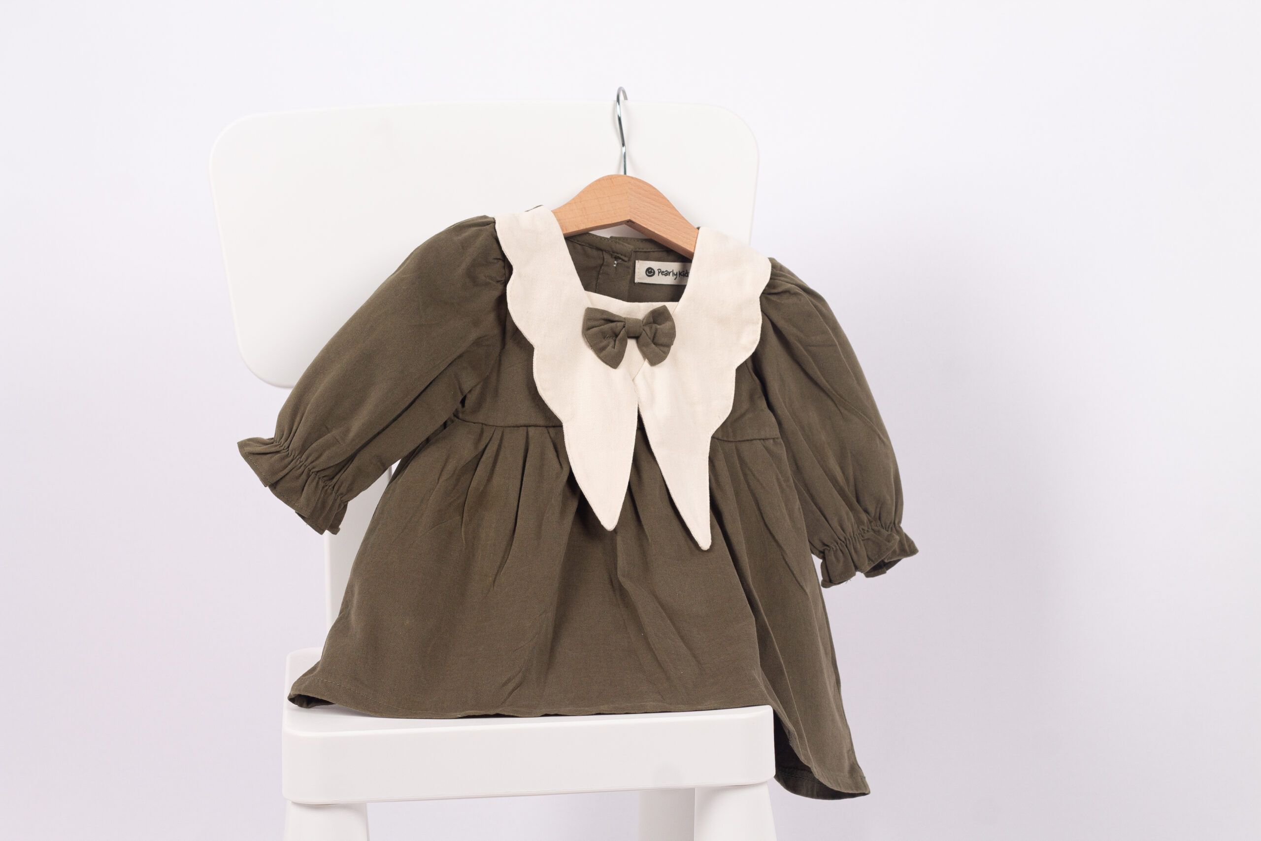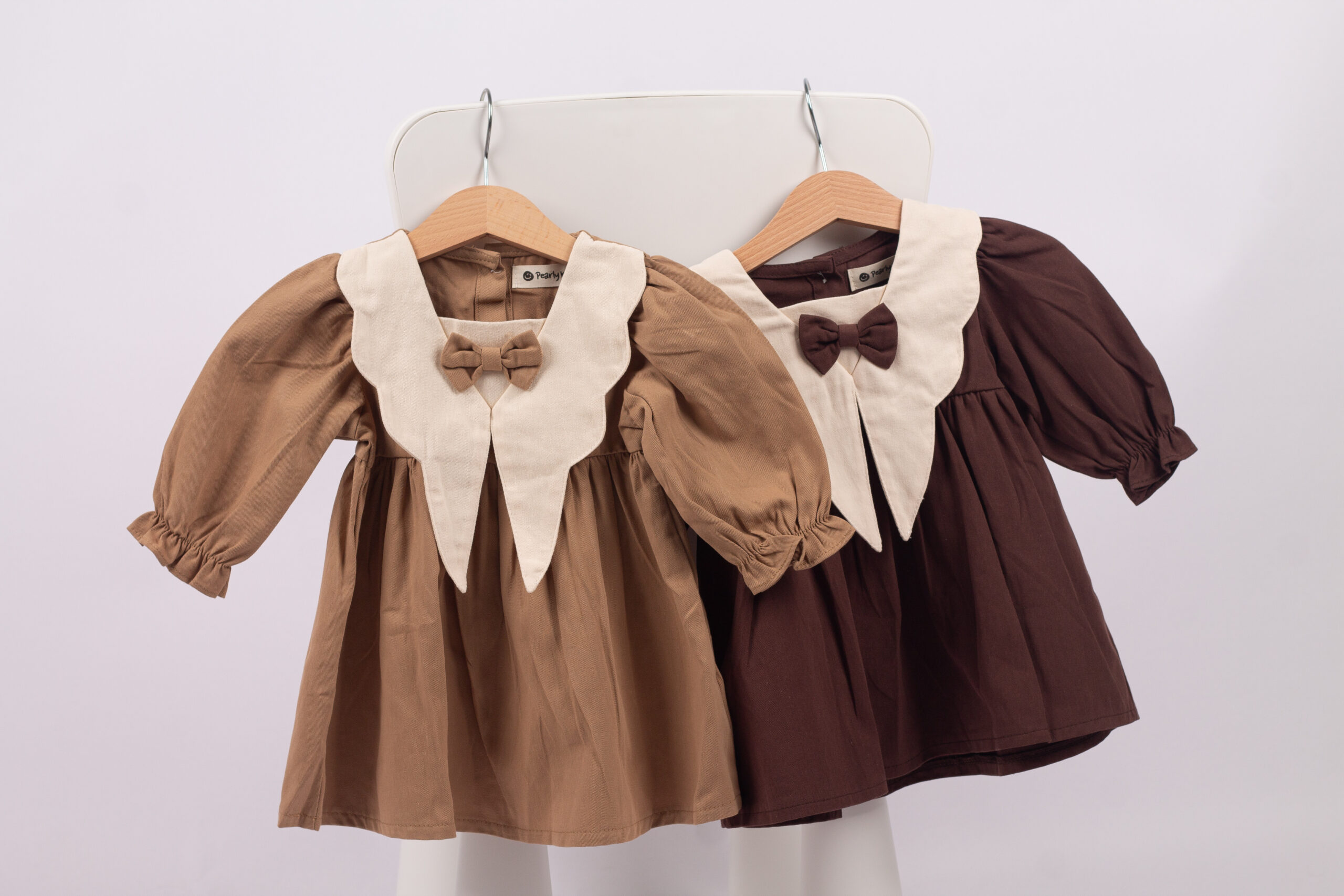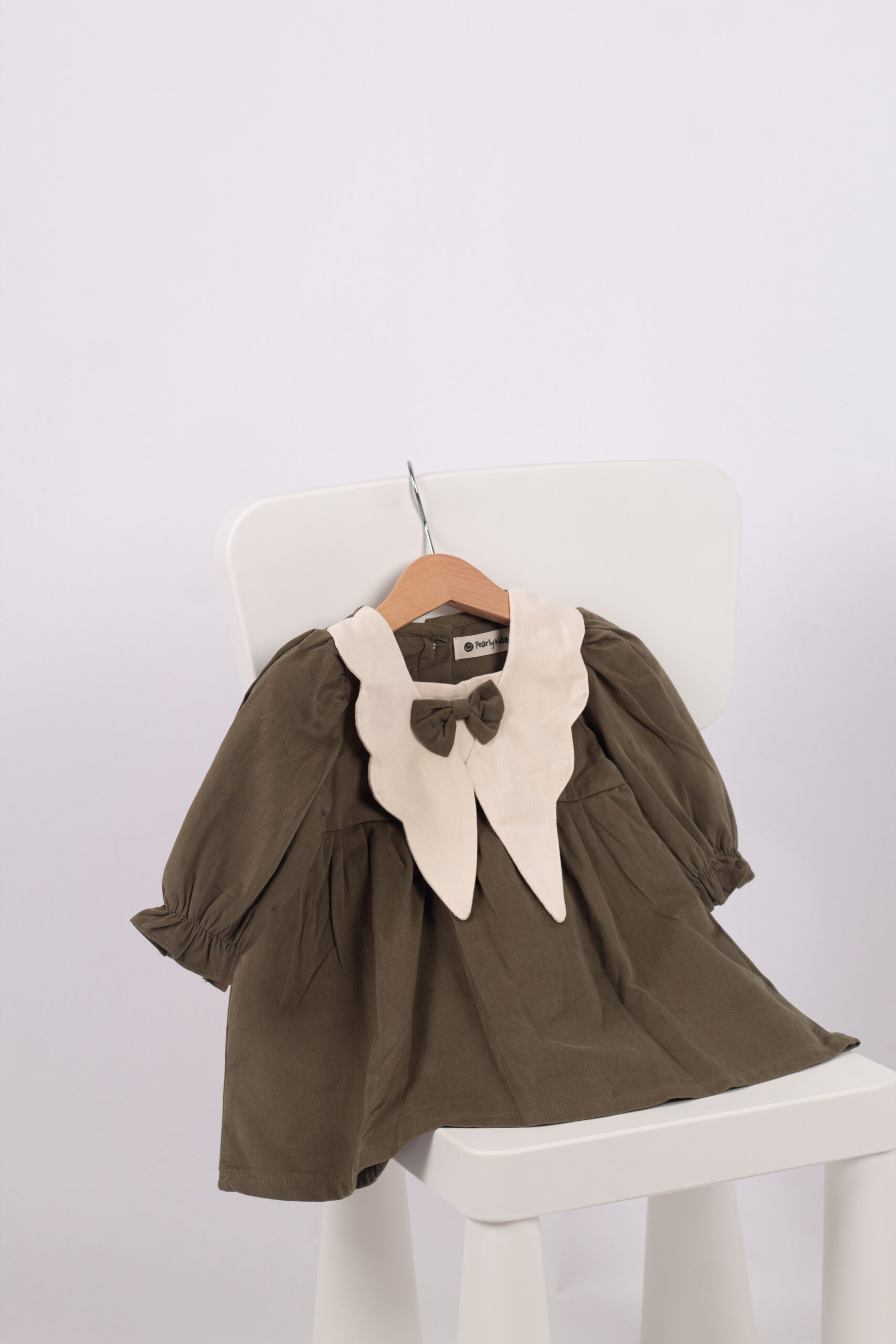 فستان بناتي مصنوع من قطن ناعم بألوان ترابية جميلة، يتميز بياقة كبيرة بلون أوف وايت تضيف لمسة كلاسيكية للفستان، مع فراشة صغيرة في المنتصف لزيادة الأناقة. الأكمام منفوشة بقَبّة مطاطية، وقصة الفستان واسعة ومريحة ومناسبة للبس اليومي والمناسبات البسيطة.