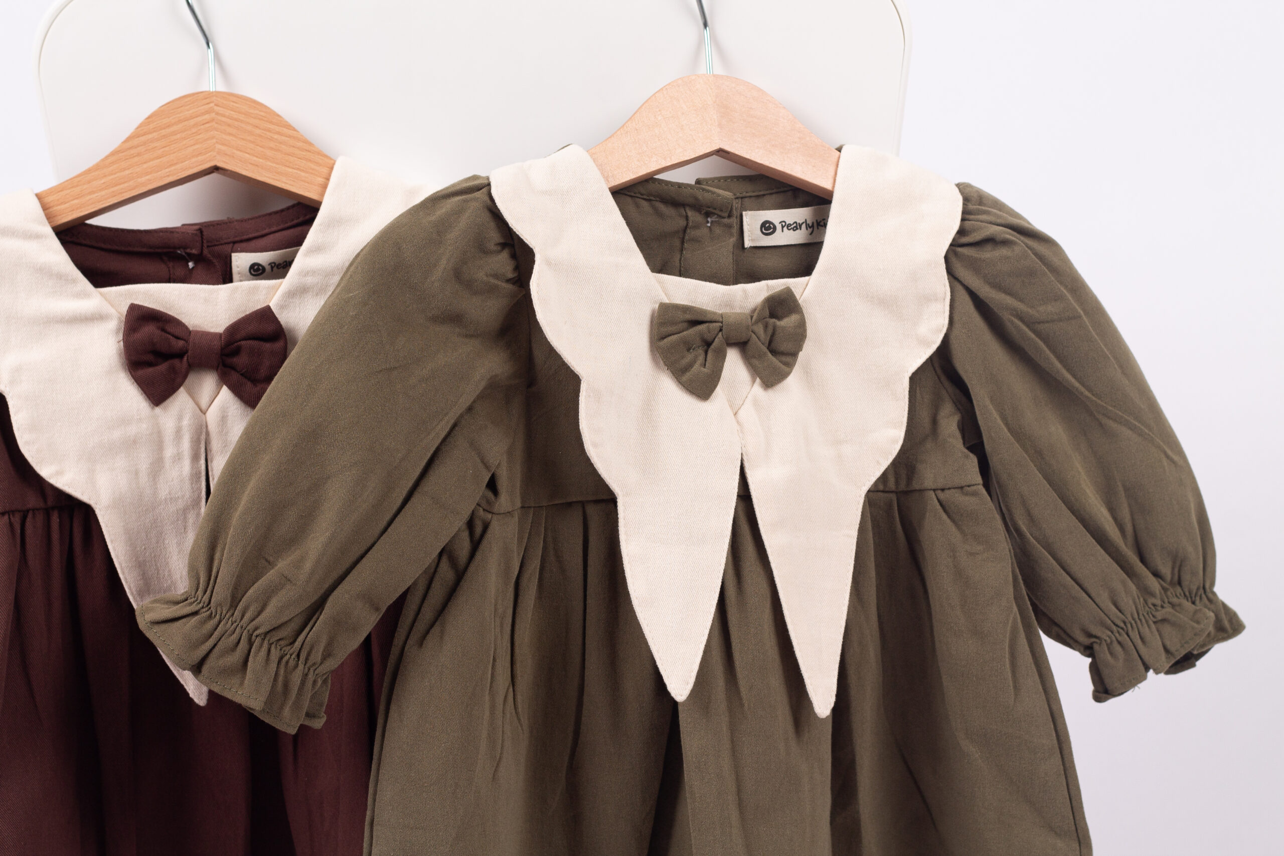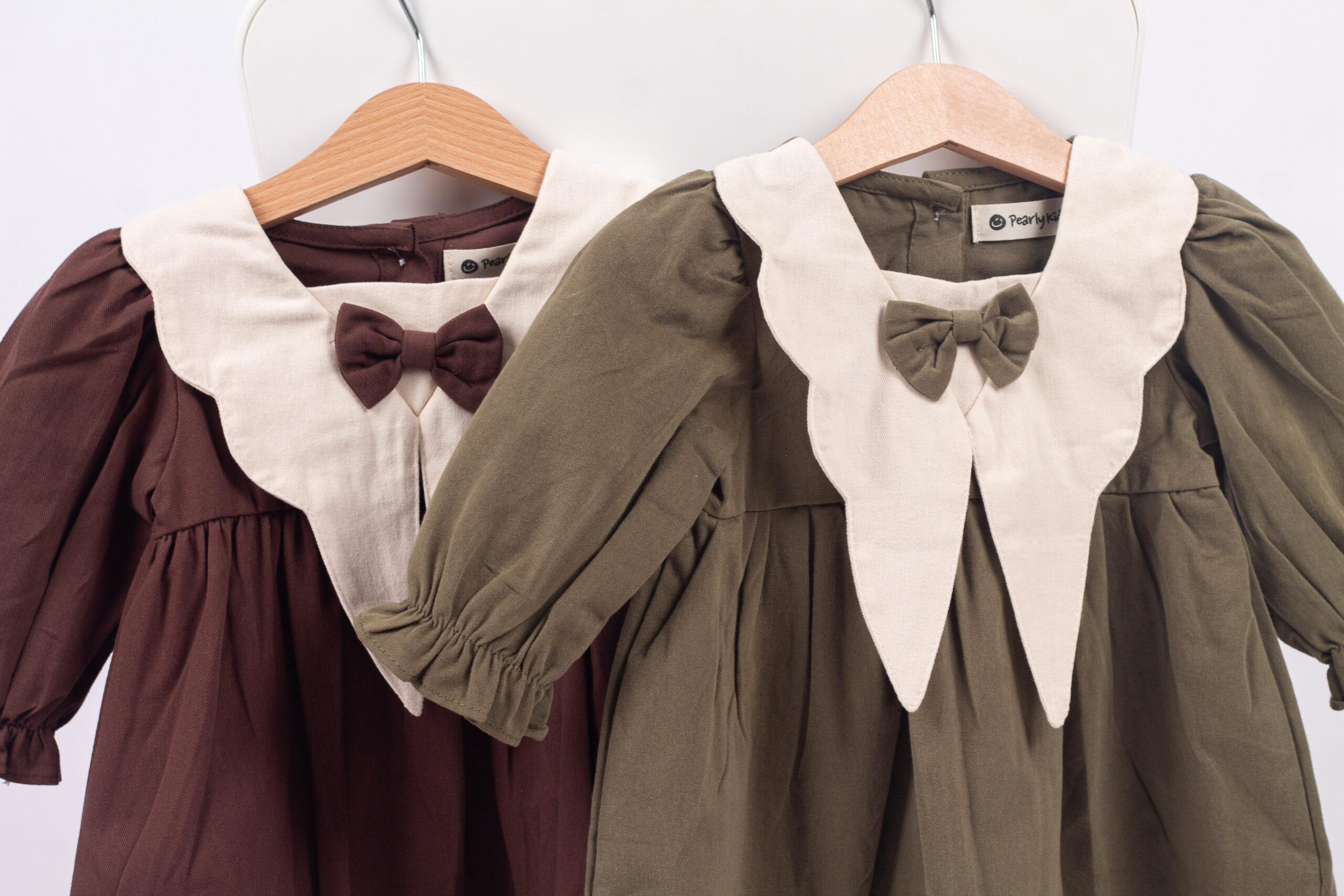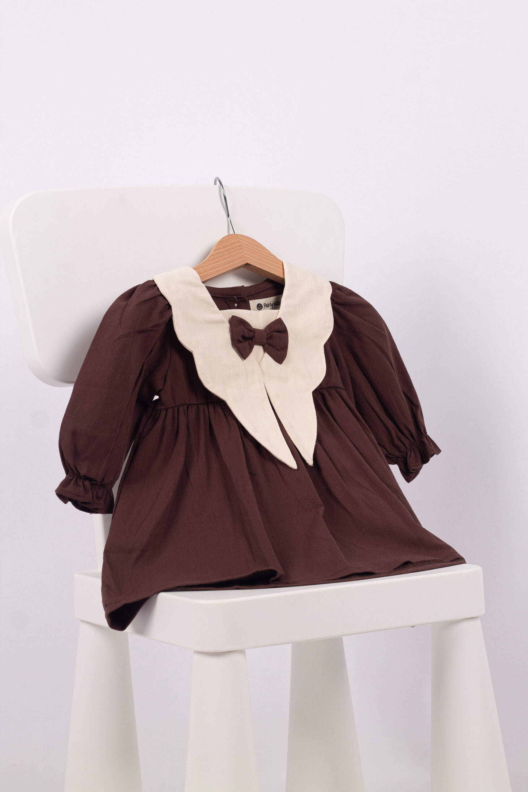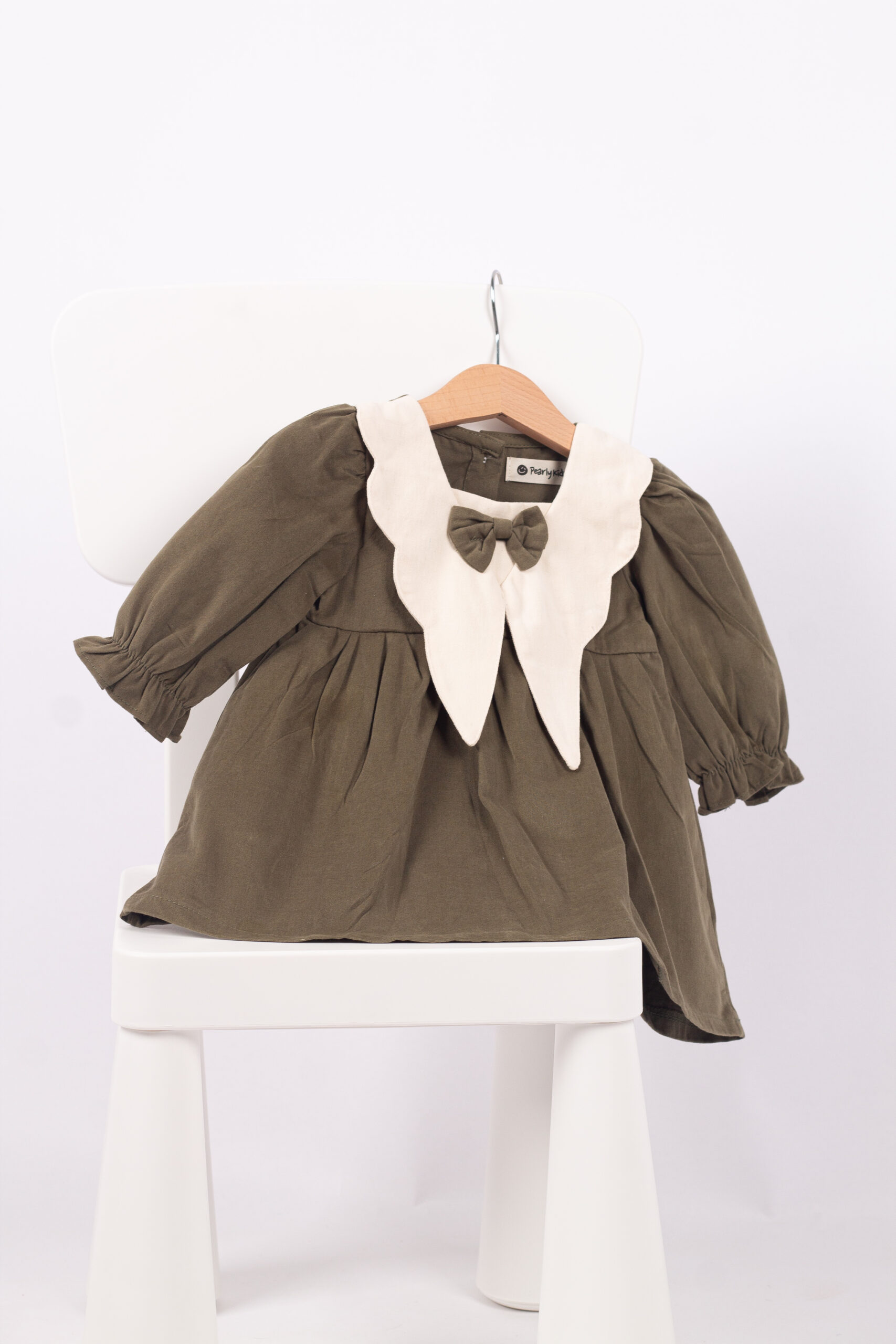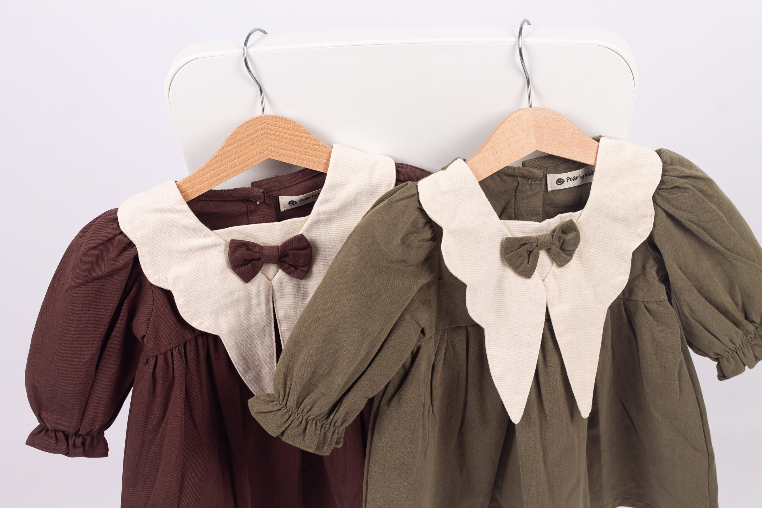 فستان بناتي مصنوع من قطن ناعم بألوان ترابية جميلة، يتميز بياقة كبيرة بلون أوف وايت تضيف لمسة كلاسيكية للفستان، مع فراشة صغيرة في المنتصف لزيادة الأناقة. الأكمام منفوشة بقَبّة مطاطية، وقصة الفستان واسعة ومريحة ومناسبة للبس اليومي والمناسبات البسيطة.
