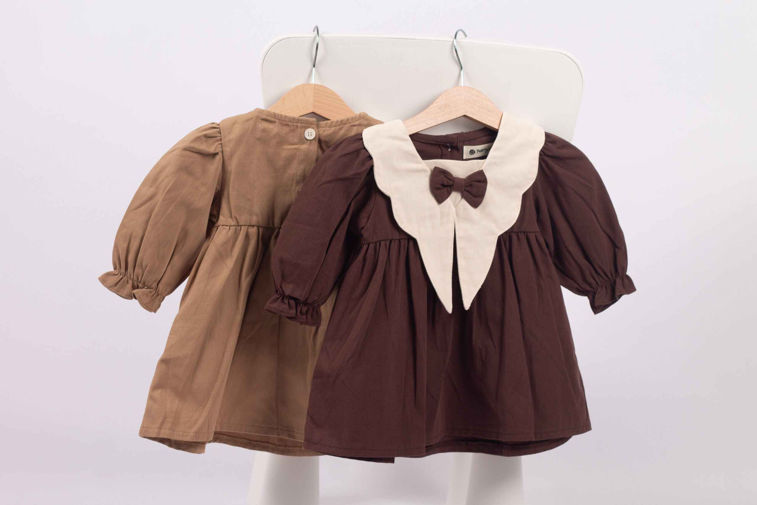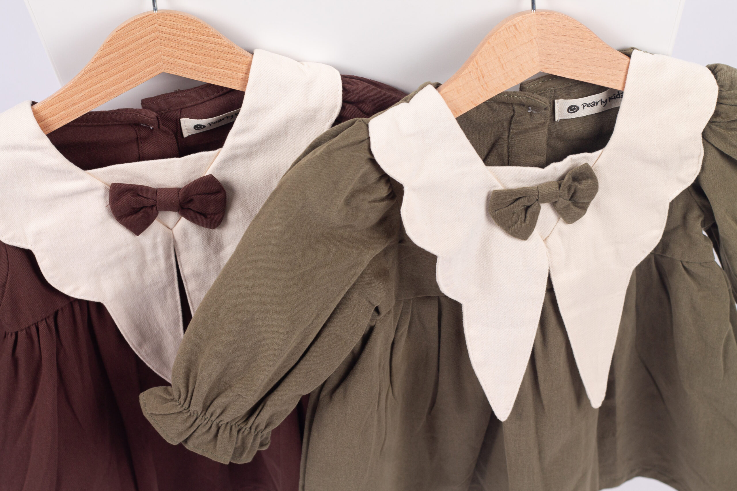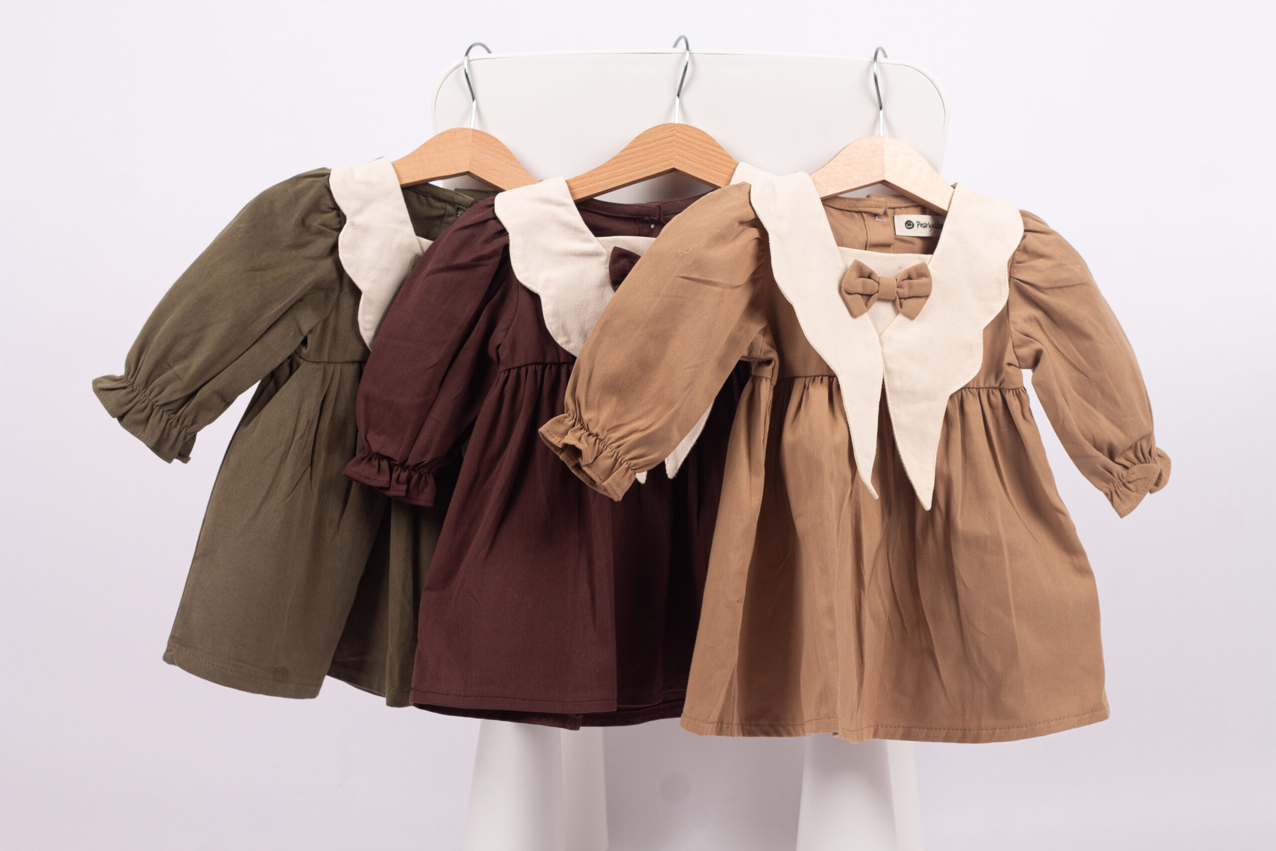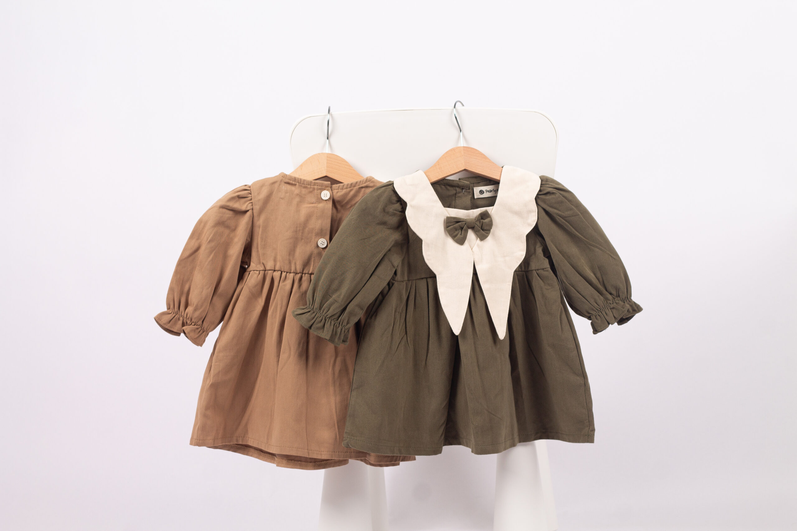 فستان بناتي مصنوع من قطن ناعم بألوان ترابية جميلة، يتميز بياقة كبيرة بلون أوف وايت تضيف لمسة كلاسيكية للفستان، مع فراشة صغيرة في المنتصف لزيادة الأناقة. الأكمام منفوشة بقَبّة مطاطية، وقصة الفستان واسعة ومريحة ومناسبة للبس اليومي والمناسبات البسيطة.