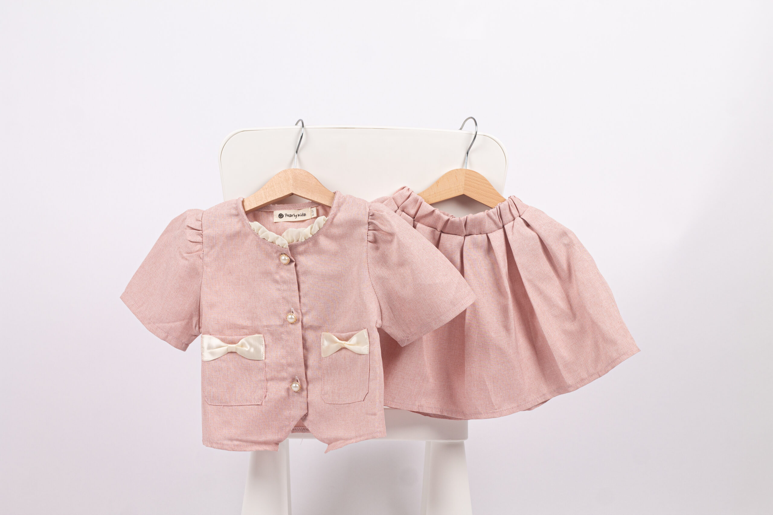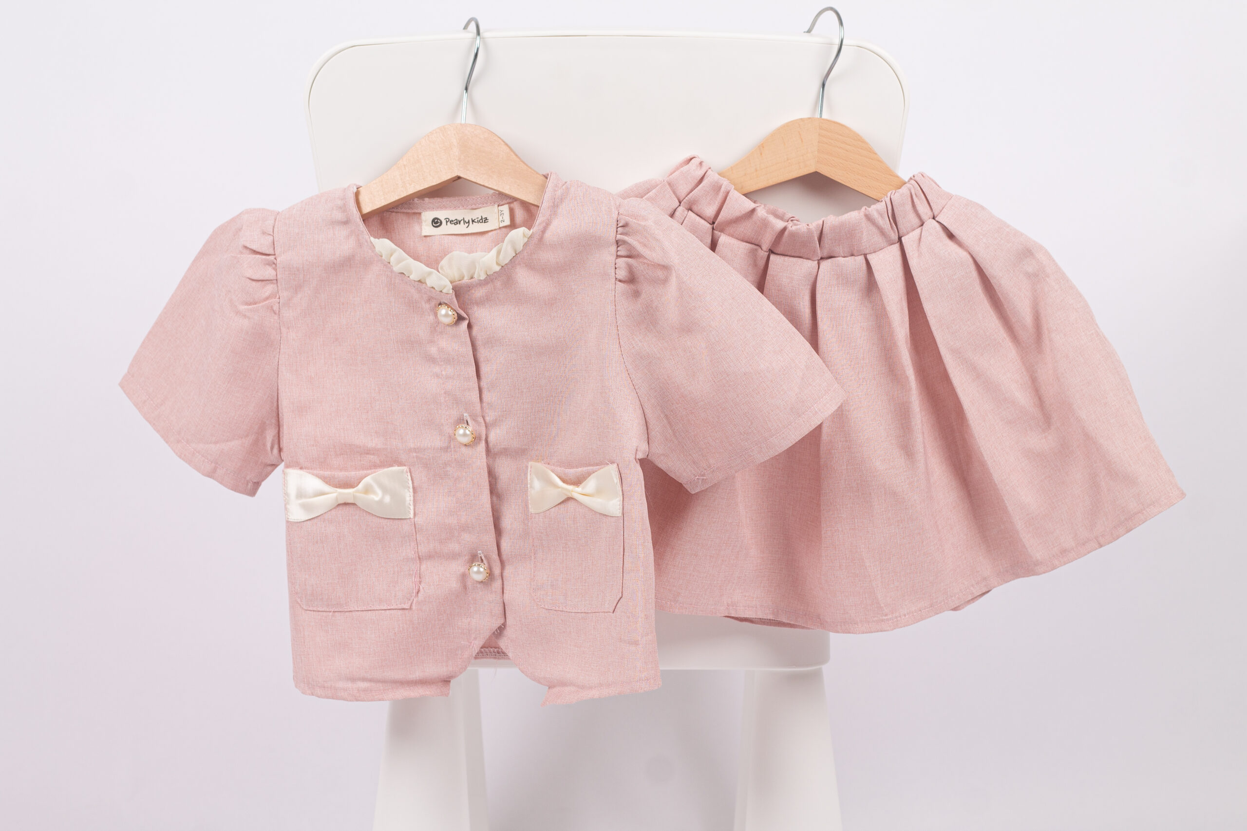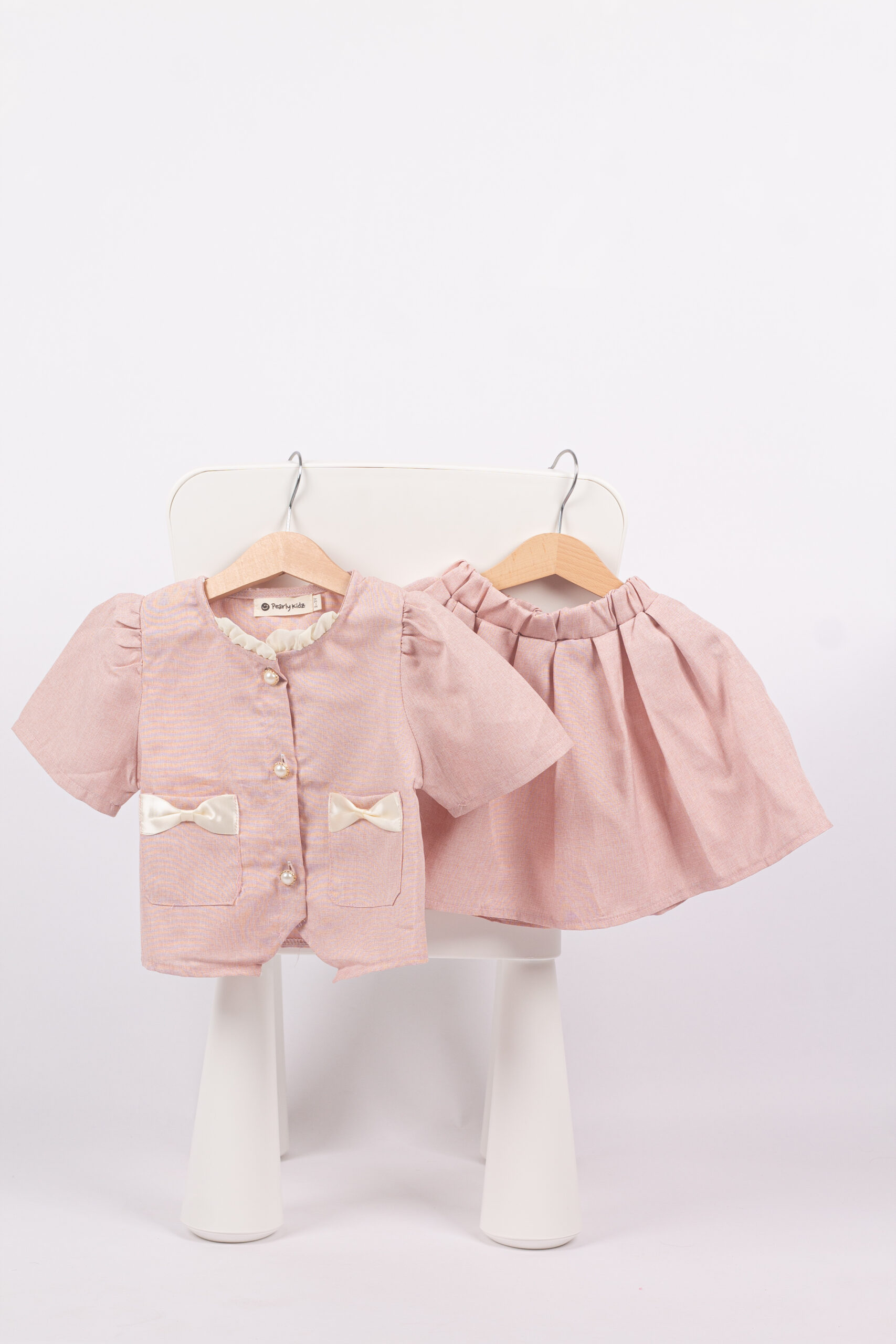 طقم بناتي أنيق يتكوّن من بلوزة وردية قصيرة بأزرار أمامية وجيوب مزينة بفيونكات عاجية ناعمة، مع تنورة واسعة مريحة بخصر مطاطي. خامة الطقم خفيفة وناعمة، ومناسب للبس اليومي والمناسبات البسيطة. تصميم بسيط ومهندم يعطي إطلالة لطيفة ومرتّبة للبنات.