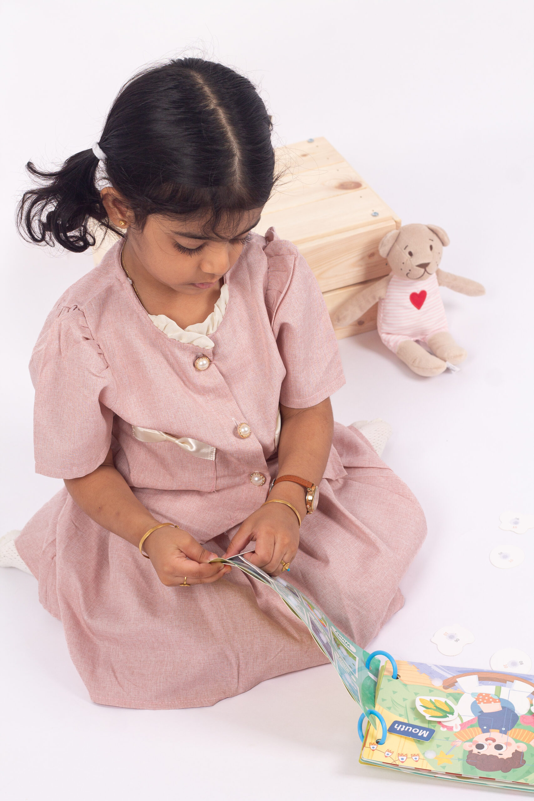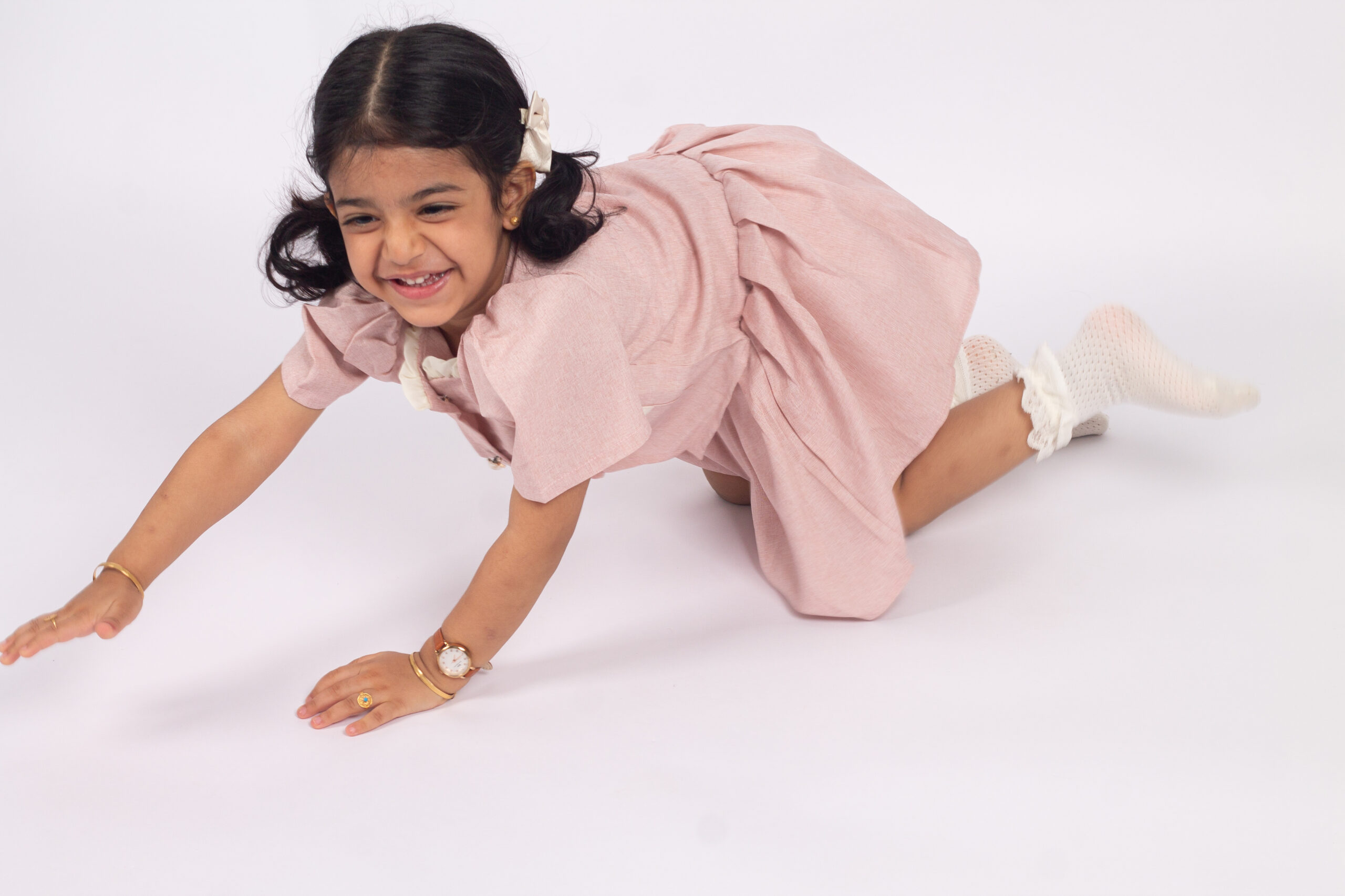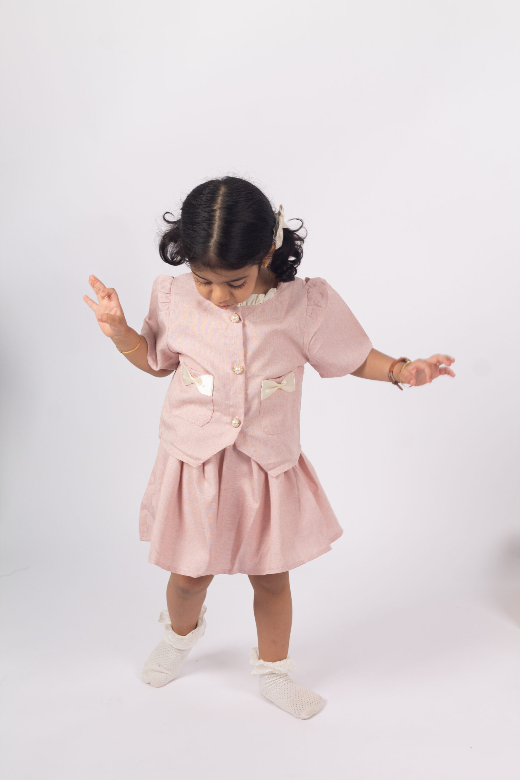 طقم بناتي أنيق يتكوّن من بلوزة وردية قصيرة بأزرار أمامية وجيوب مزينة بفيونكات عاجية ناعمة، مع تنورة واسعة مريحة بخصر مطاطي. خامة الطقم خفيفة وناعمة، ومناسب للبس اليومي والمناسبات البسيطة. تصميم بسيط ومهندم يعطي إطلالة لطيفة ومرتّبة للبنات.