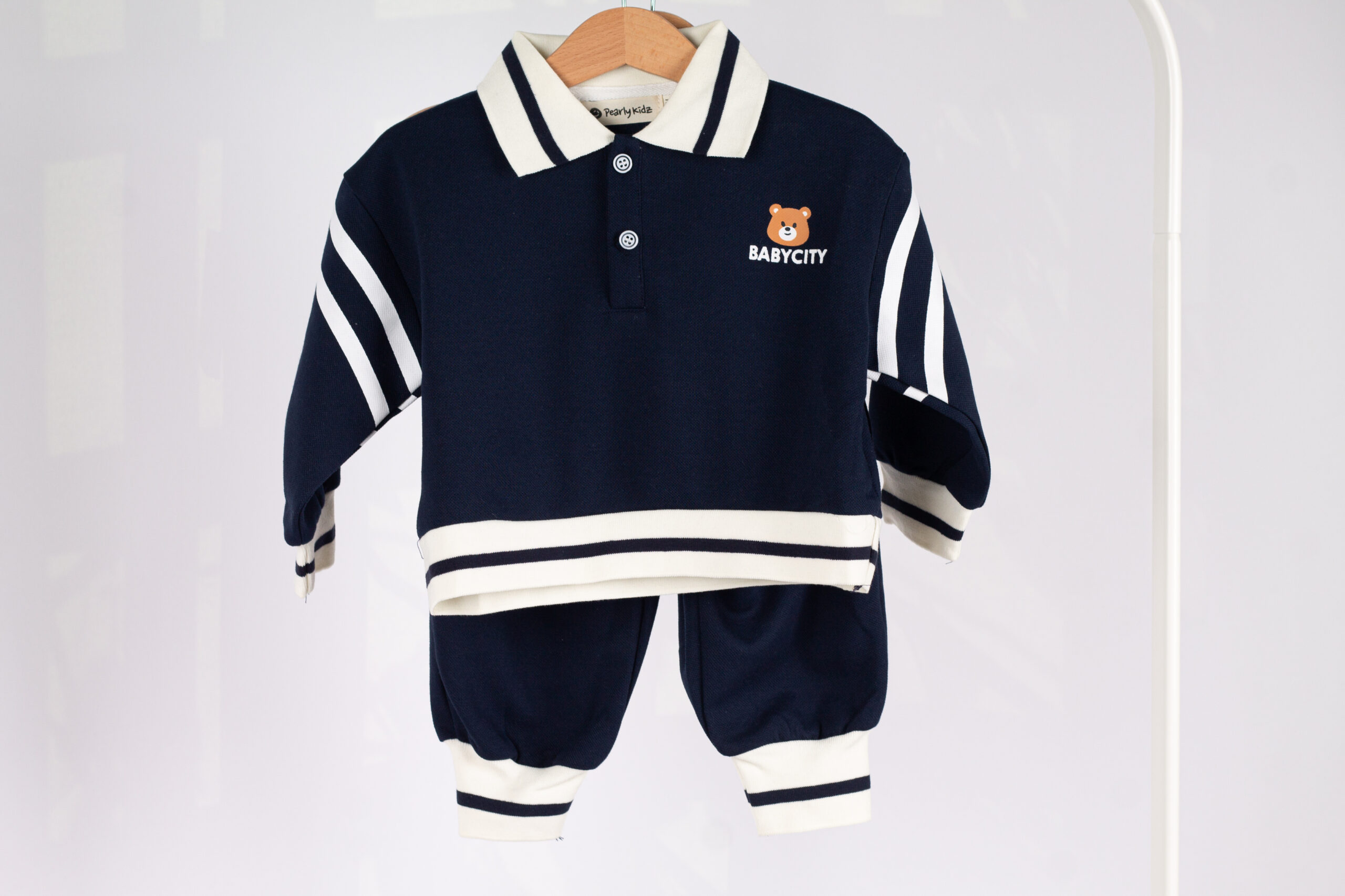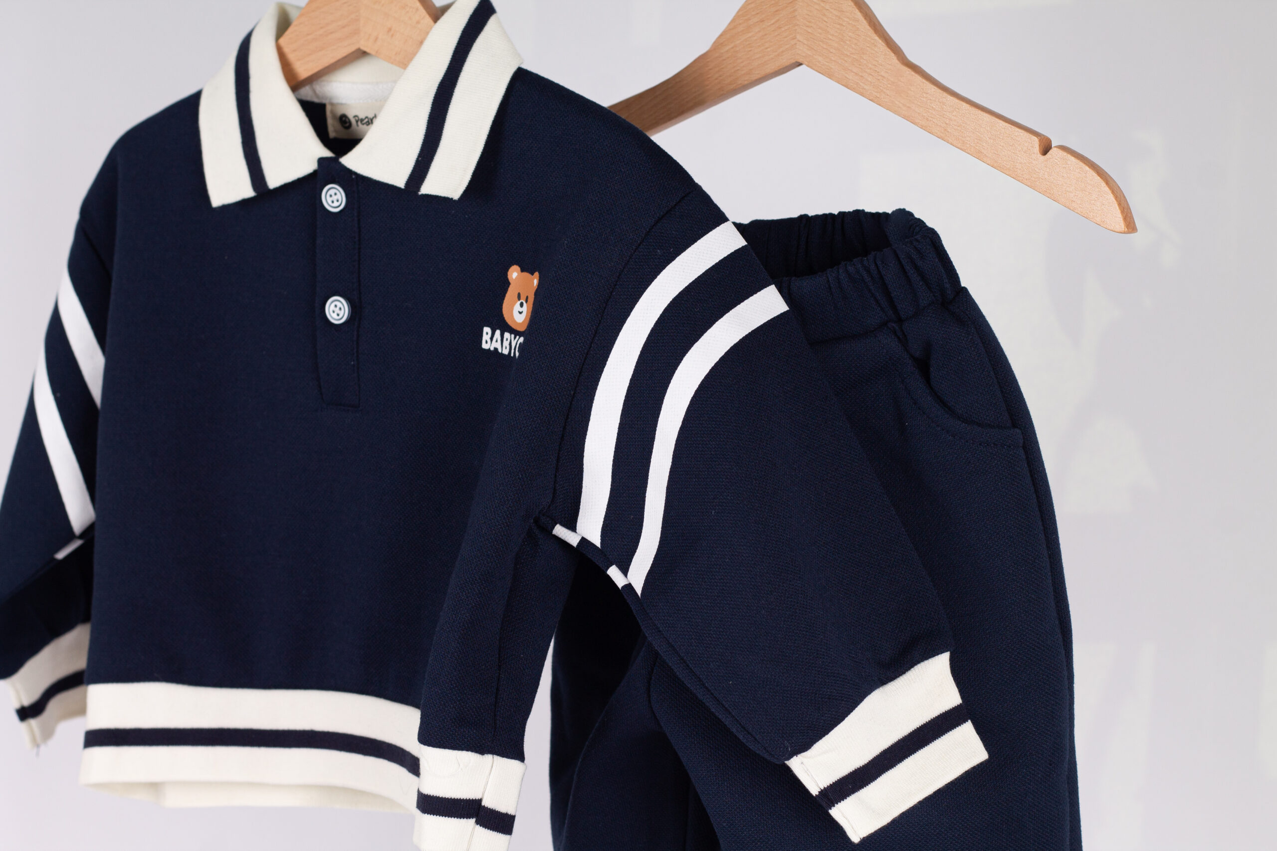 طقم أنيق وكاجوال لإطلالة يومية مرتّبة، مكوّن من تيشيرت بولو بتفاصيل مخططة كلاسيكية مع بنطال مريح مناسب للحركة واللعب.