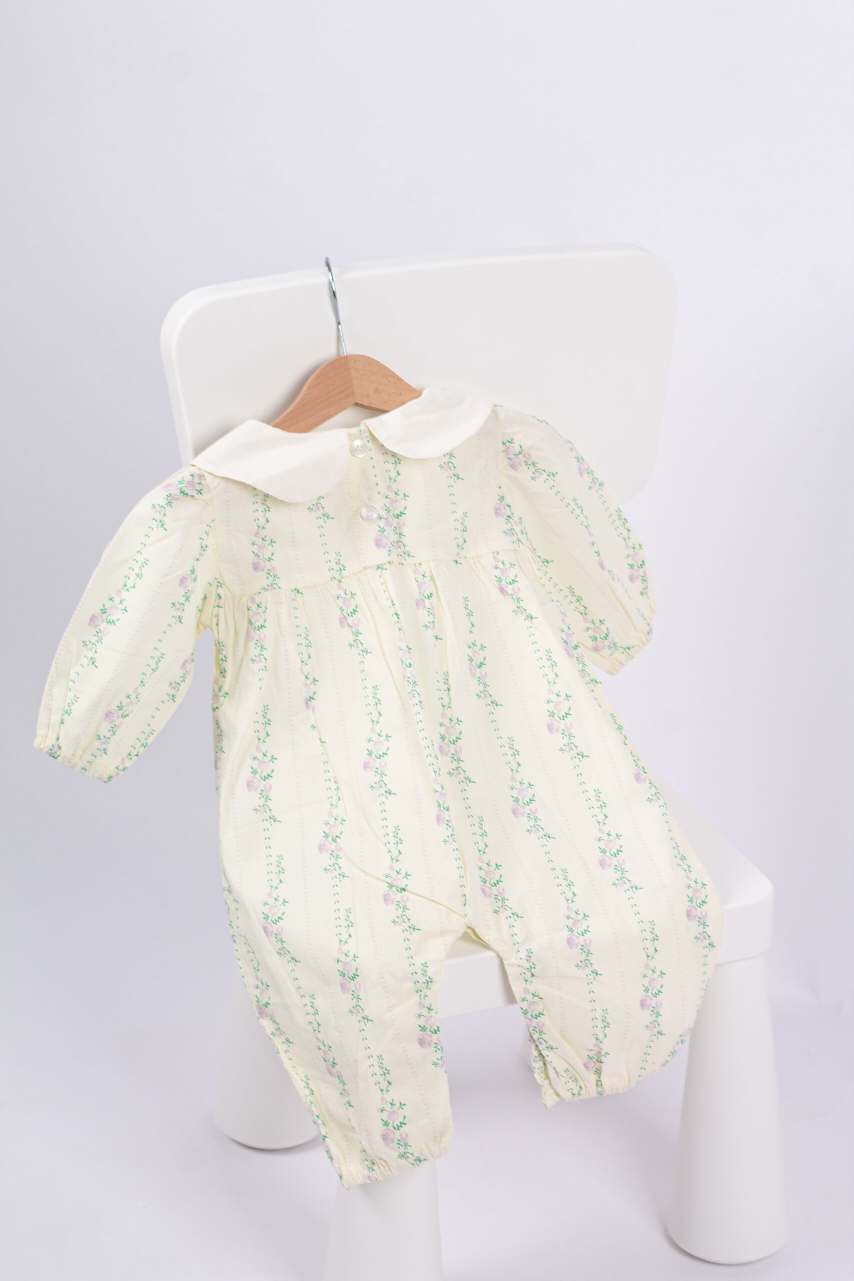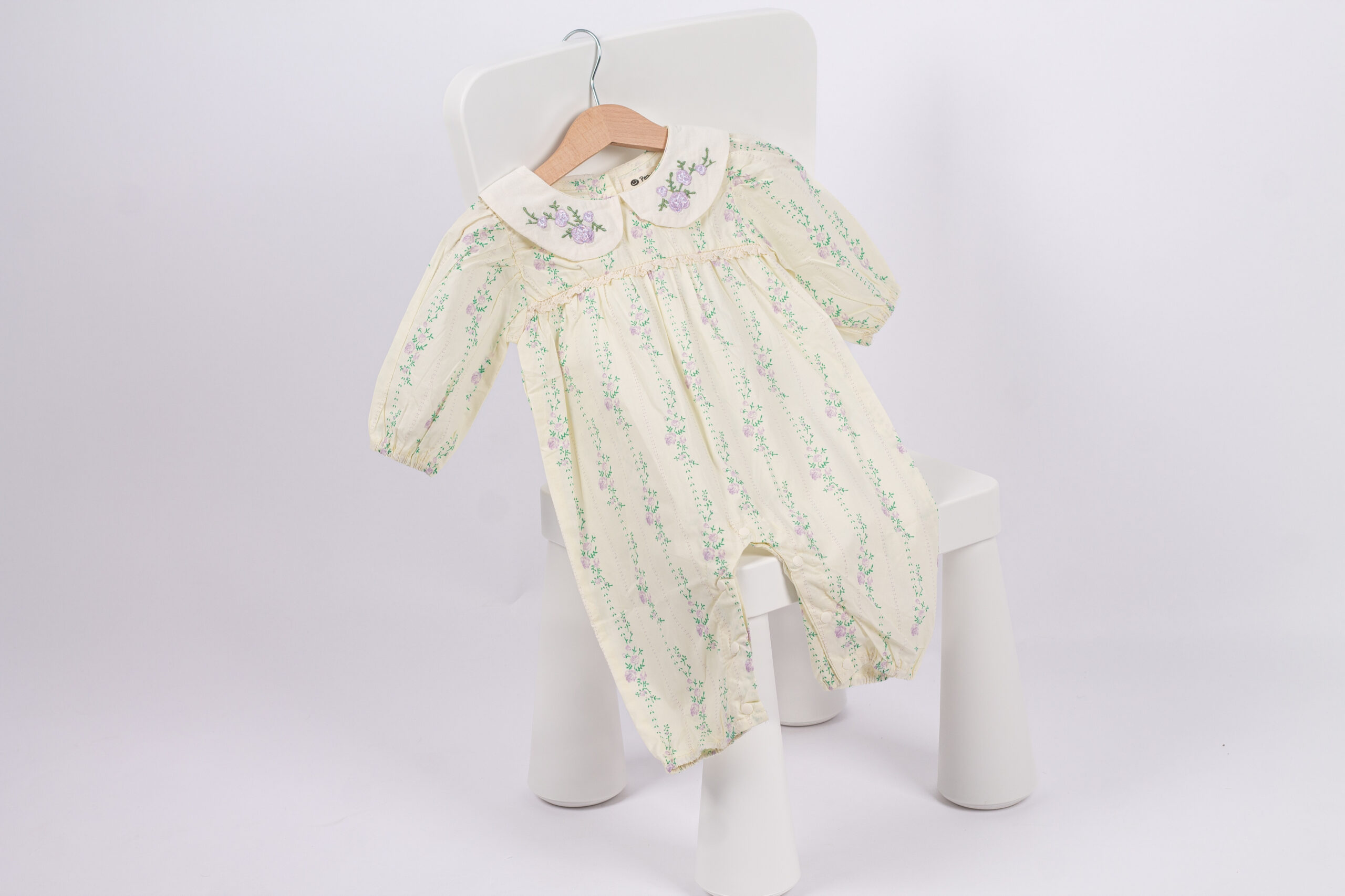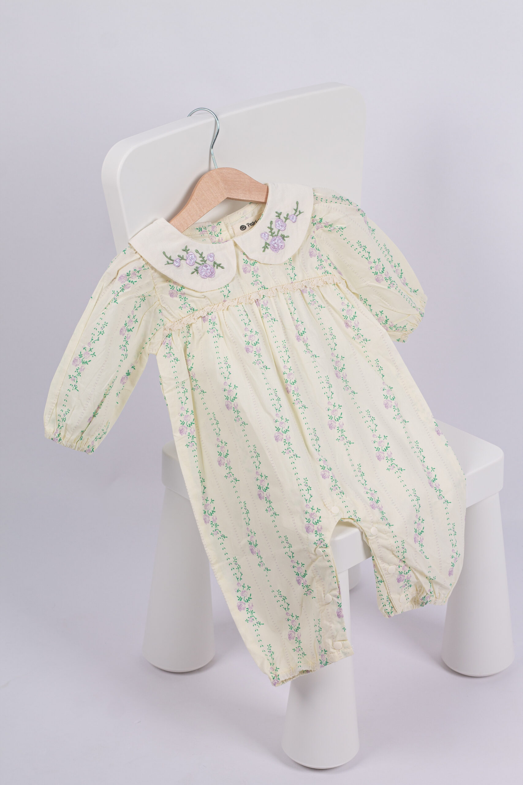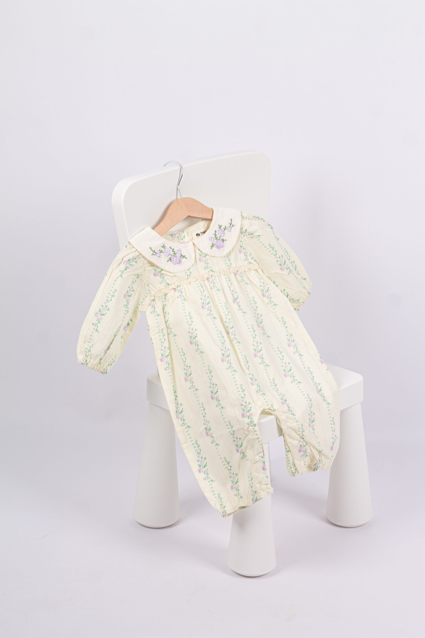جمبسوت بنقشة ورود ناعمة وتطريز لافندر على الياقة، تصميم مريح وأنيق بلمسة كلاسيكية تزيد من جمال الطفلة. مناسب للإطلالات اليومية والمناسبات، بخامة خفيفة ولطيفة على البشرة.