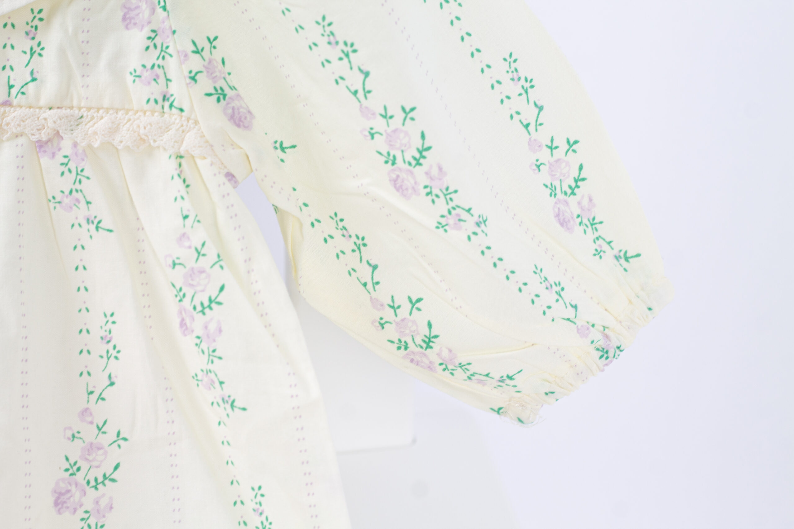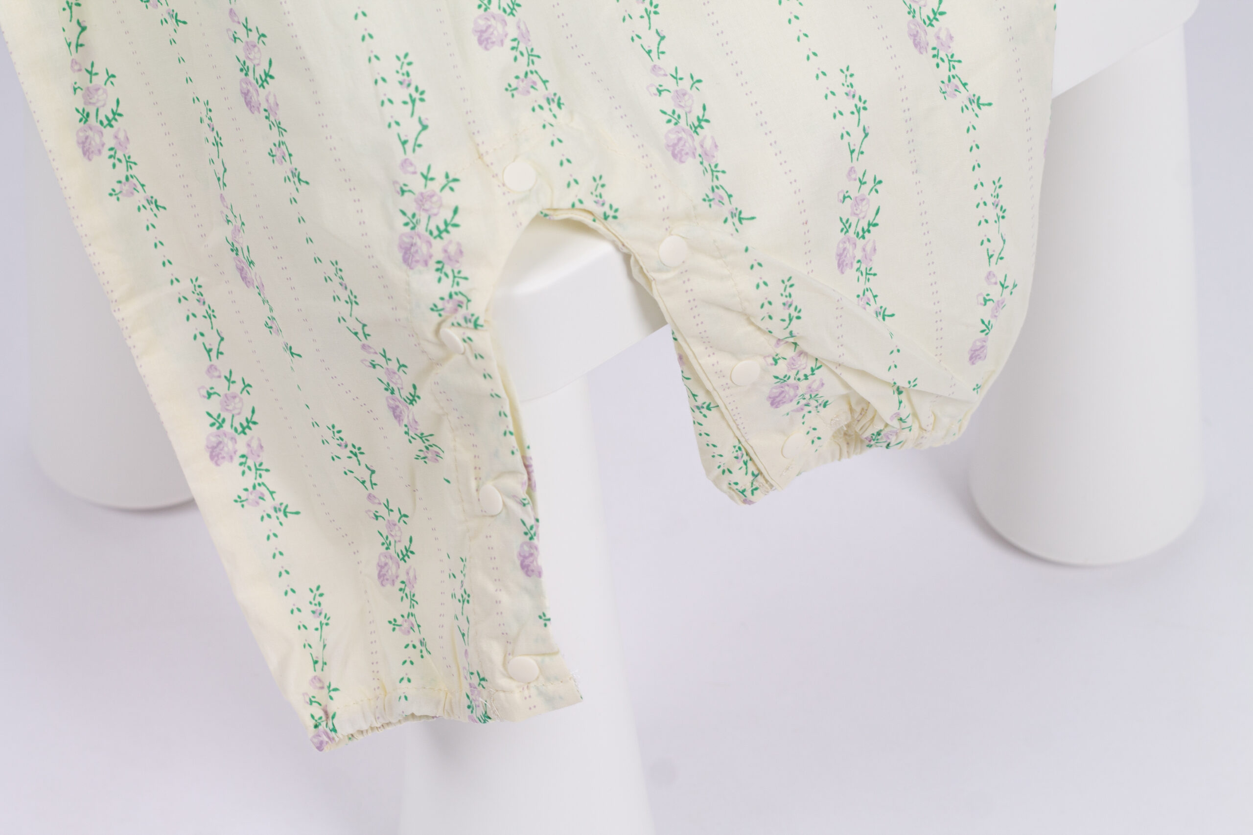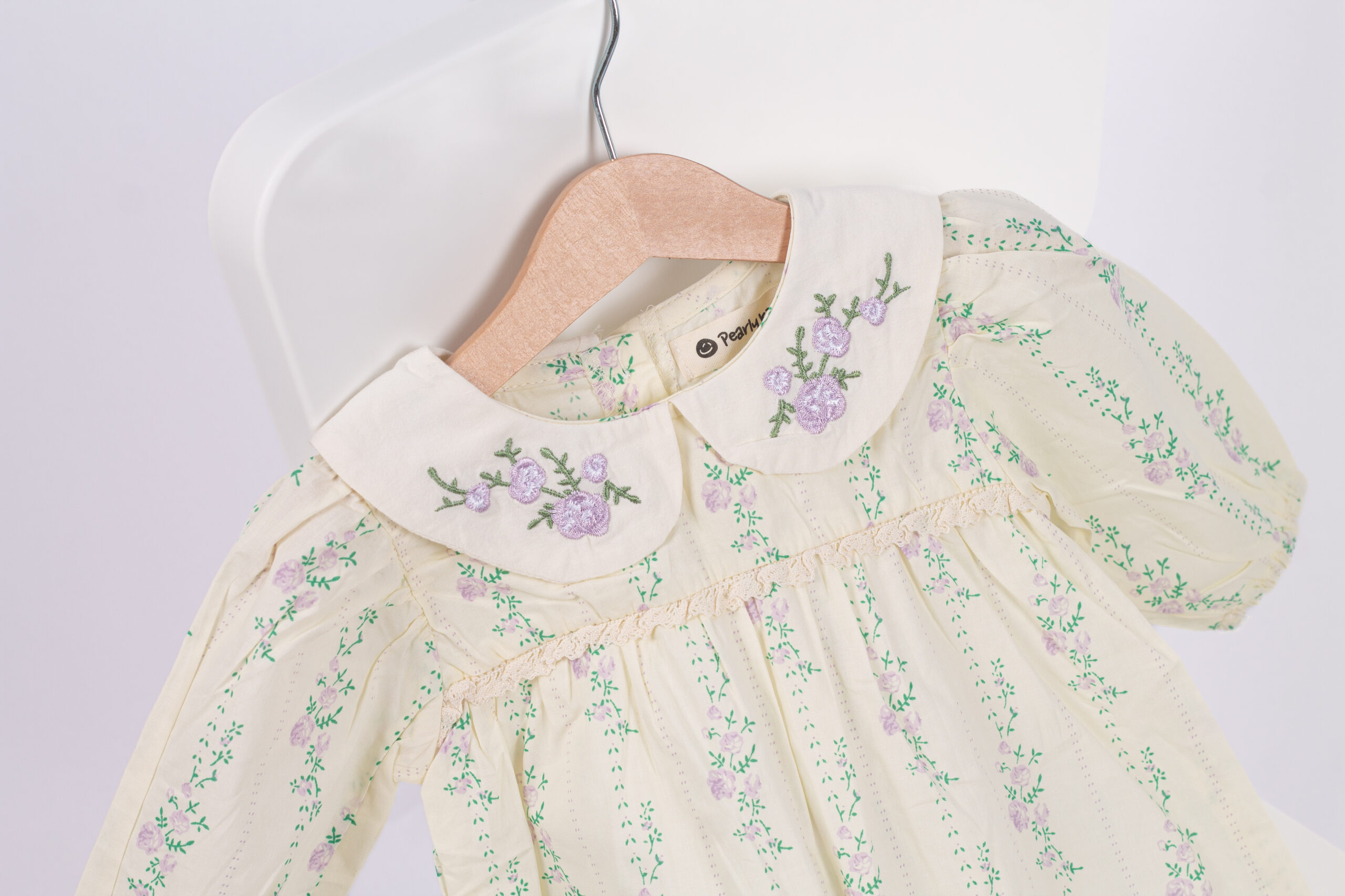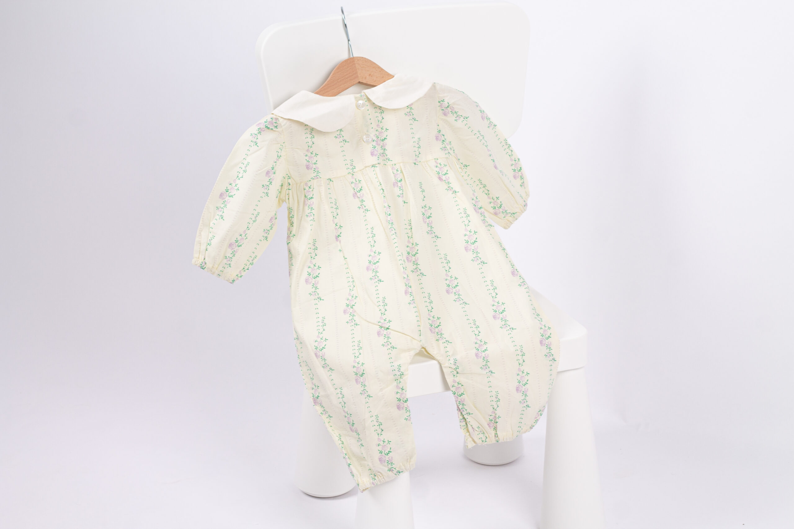 جمبسوت بنقشة ورود ناعمة وتطريز لافندر على الياقة، تصميم مريح وأنيق بلمسة كلاسيكية تزيد من جمال الطفلة. مناسب للإطلالات اليومية والمناسبات، بخامة خفيفة ولطيفة على البشرة.