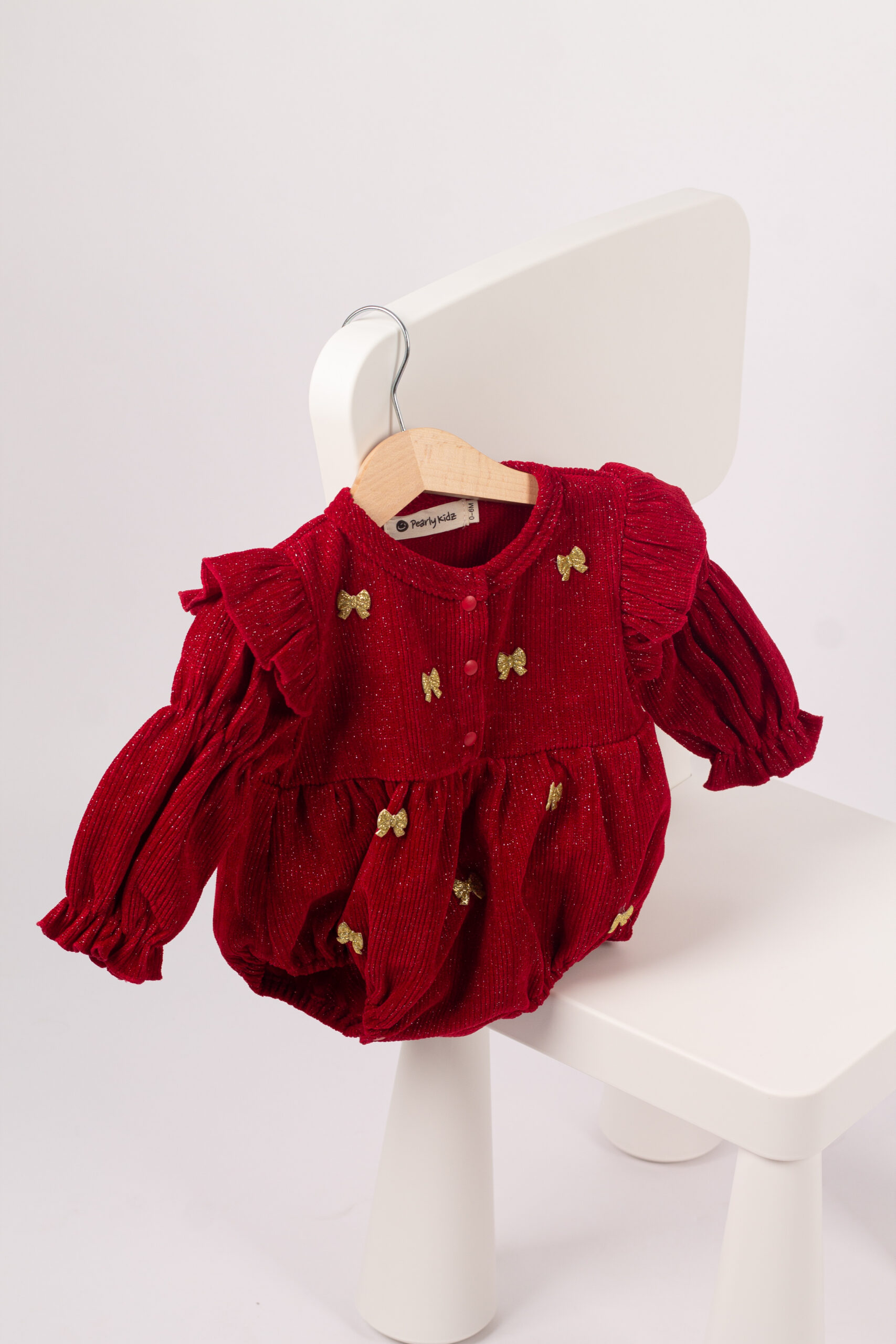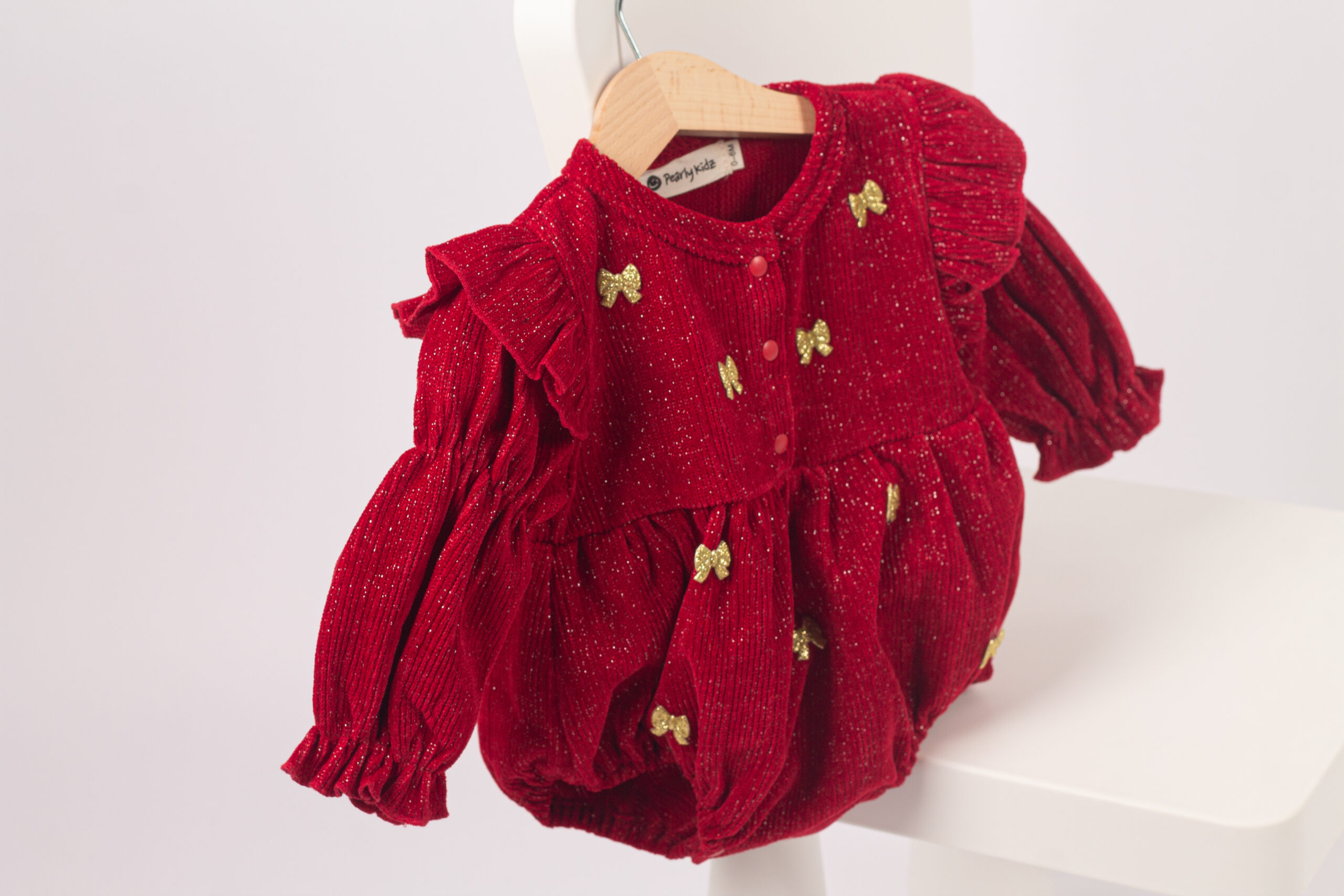 قطعة احتفالية فخمة باللون الأحمر المخملي مع لمعة خفيفة تزيدها جمال، مزينة بفيونكات ذهبية موزعة بشكل أنيق. تصميم منفوش يعطي مظهرًا لطيفًا ومناسبًا للمناسبات، مع أكمام مطاطية لراحة أفضل وسهولة في اللبس. قطعة تبقى ثابتة في الذاكرة، مثالية لأجواء الشتاء والاحتفالات.