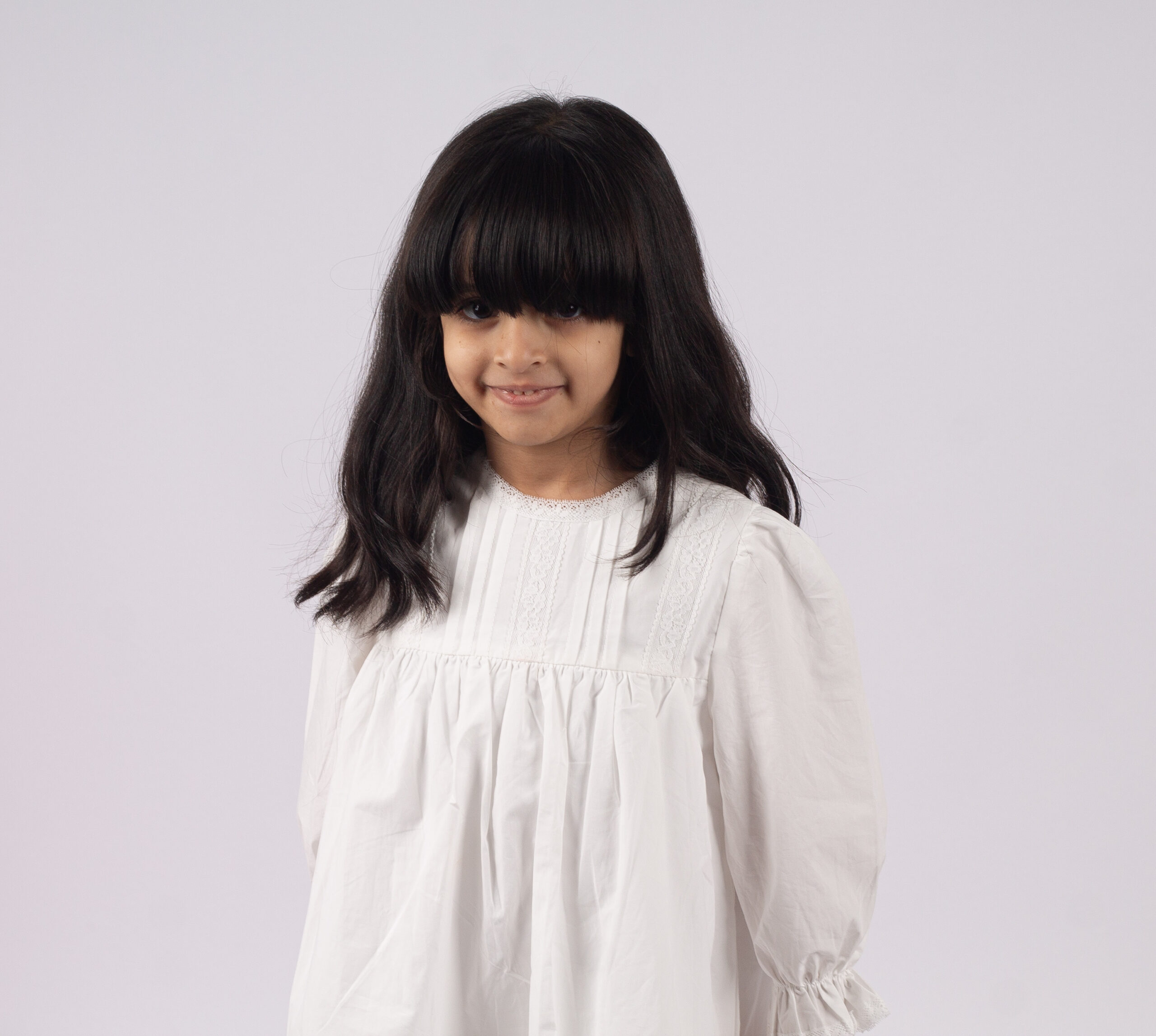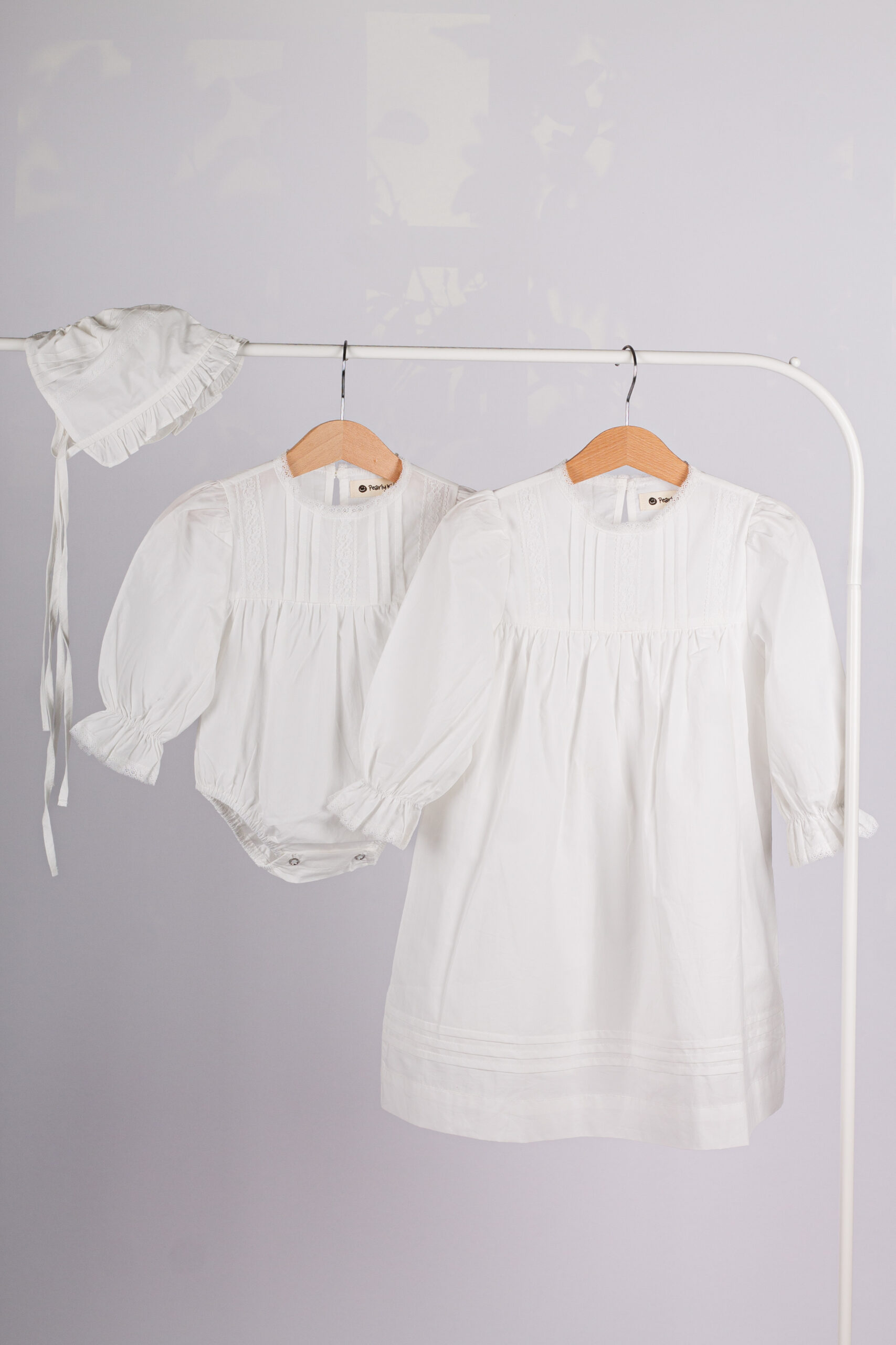 يتكوّن من فستان للبنات وقطعة بِيبِي بدي للأصغر، بتطريزات دقيقة على الصدر وتفاصيل تجمع بين الأناقة والرقي. الأكمام المنفوخة بلمسات كشكش تضيف طابعاً ملكياً، بينما يوفّر القماش القطني الناعم راحة فائقة للطفل طوال اليوم.
