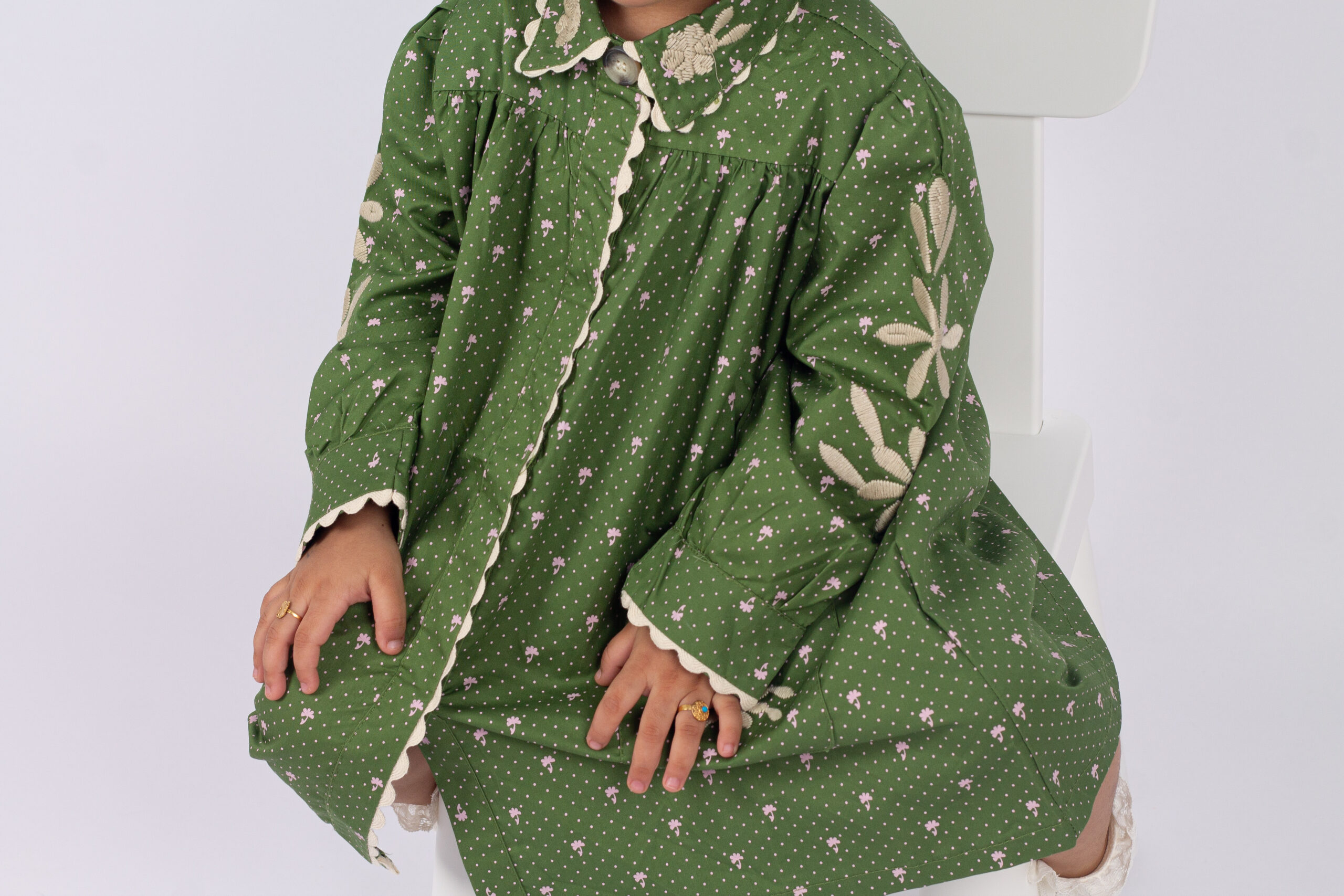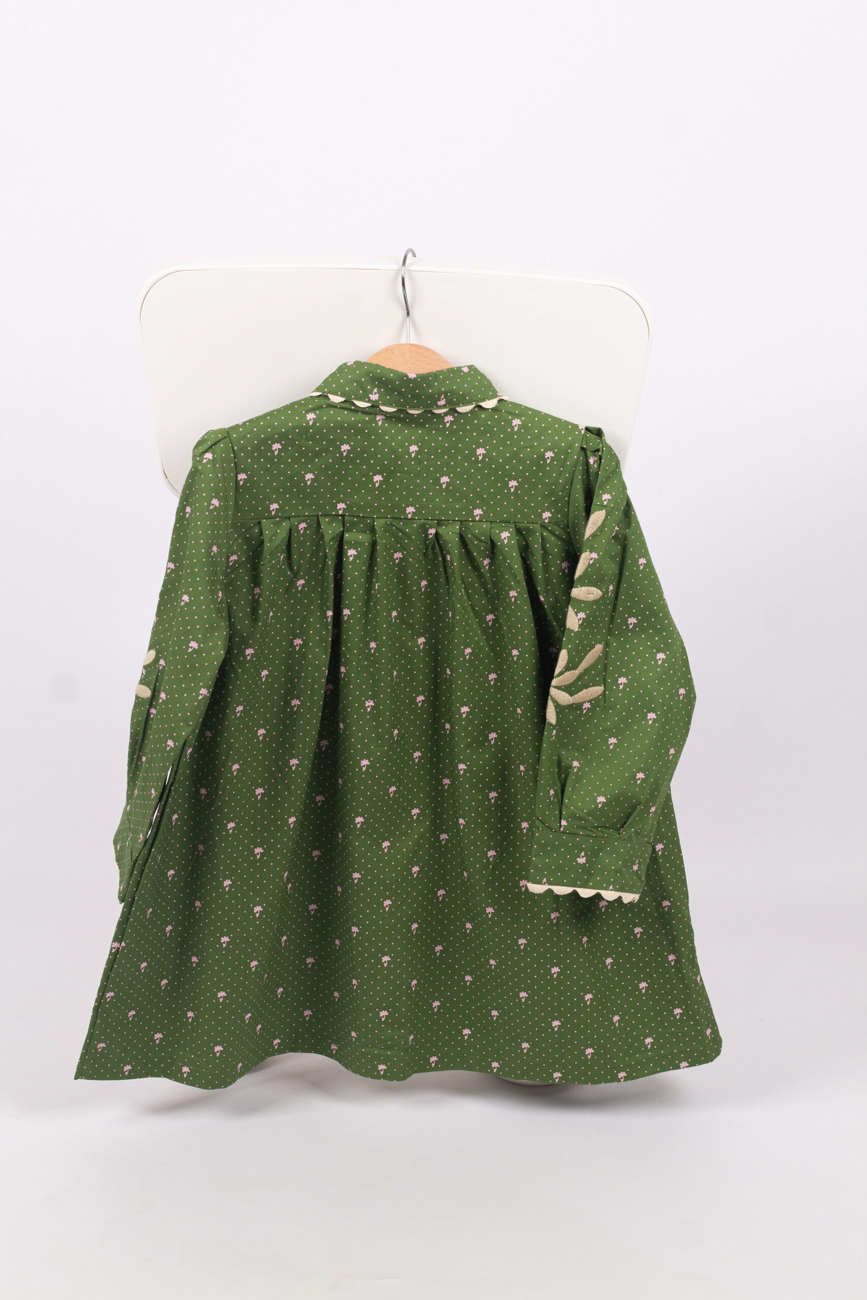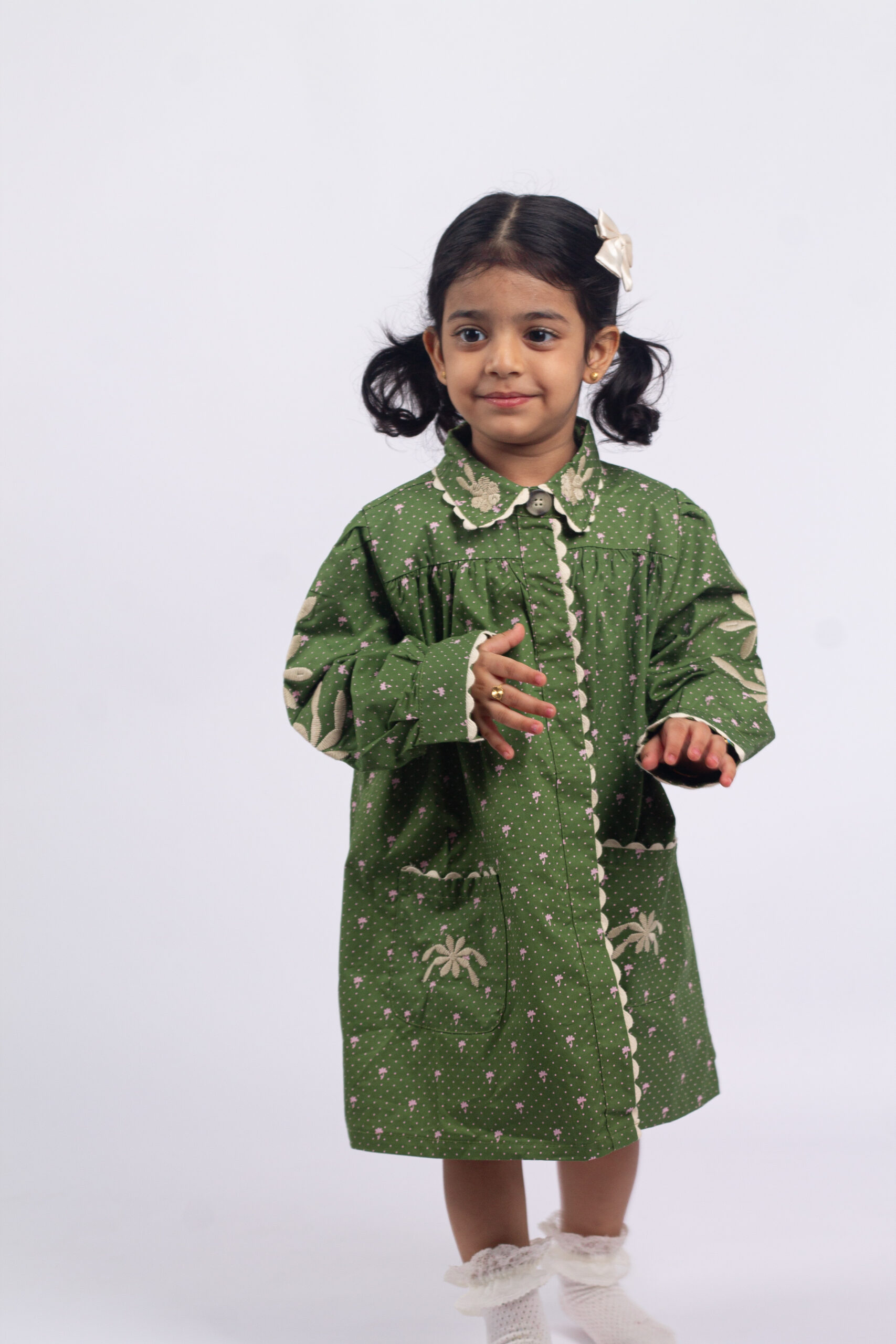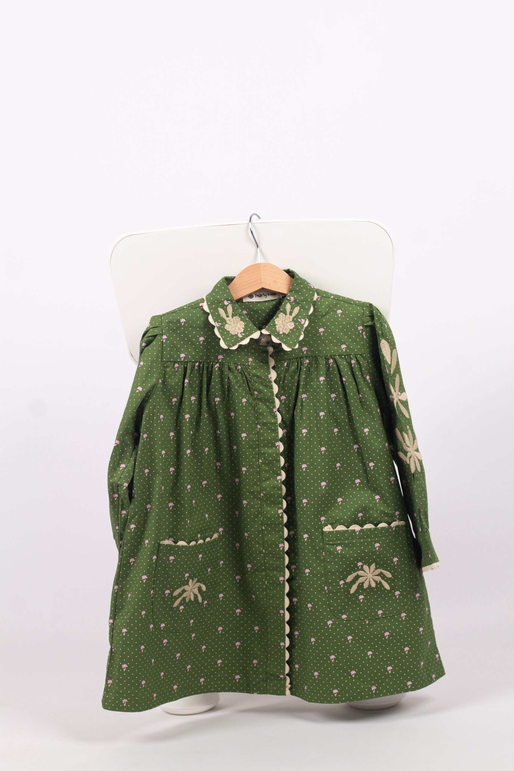 فستان شتوي بناتي مصنوع من قطن سميك ومريح باللون الأخضر، مزوّد بطبعات صغيرة وتطريزات ناعمة على الياقة والجيوب. يتميز بقصة واسعة وأكمام طويلة مناسبة لأجواء الشتاء، مع أزرار أمامية سهلة للّبس. تصميم عملي ودافئ للّبس اليومي والمناسبات البسيطة.