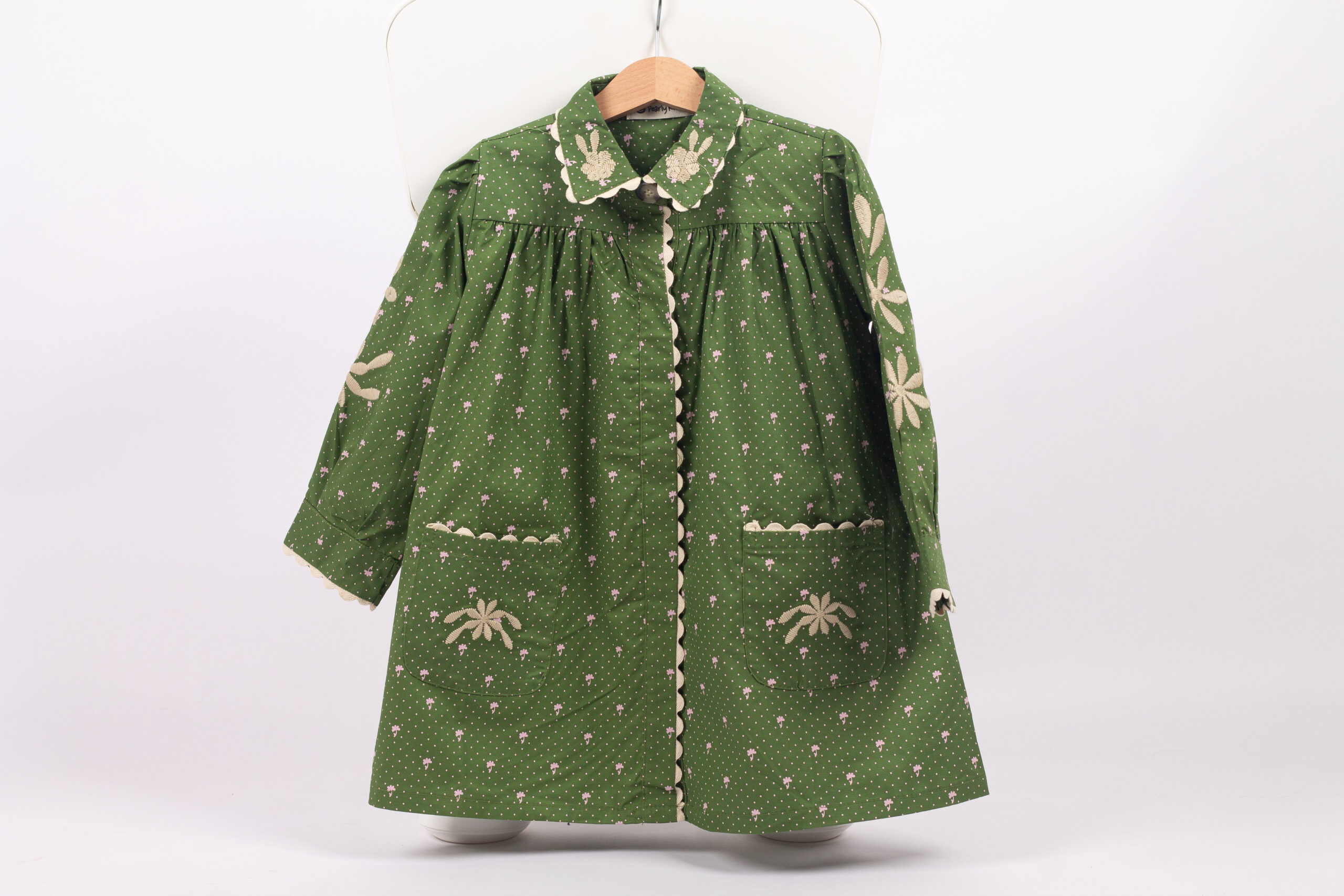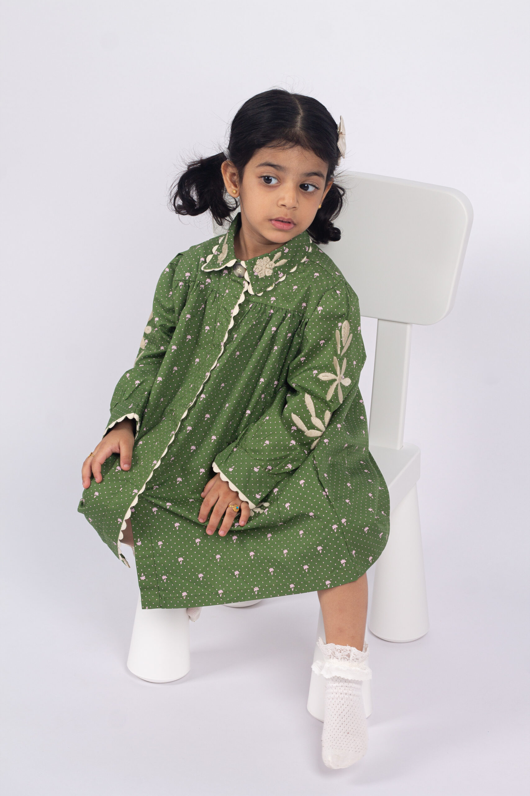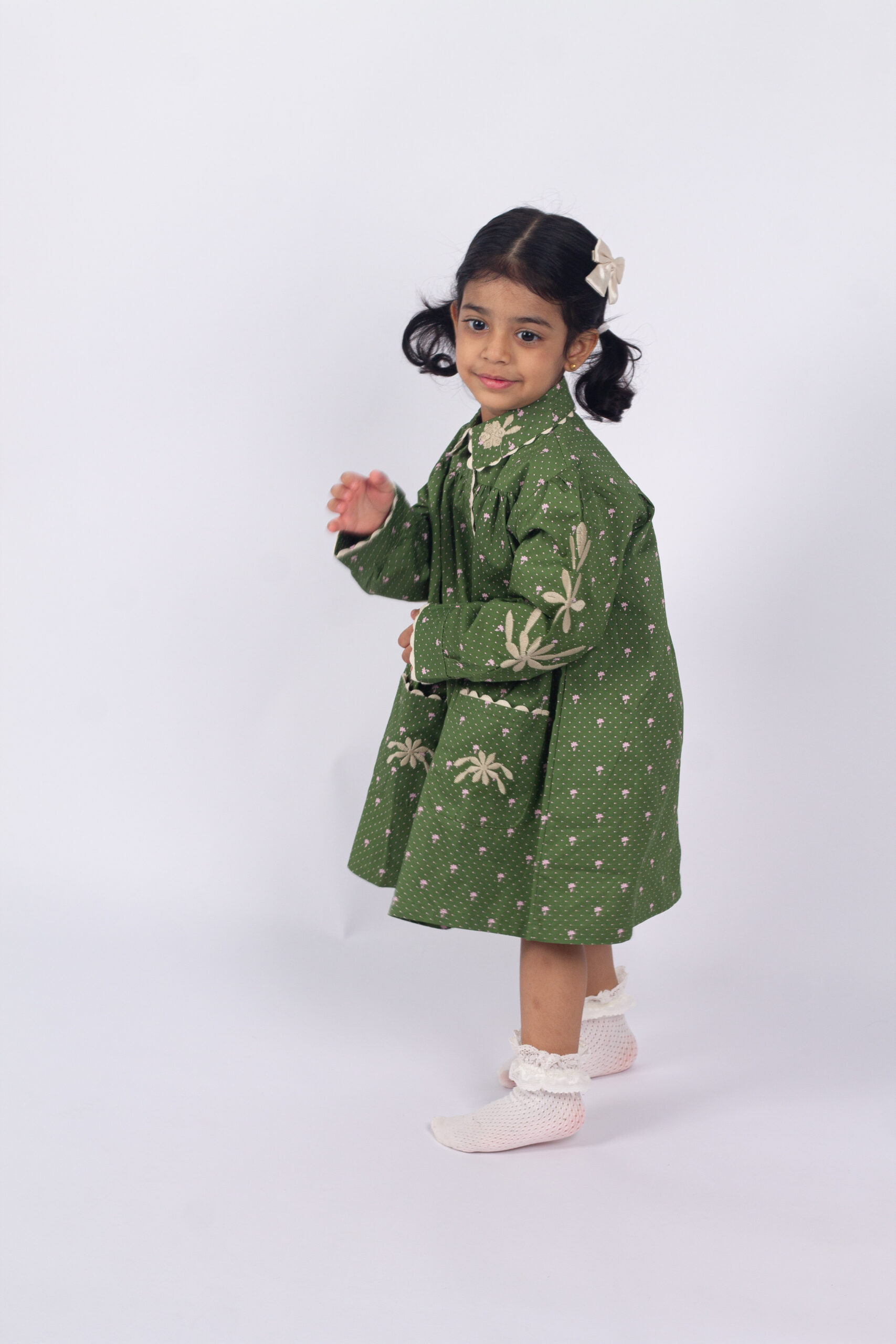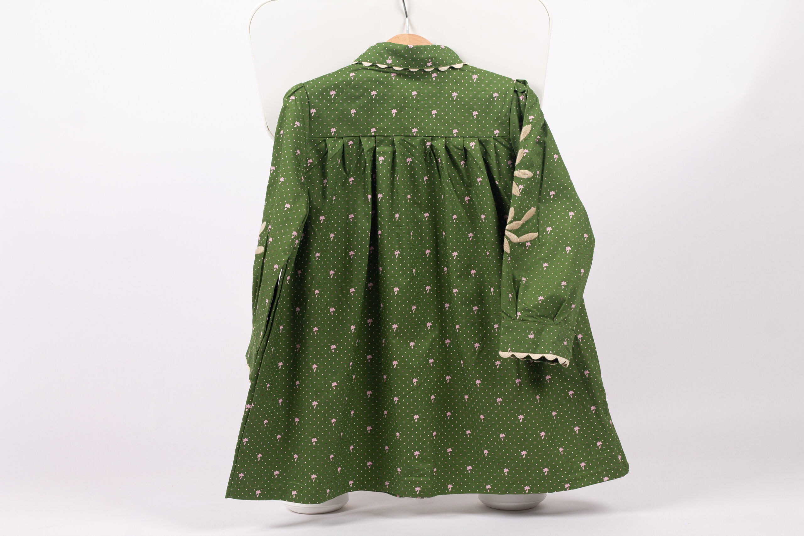 فستان شتوي بناتي مصنوع من قطن سميك ومريح باللون الأخضر، مزوّد بطبعات صغيرة وتطريزات ناعمة على الياقة والجيوب. يتميز بقصة واسعة وأكمام طويلة مناسبة لأجواء الشتاء، مع أزرار أمامية سهلة للّبس. تصميم عملي ودافئ للّبس اليومي والمناسبات البسيطة.