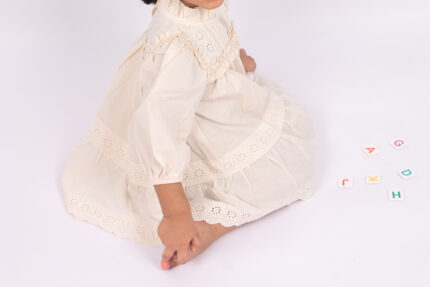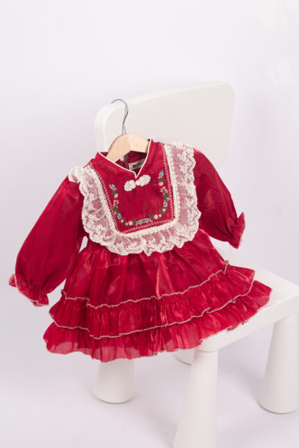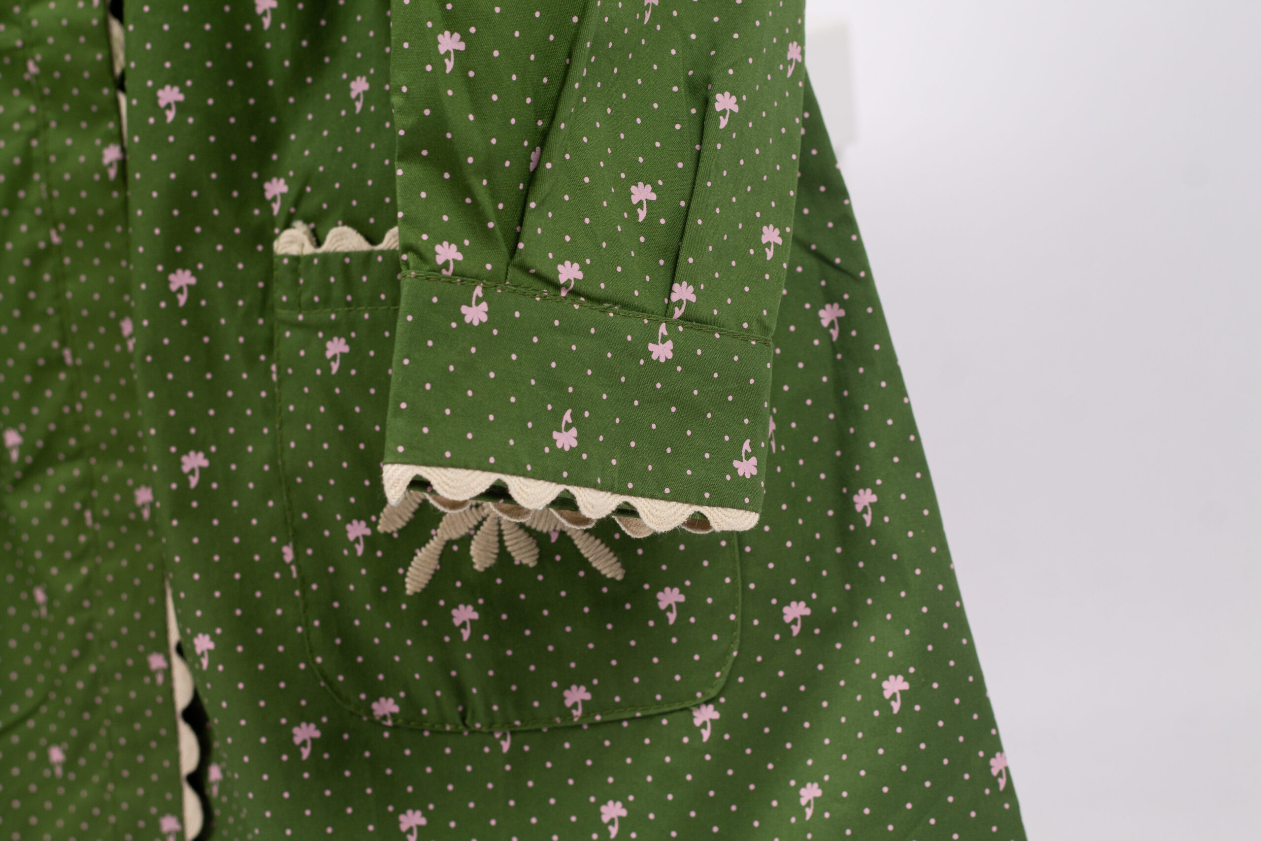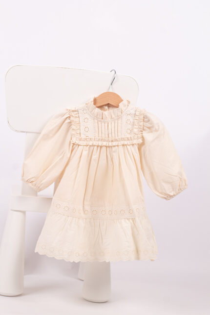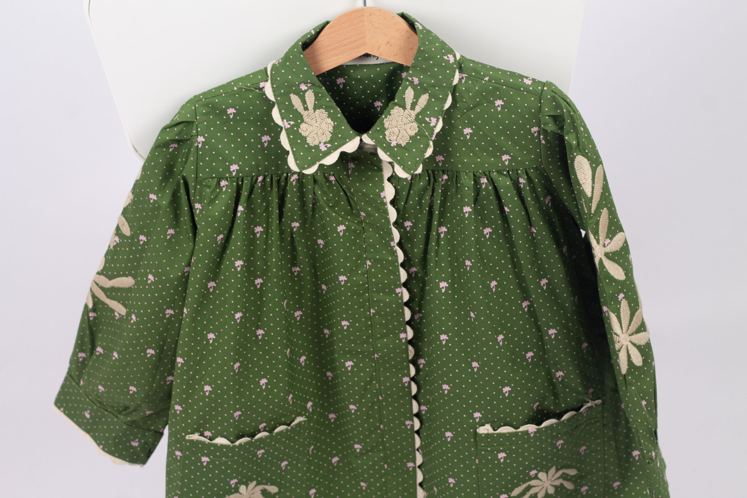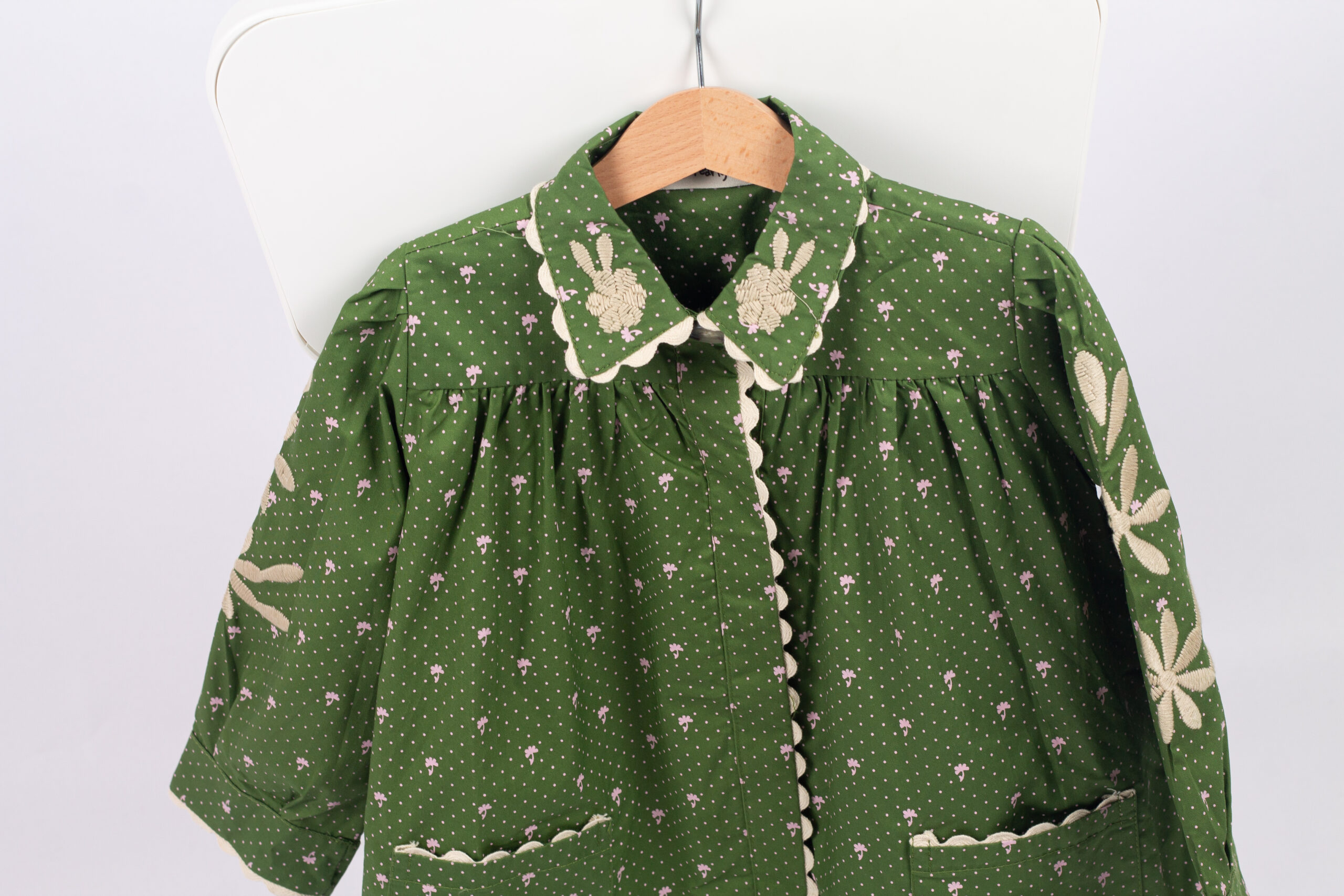 فستان شتوي بناتي مصنوع من قطن سميك ومريح باللون الأخضر، مزوّد بطبعات صغيرة وتطريزات ناعمة على الياقة والجيوب. يتميز بقصة واسعة وأكمام طويلة مناسبة لأجواء الشتاء، مع أزرار أمامية سهلة للّبس. تصميم عملي ودافئ للّبس اليومي والمناسبات البسيطة.