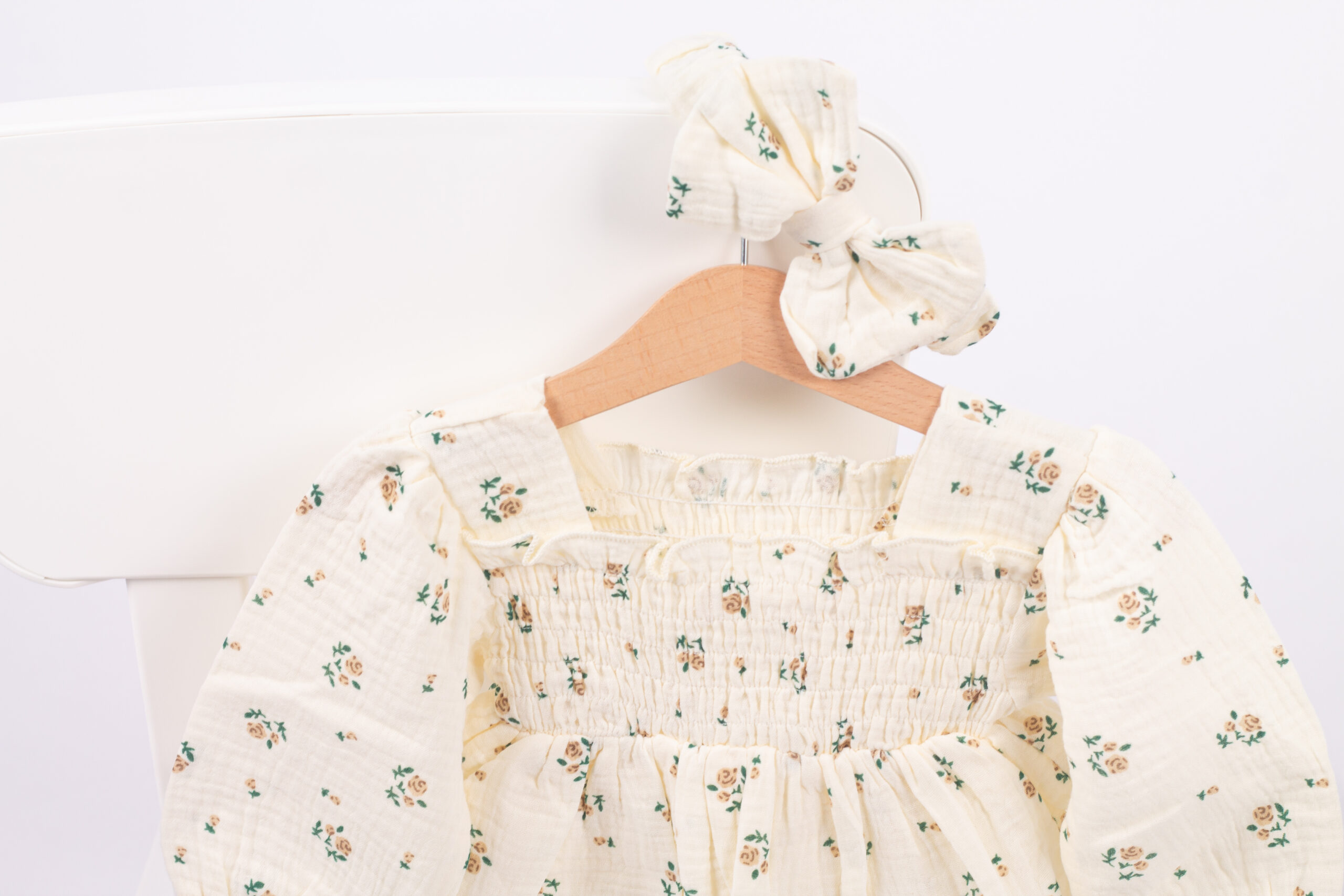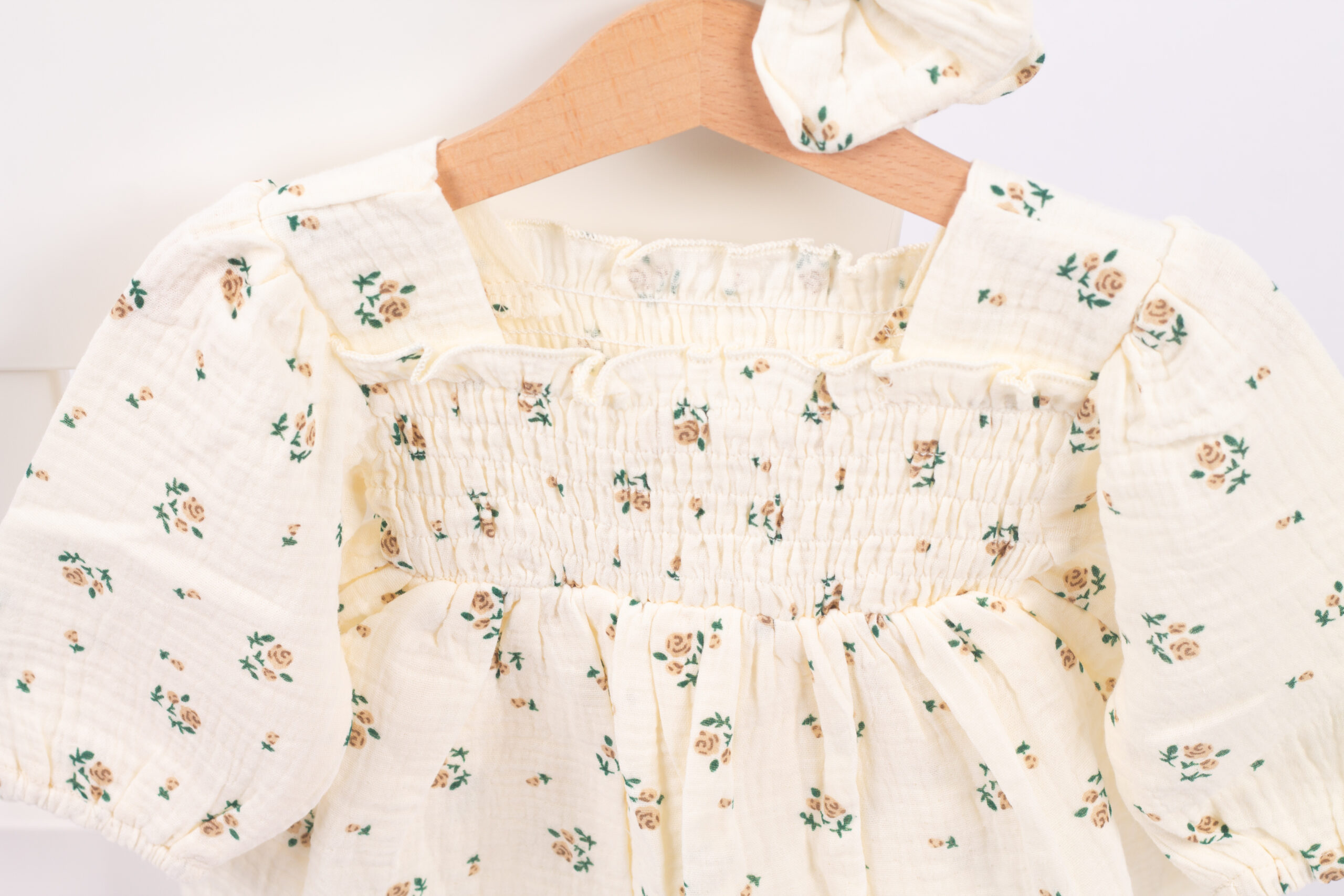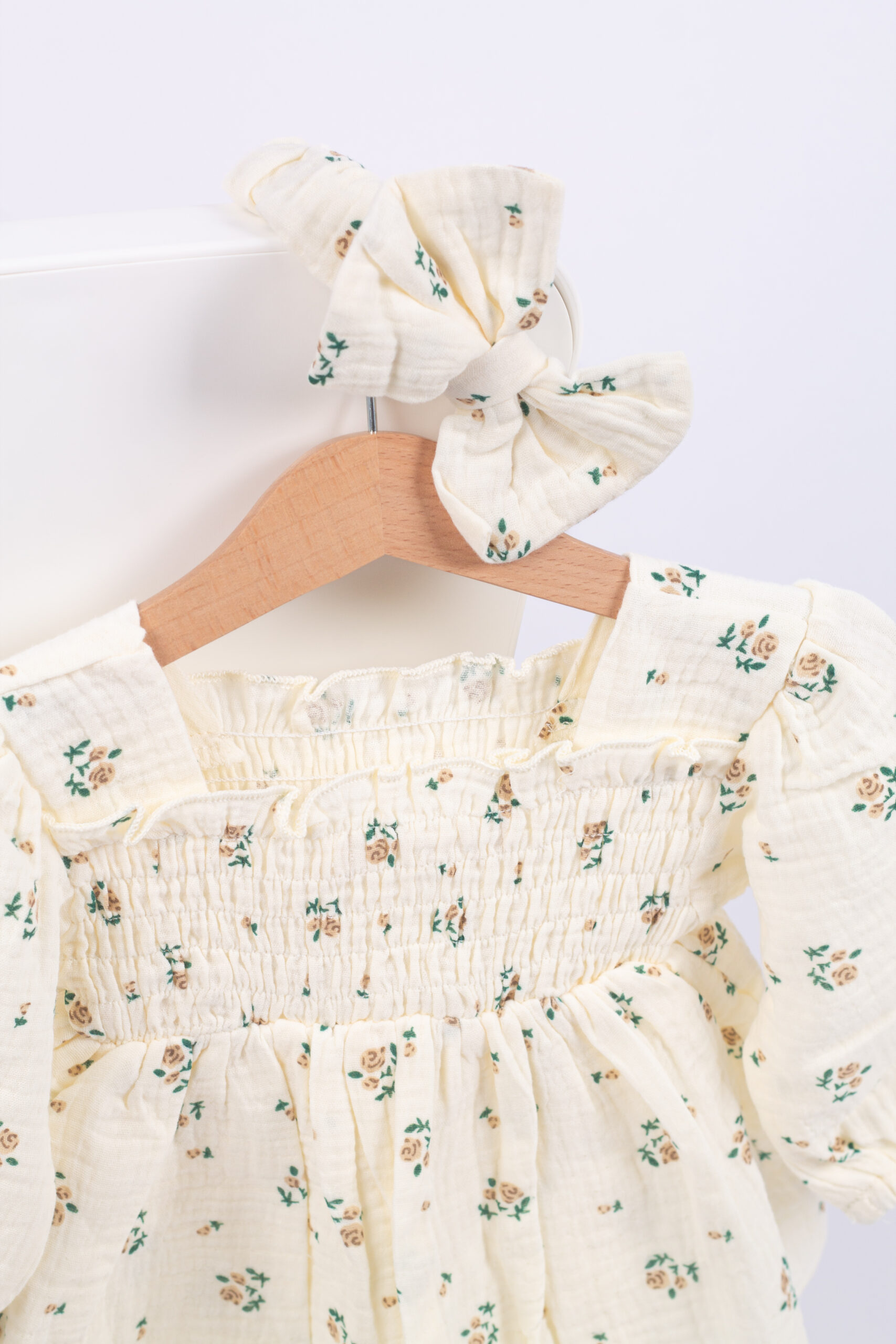 بدلة بناتي ناعمة بطبعة ورود صغيرة ولمسة سموك عالصدريّة تعطيها شكل مرتب ومرتّب. القماش مريح وخفيف، والأكمام المنفوخة تضيف لمسة جمالية. تجي معها ربطة شعر مطابقة لتكمّل اللوك بكل لطف وأناقة.