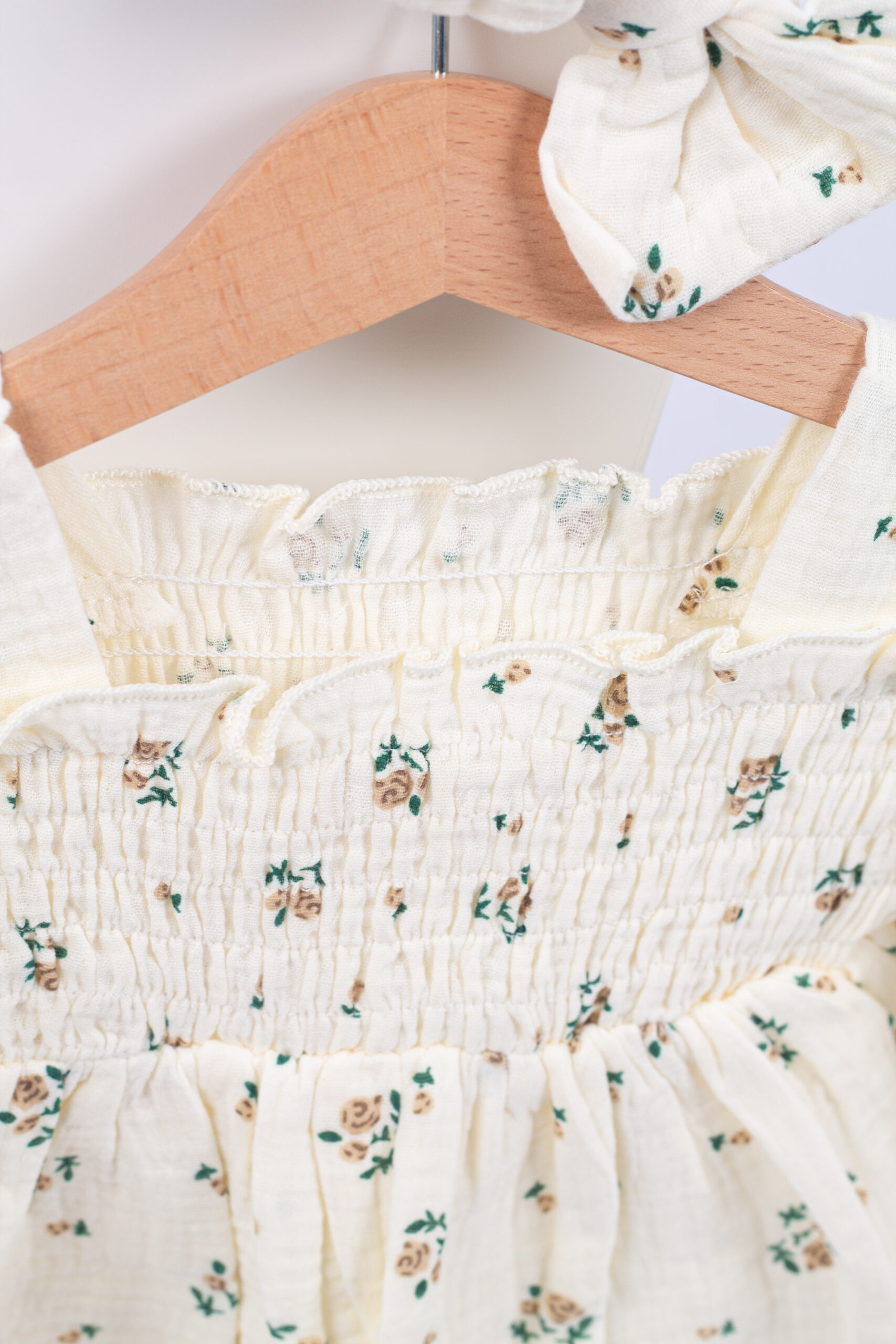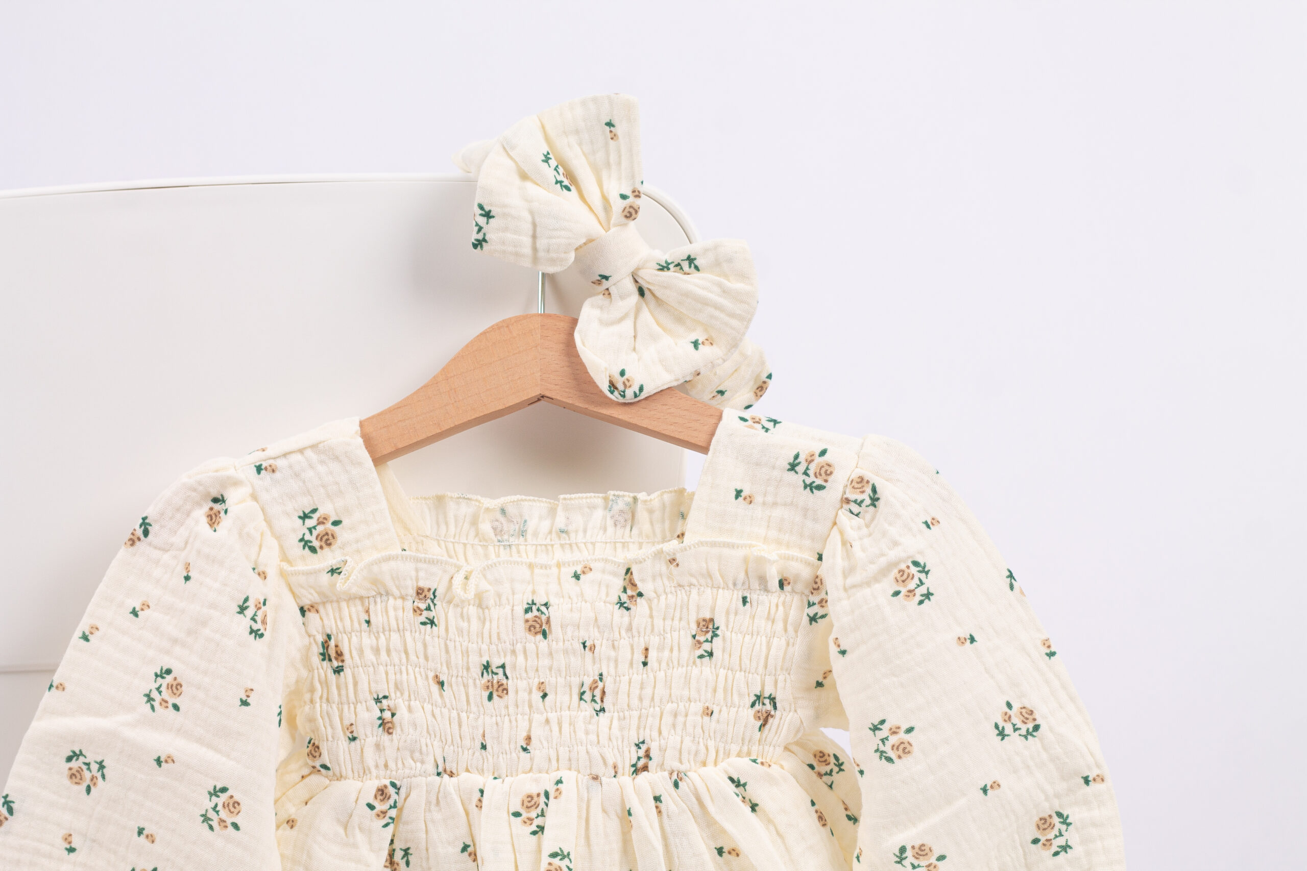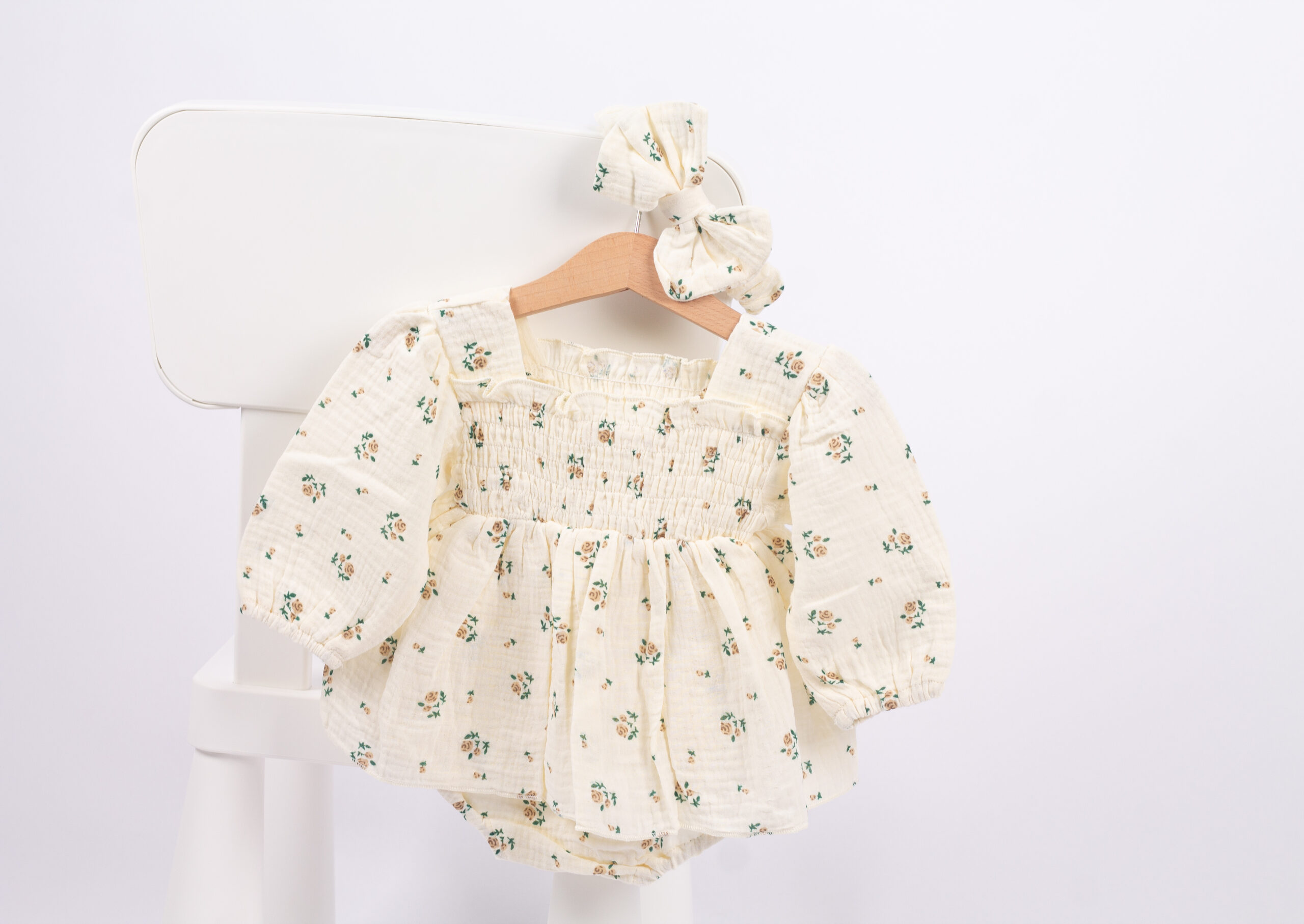بدلة بناتي ناعمة بطبعة ورود صغيرة ولمسة سموك عالصدريّة تعطيها شكل مرتب ومرتّب. القماش مريح وخفيف، والأكمام المنفوخة تضيف لمسة جمالية. تجي معها ربطة شعر مطابقة لتكمّل اللوك بكل لطف وأناقة.