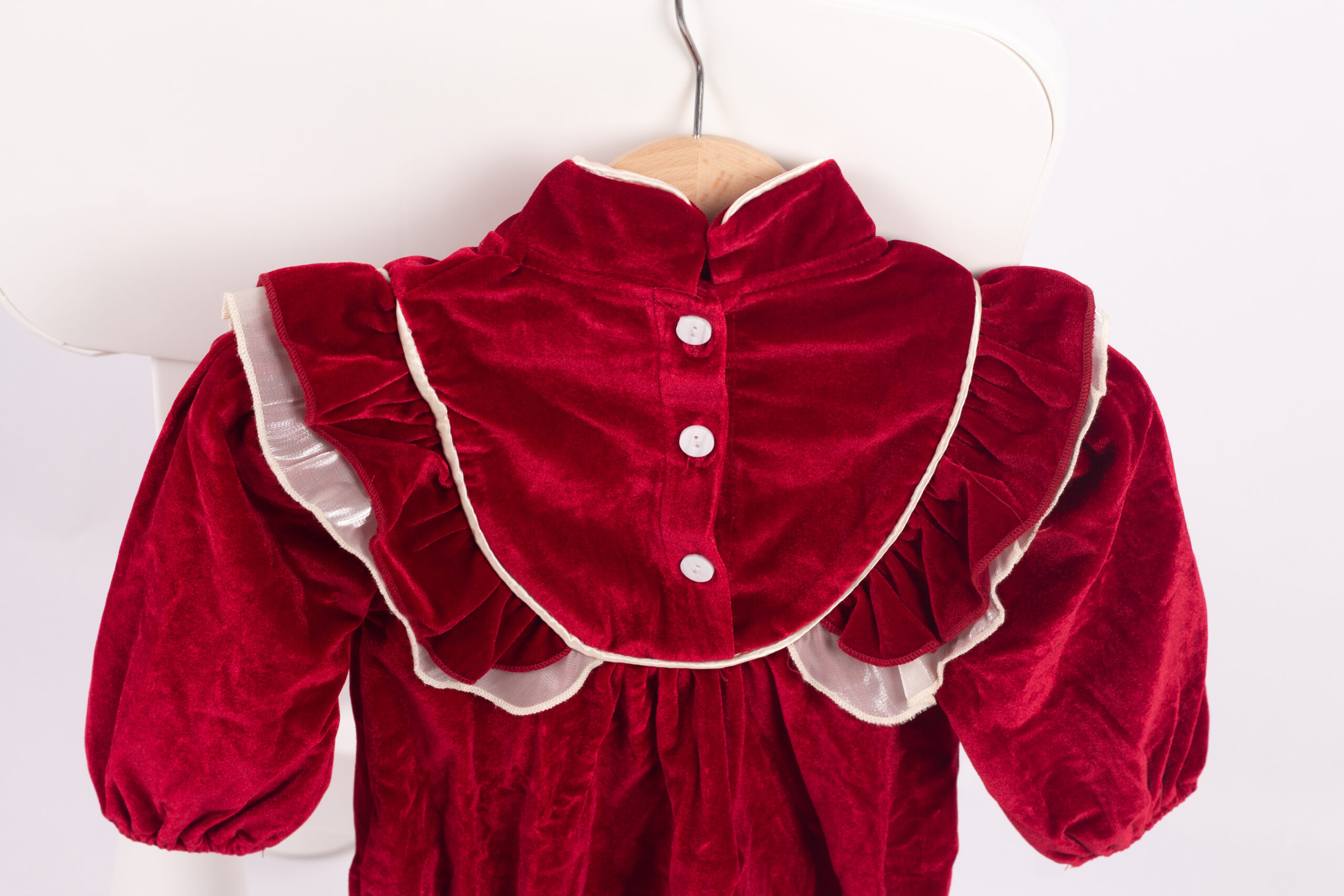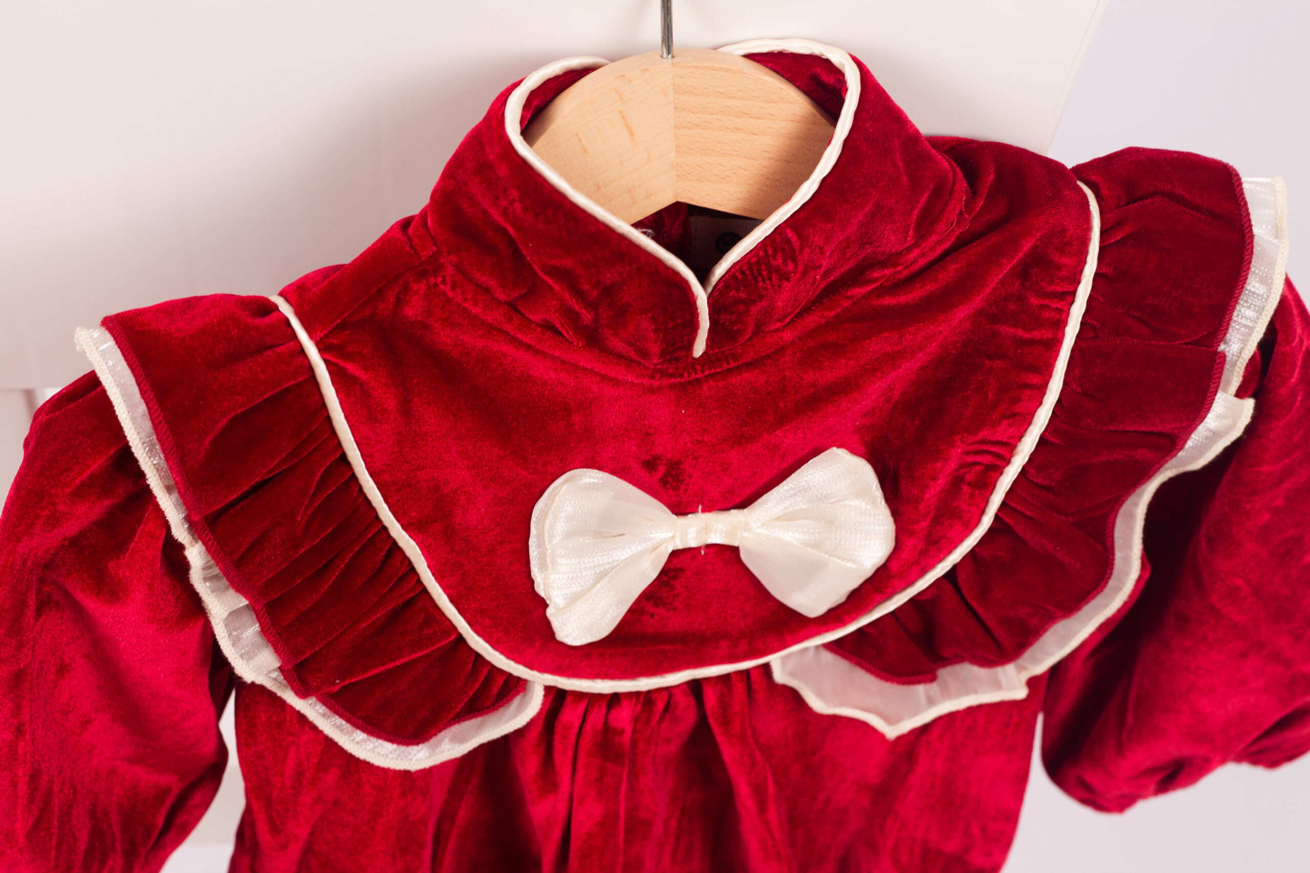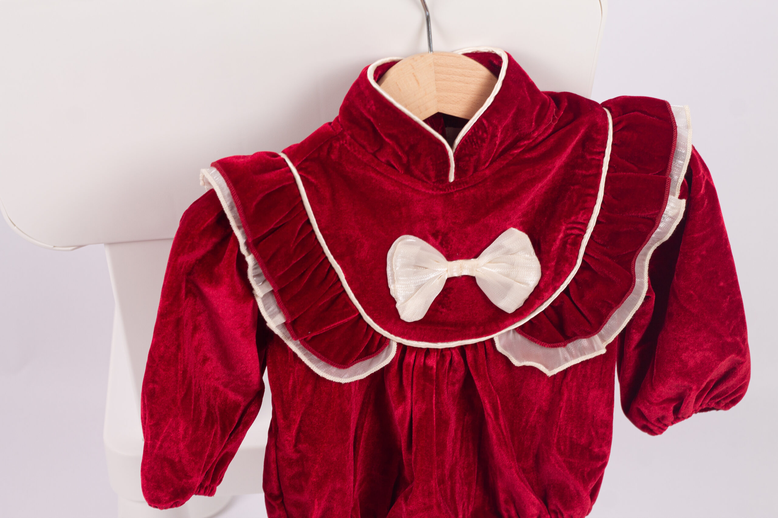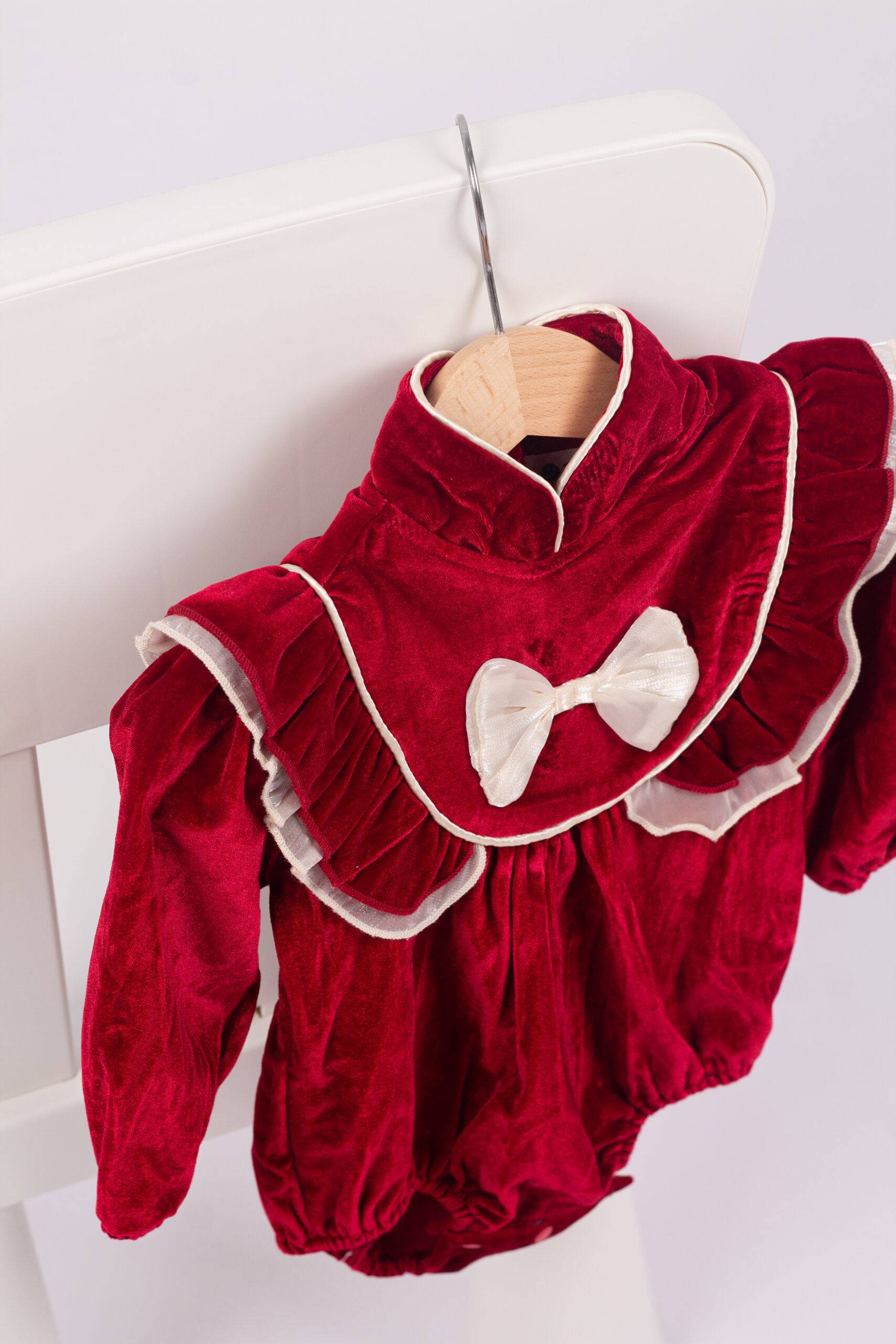 رومبر بناتي شتوي بخامة المخمل الفاخر باللون الأحمر، بتصميم كشكش على الصدر وحواف بلون عاجي ناعم. مزين بفيونكة أمامية تضيف لمسة راقية. القصة مريحة ومثالية للمناسبات والتصوير، مع أكمام طويلة واستيك خفيف عند الأطراف للثبات والراحة.