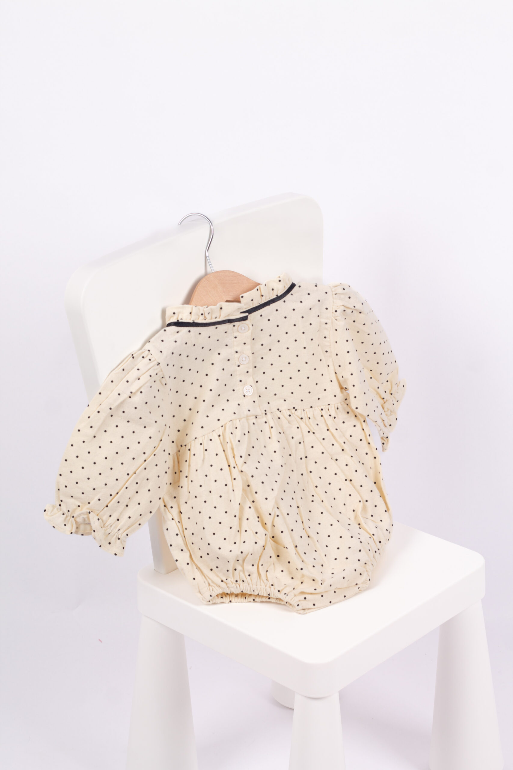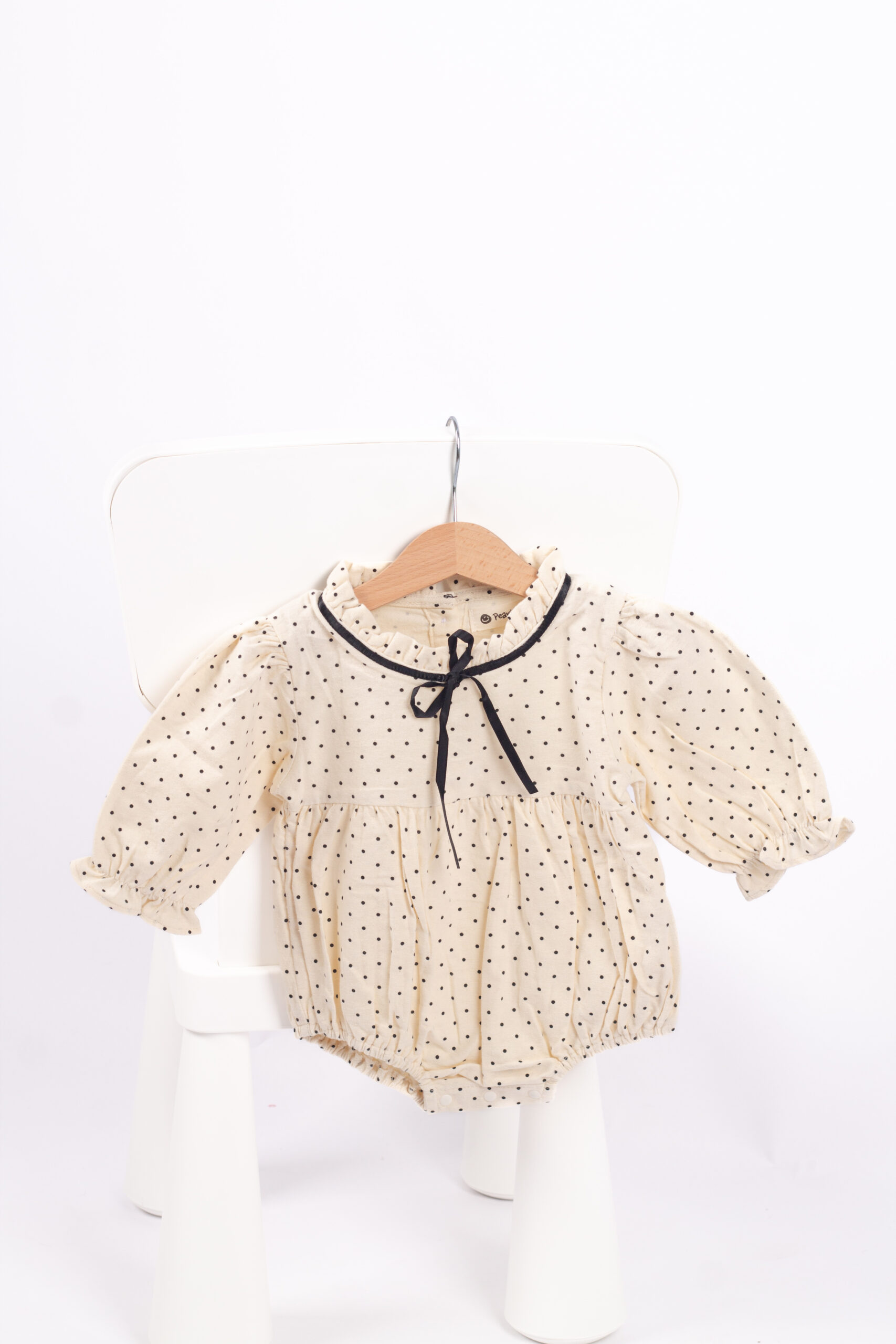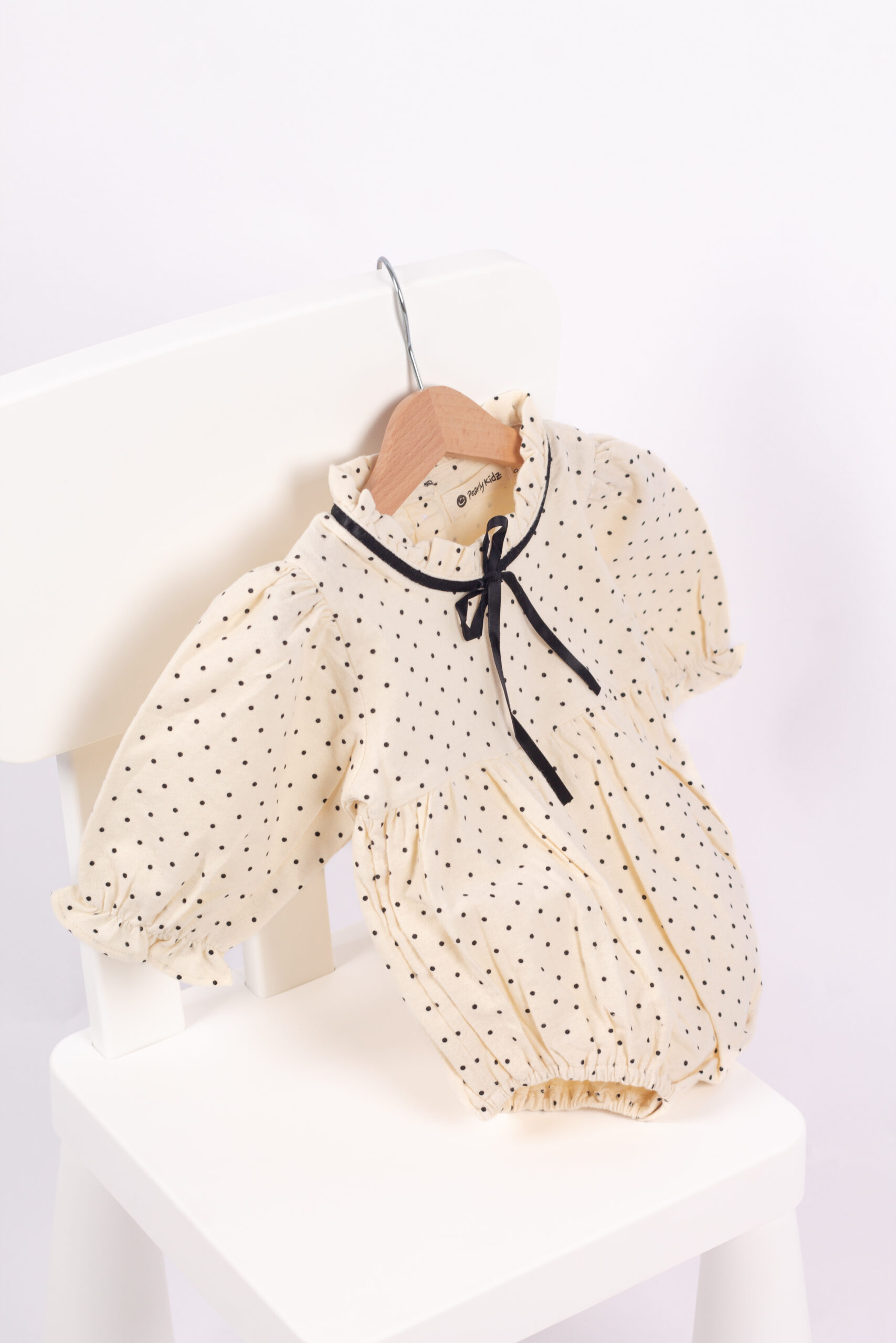 رومبر كريمي بنقشة نُقط سوداء ناعمة، تصميم بسيط وأنيق بربطة سوداء حول الياقة تضيف لمسة كلاسيكية جميلة. أكمام تجمع من الأطراف لراحة أكثر وحركة أسهل، مع مطاط خفيف أسفل القطعة لتثبيت مريح. خامة لطيفة على البشرة وتفاصيل ناعمة تعطي إطلالة مرتبة بدون مبالغة.