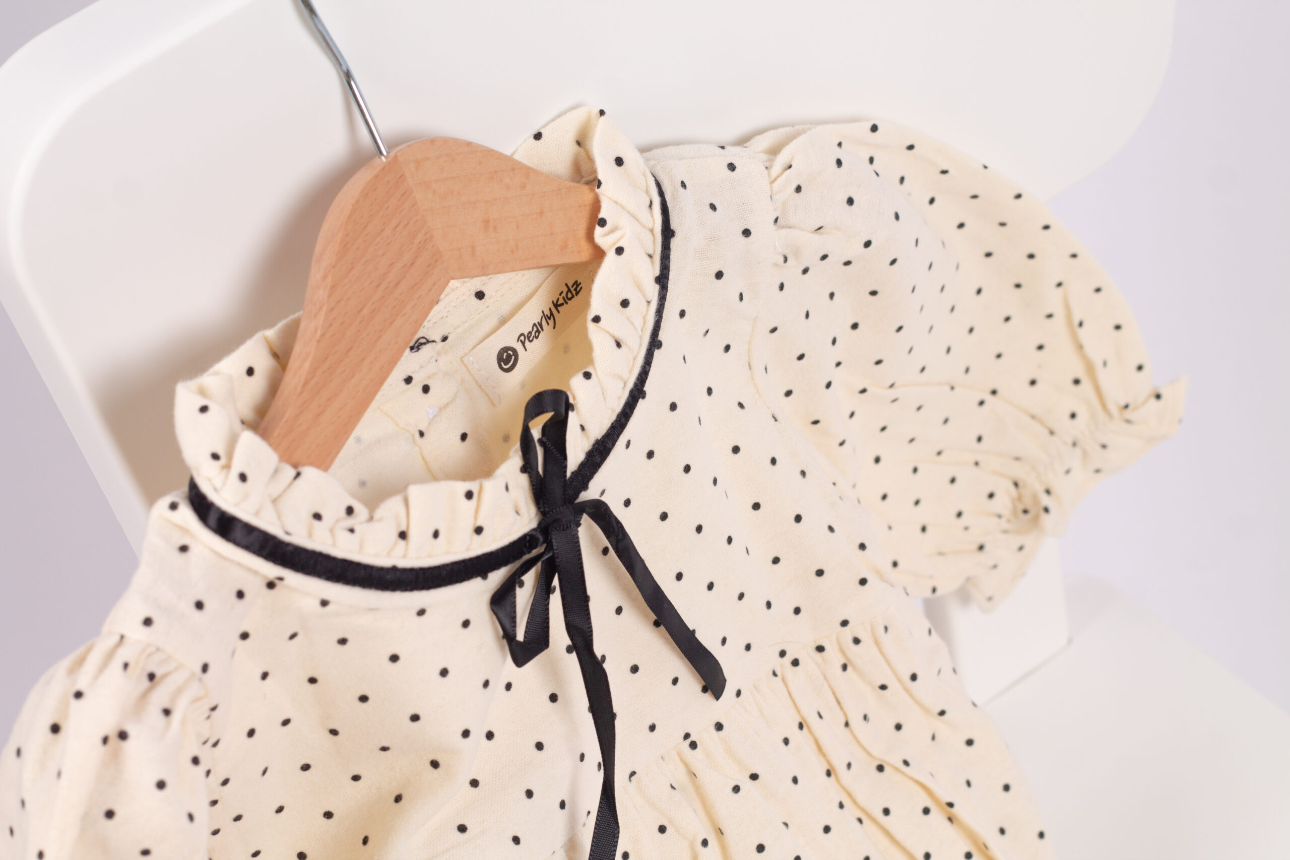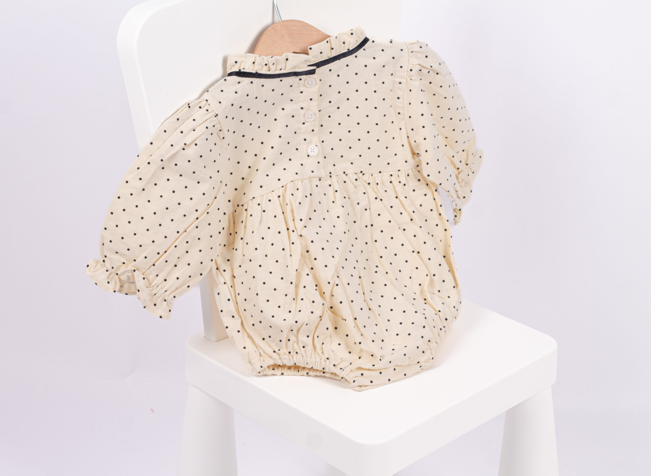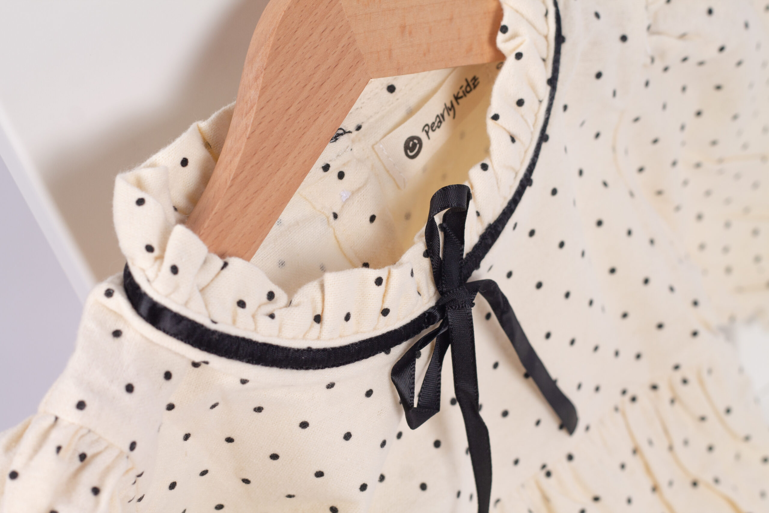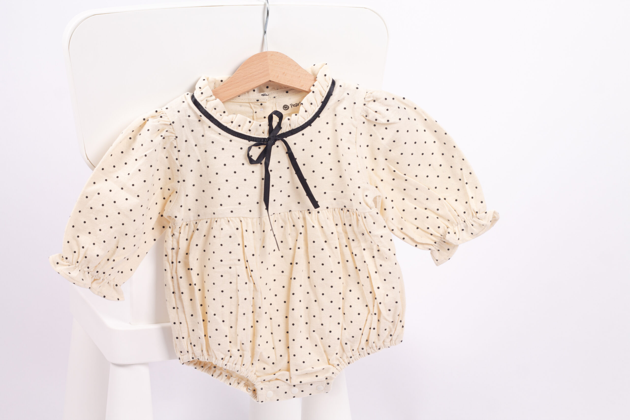 رومبر كريمي بنقشة نُقط سوداء ناعمة، تصميم بسيط وأنيق بربطة سوداء حول الياقة تضيف لمسة كلاسيكية جميلة. أكمام تجمع من الأطراف لراحة أكثر وحركة أسهل، مع مطاط خفيف أسفل القطعة لتثبيت مريح. خامة لطيفة على البشرة وتفاصيل ناعمة تعطي إطلالة مرتبة بدون مبالغة.