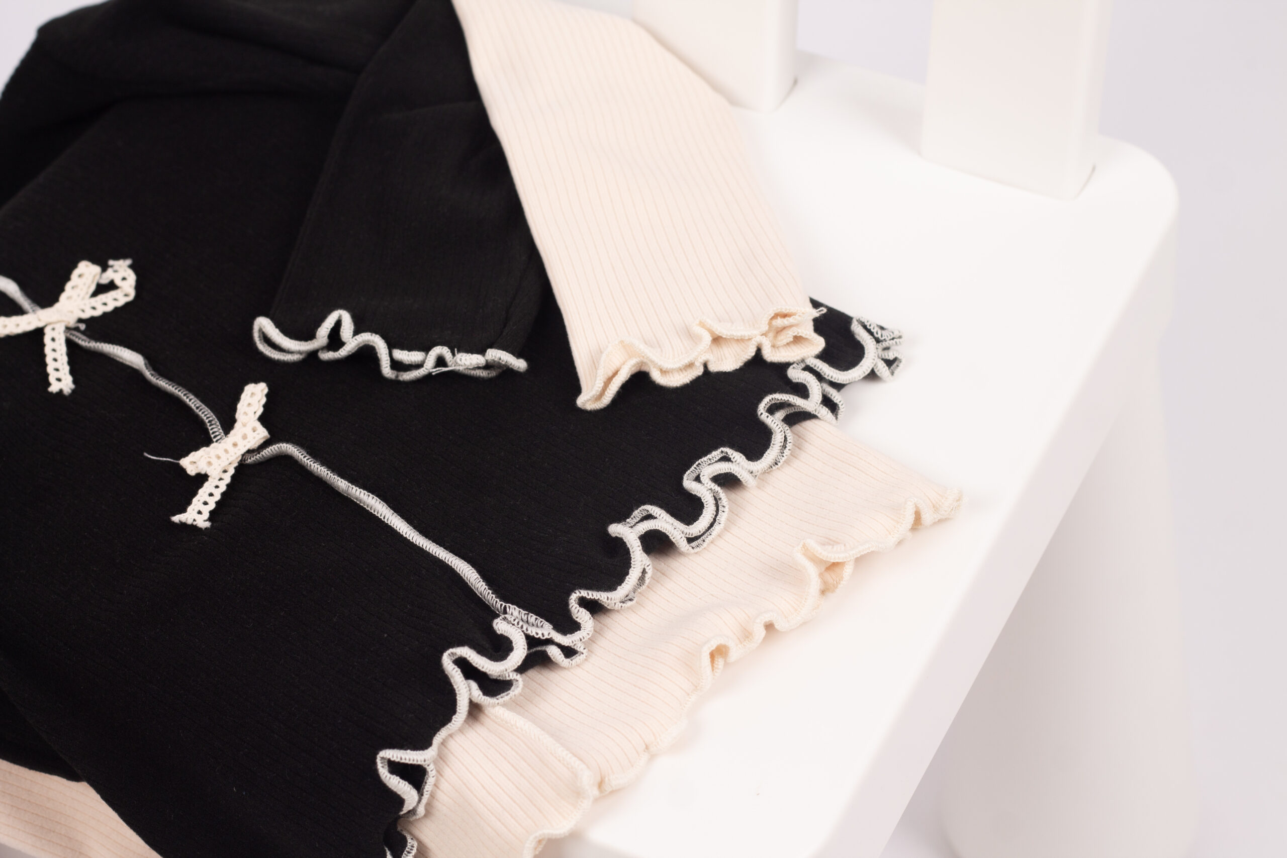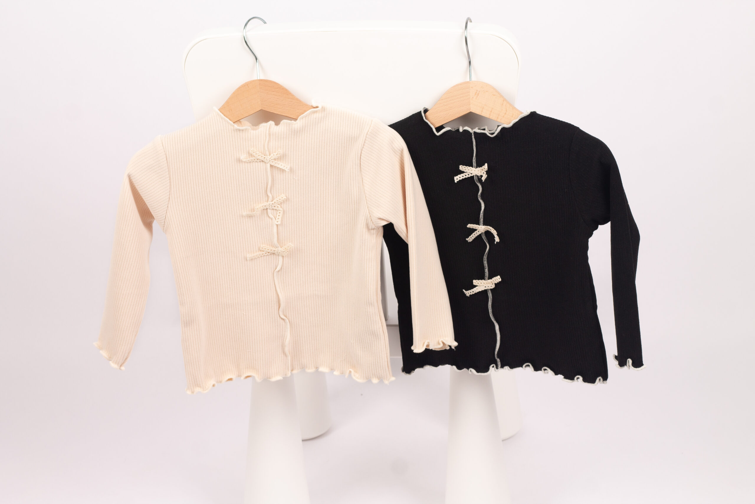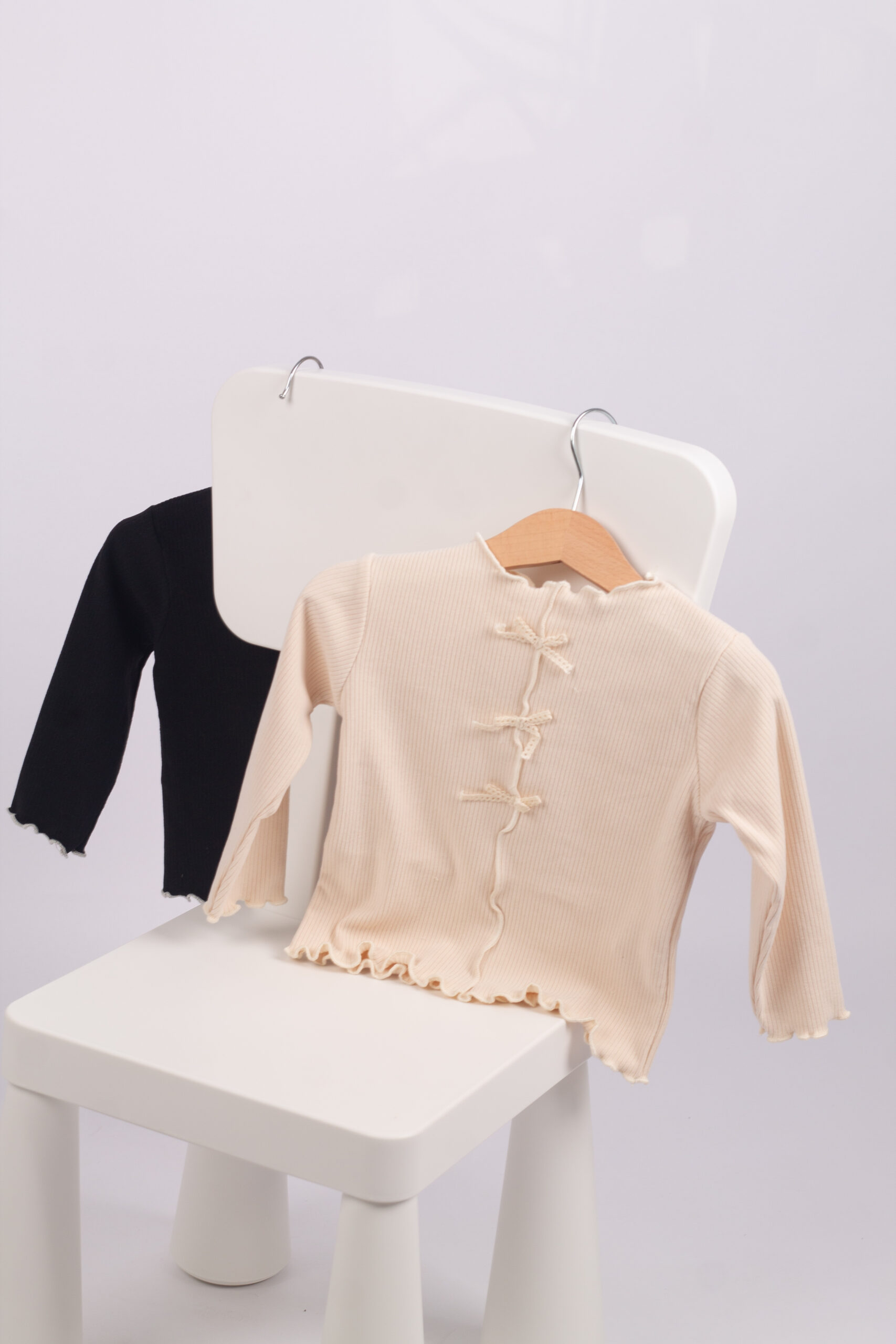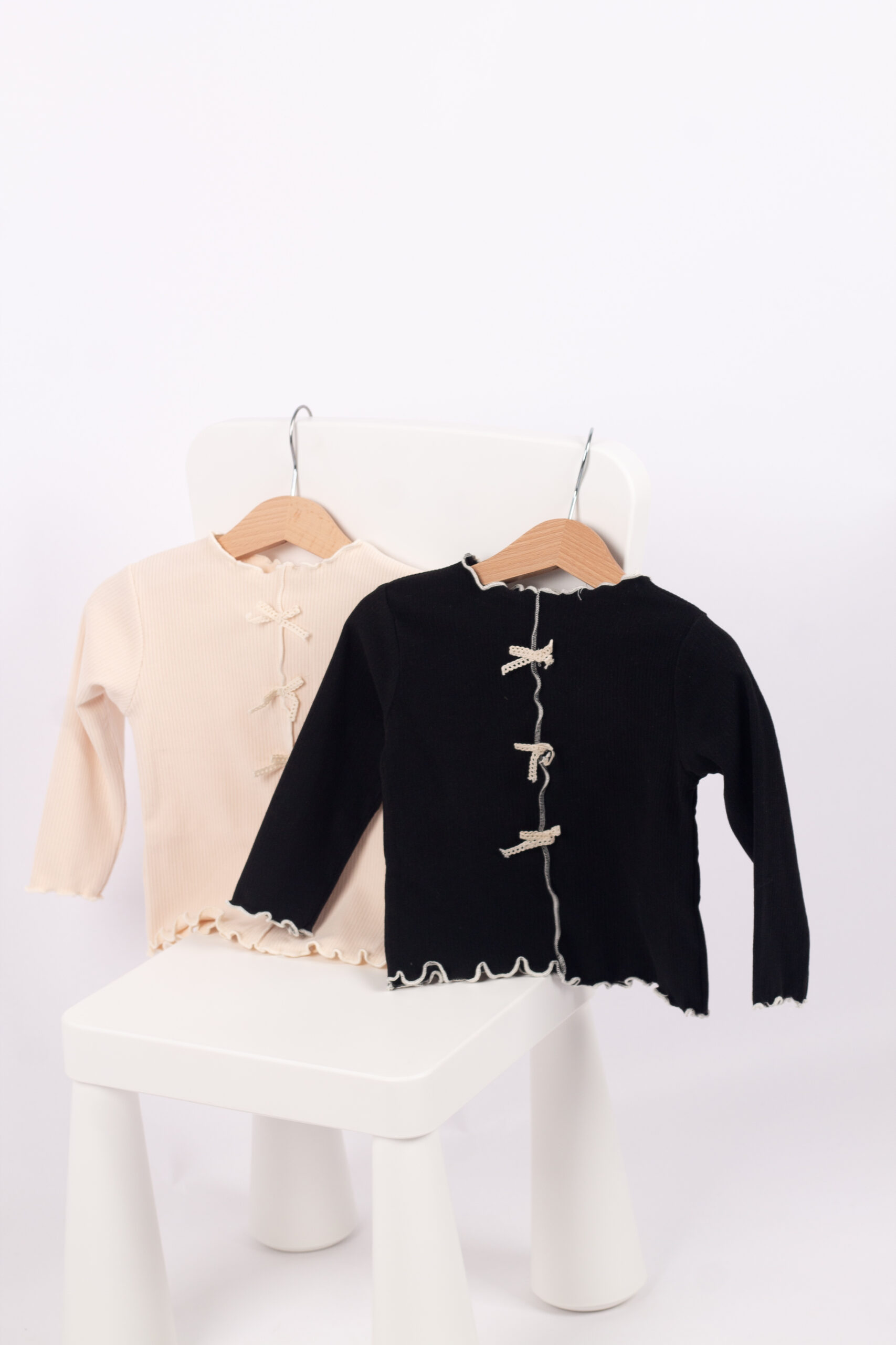بلوزة بناتي من قماش قطن ريب مريح ومرن، مزينة بثلاث فيونكات أمامية تعطيها لمسة لطيفة ومختلفة. الأكمام طويلة والحواف مكرمشة بتصميم بسيط يناسب اللبس اليومي.