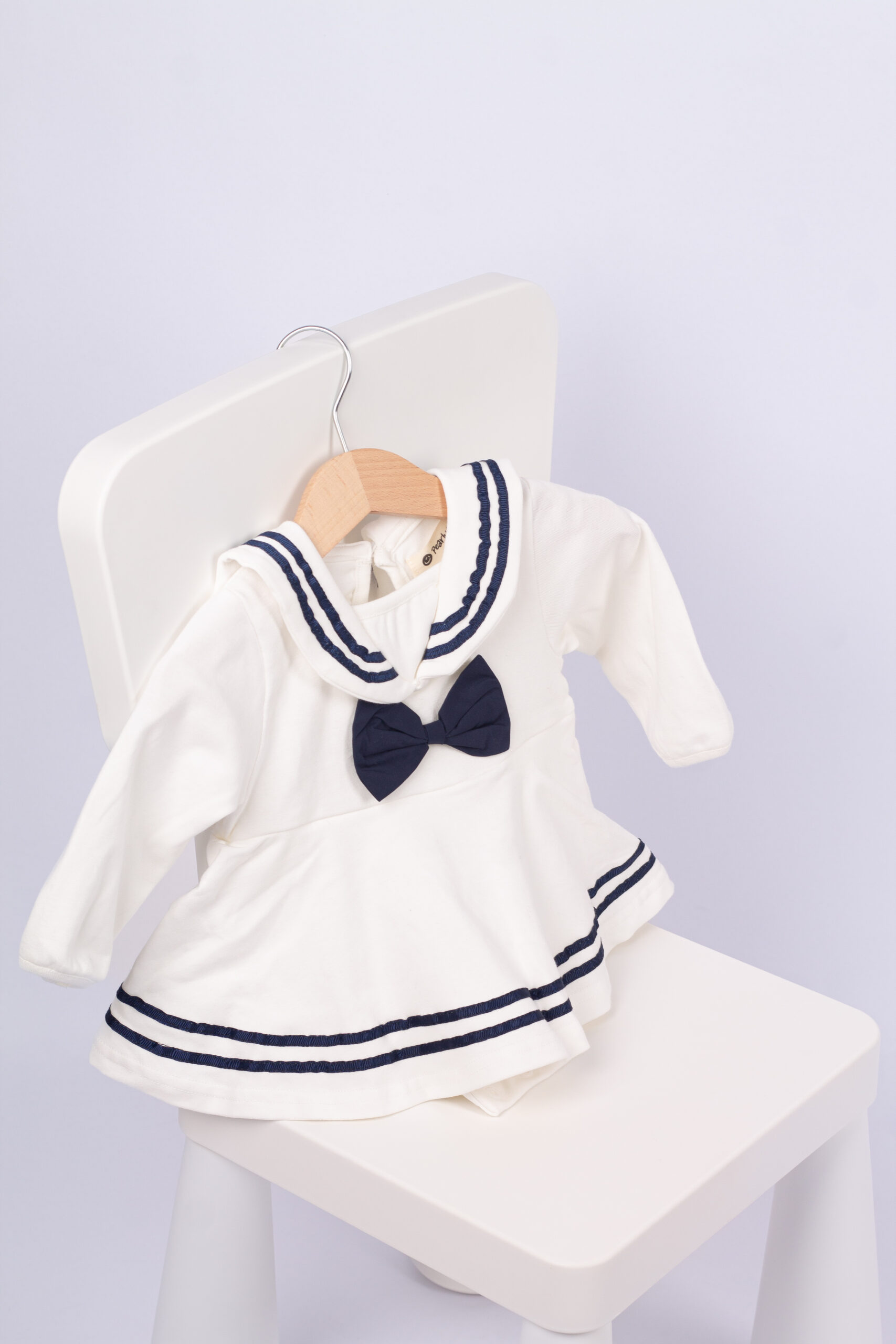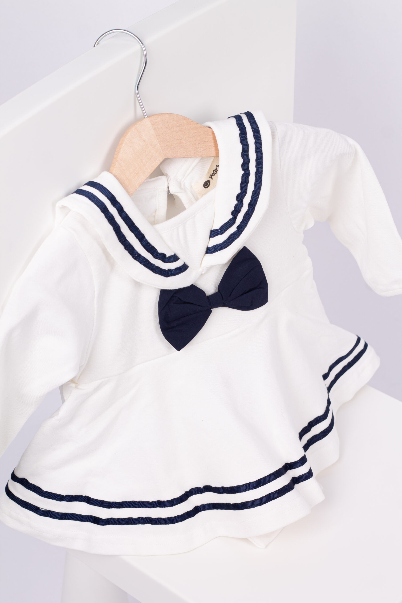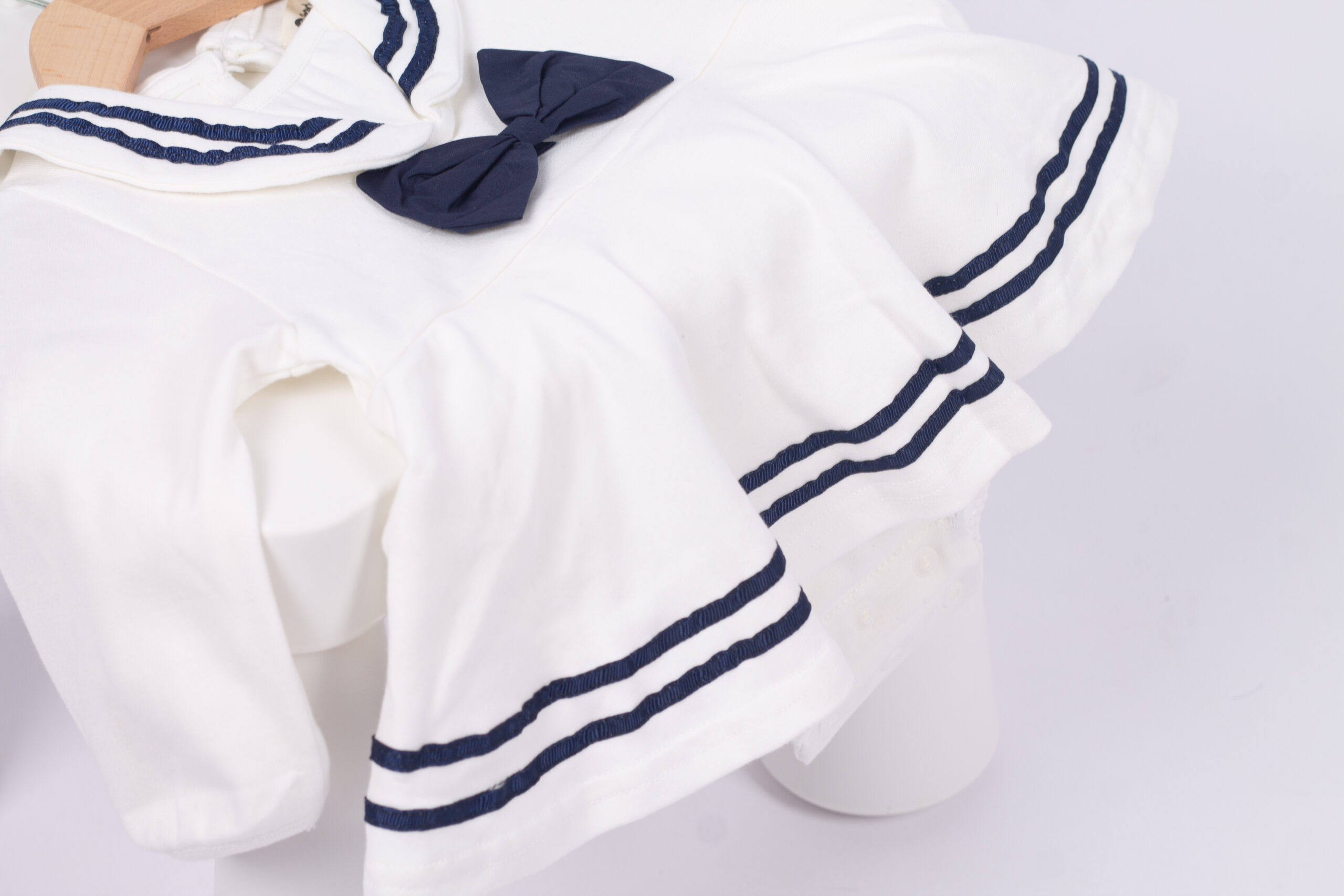 طقم سيلور أنيق بتفاصيل بحرية ناعمة ولمسة كلاسيكية راقية. يأتي بياقة السيلور المميزة المزينة بخطوط كحليّة، مع فيونكة أمامية تضيف لمسة لطافة ملفتة. القماش مريح وناعم على البشرة، والتصميم يعطي إطلالة مرتّبة وجميلة تناسب الخروج والتصوير والمناسبات. قطعة تجمع بين البساطة والفخامة في آن واحد.